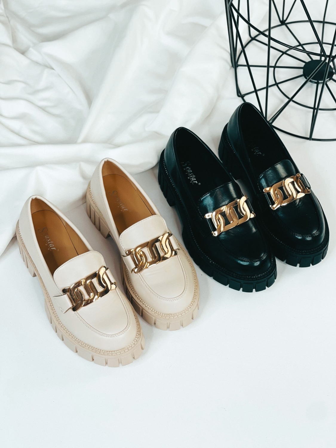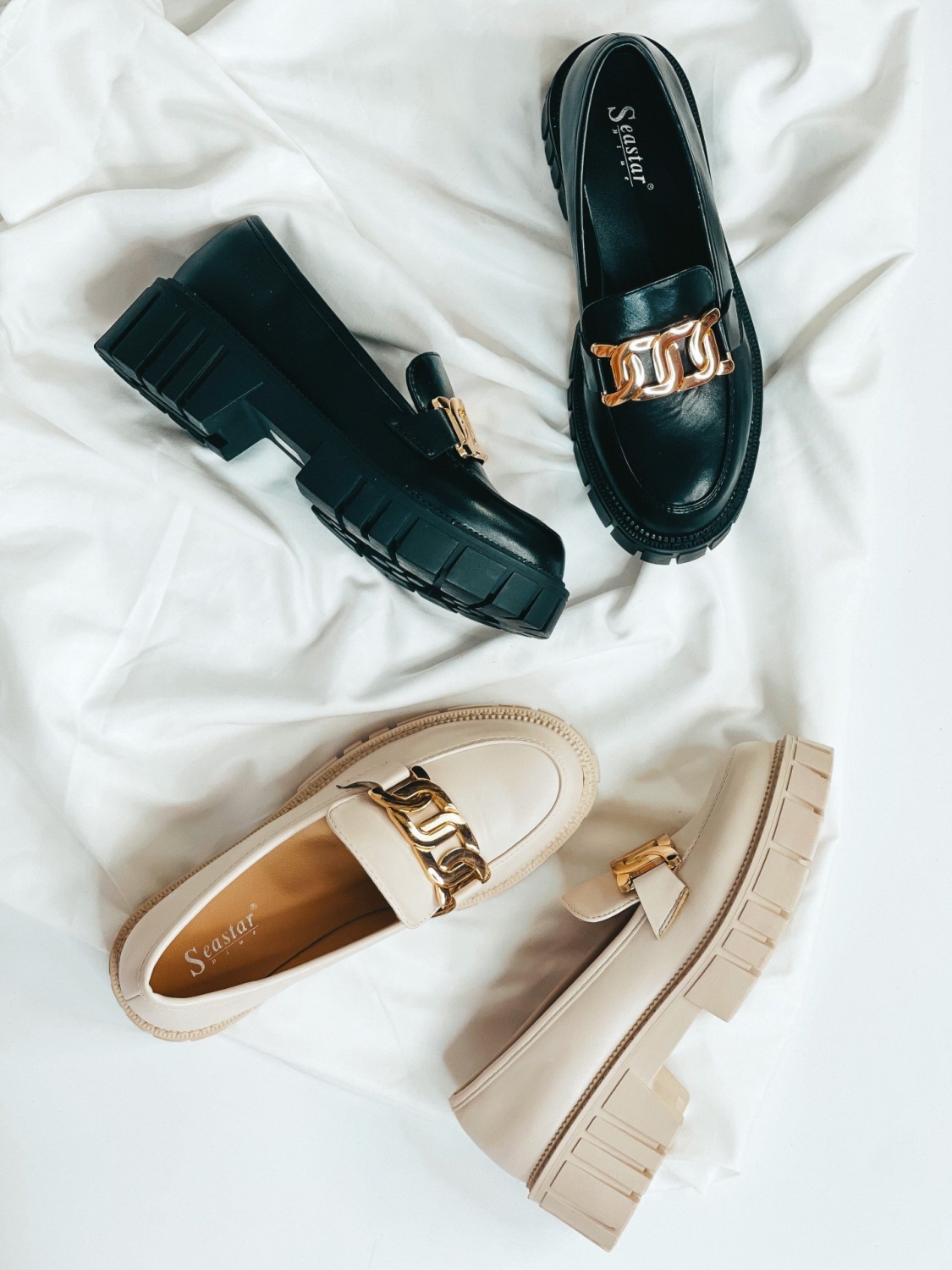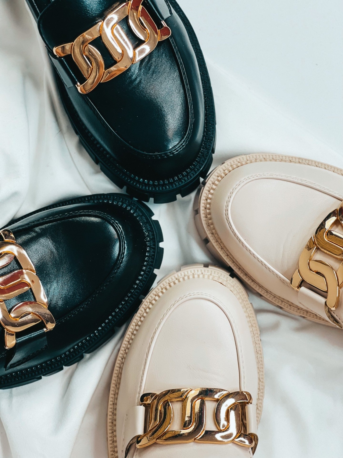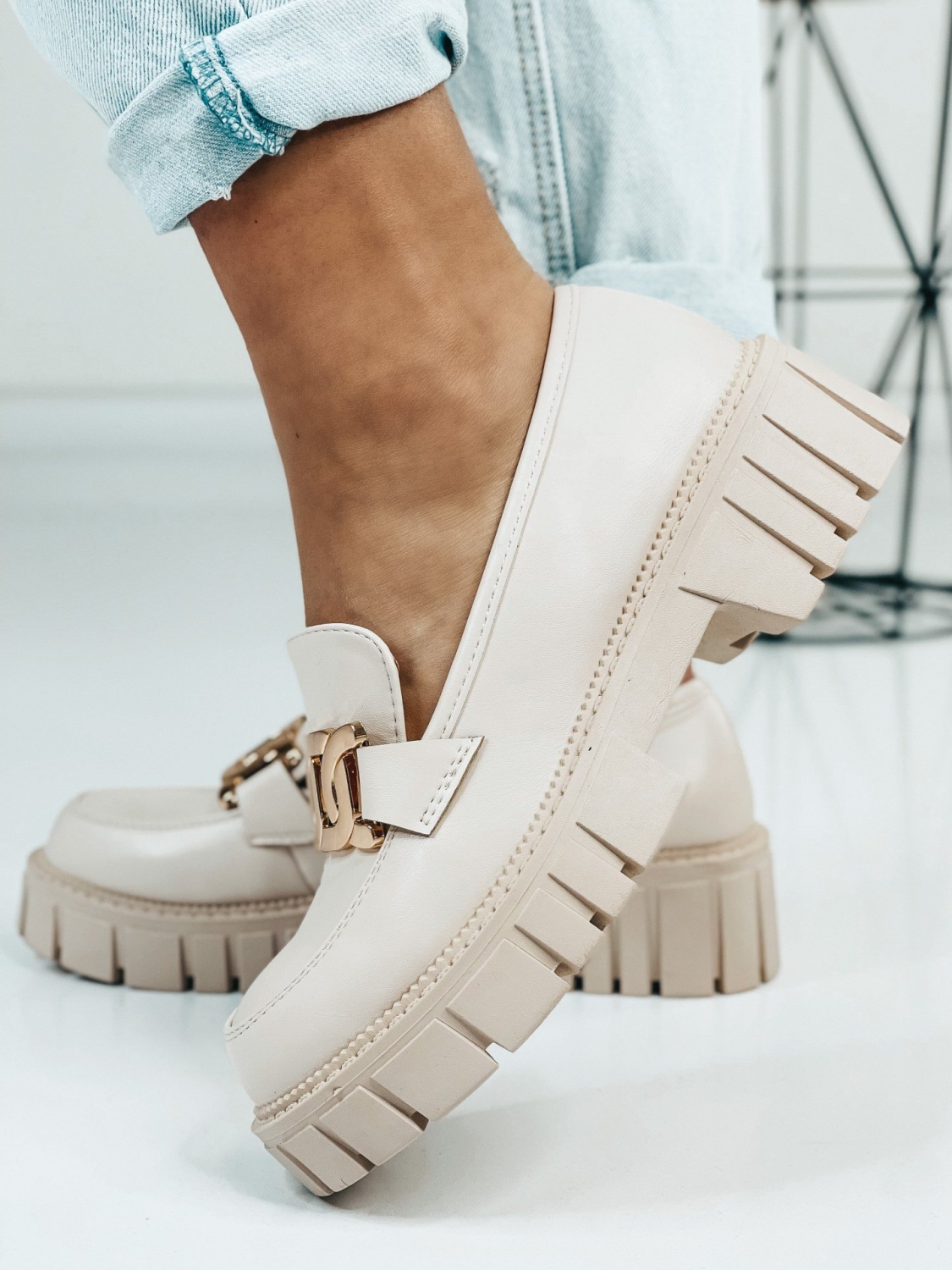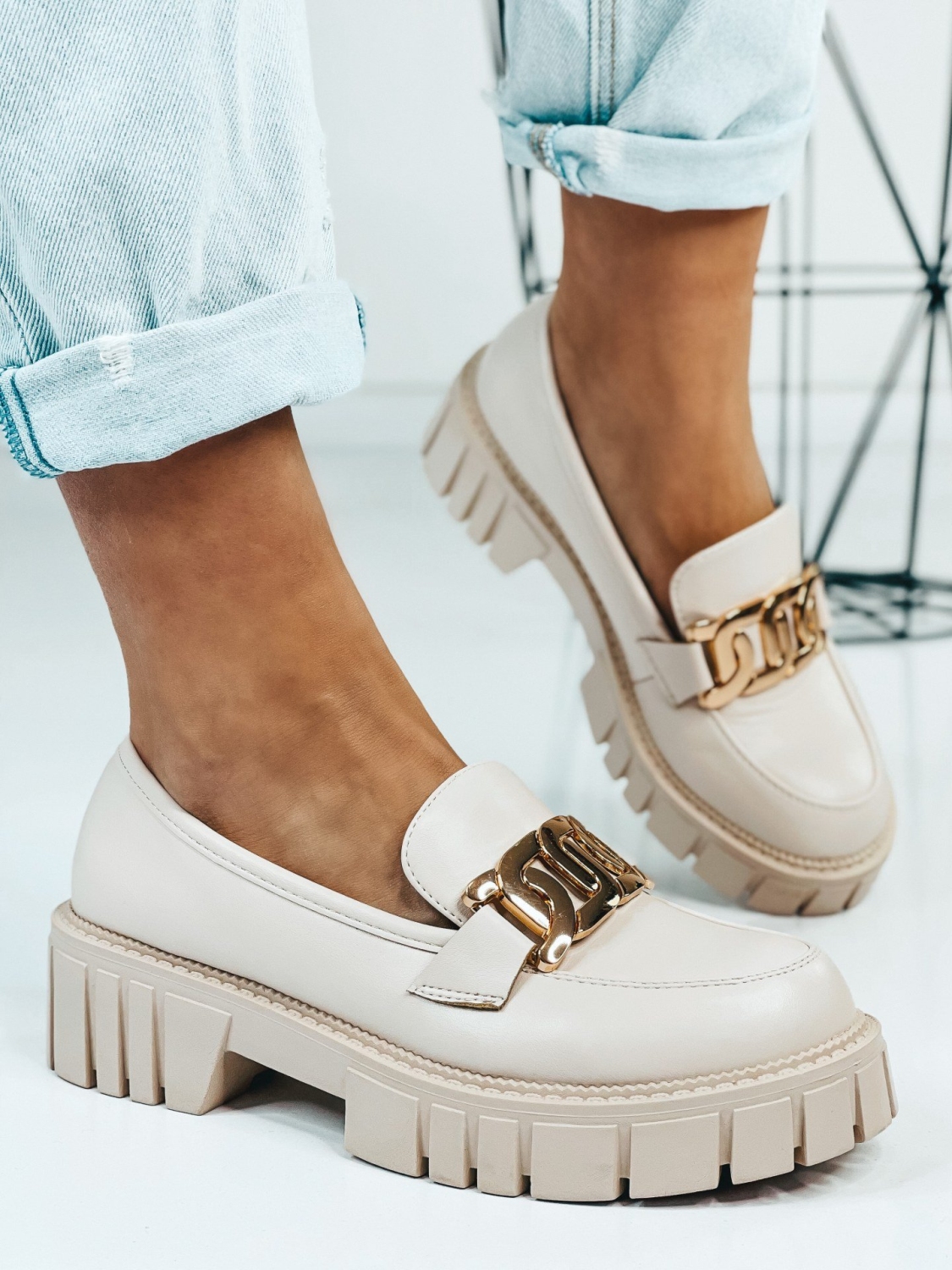 Dámske béžové mokasíny so zlatou reťazou, ktoré Vám túto sezónu nesmú chýbať. Zvršok mokasín je matného materiálu. Mokasíny, ktoré sú na platforme sú veľmi elegantnou a zároveň pohodlnou voľbou. Ak chcete získať trochu na výške, zvoľte si tieto mokasíny. Budú sa Vám skvelo hodiť k obyčajnej blúzke, ale aj k množstvo iným outfitom.
