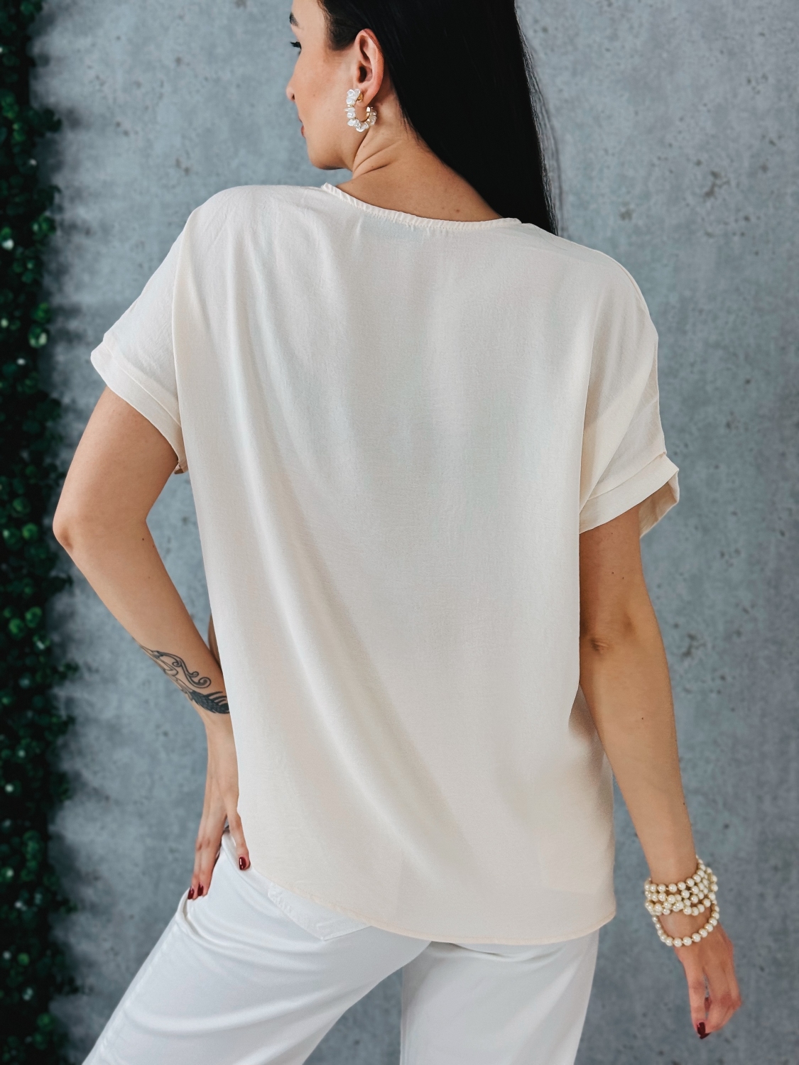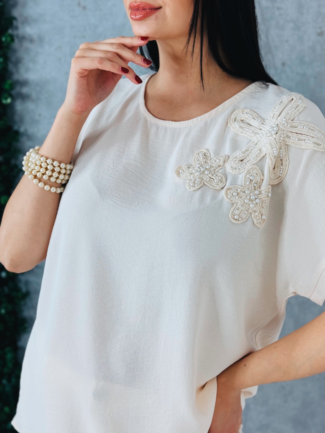 Toto dámske tričko predstavuje dokonalé spojenie minimalizmu a jemnej elegancie. Je navrhnuté pre ženy, ktoré uprednostňujú čisté línie, no zároveň si potrpia na detail, ktorý dodáva outfitu jedinečný charakter. Dominantným prvkom je precízne spracovaná kvetinová aplikácia umiestnená na ramene, ktorá pôsobí veľmi vkusne a sofistikovane. Vďaka tomuto detailu sa z jednoduchého trička stáva výrazný módny kúsok vhodný nielen na bežné nosenie, ale aj na spoločenské príležitosti. Voľnejší strih zabezpečuje pohodlie počas celého dňa a zároveň lichotí rôznym typom postavy. Krátke rukávy a ľahký, vzdušný materiál robia z tohto modelu ideálnu voľbu na teplejšie dni. Materiál je príjemný na dotyk a zaručuje komfort aj pri celodennom nosení. Tričko je veľmi ľahko kombinovateľné. Výborne sa hodí k elegantným nohaviciam, sukni aj k ležérnym rifliam. V kombinácii so sakom vytvorí upravený a moderný outfit vhodný aj do práce či na stretnutie.
