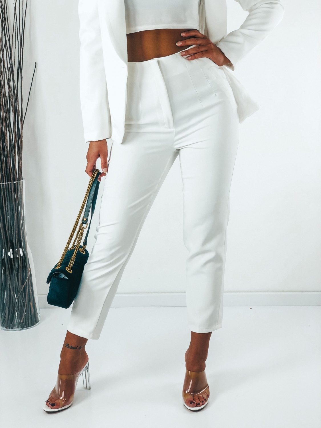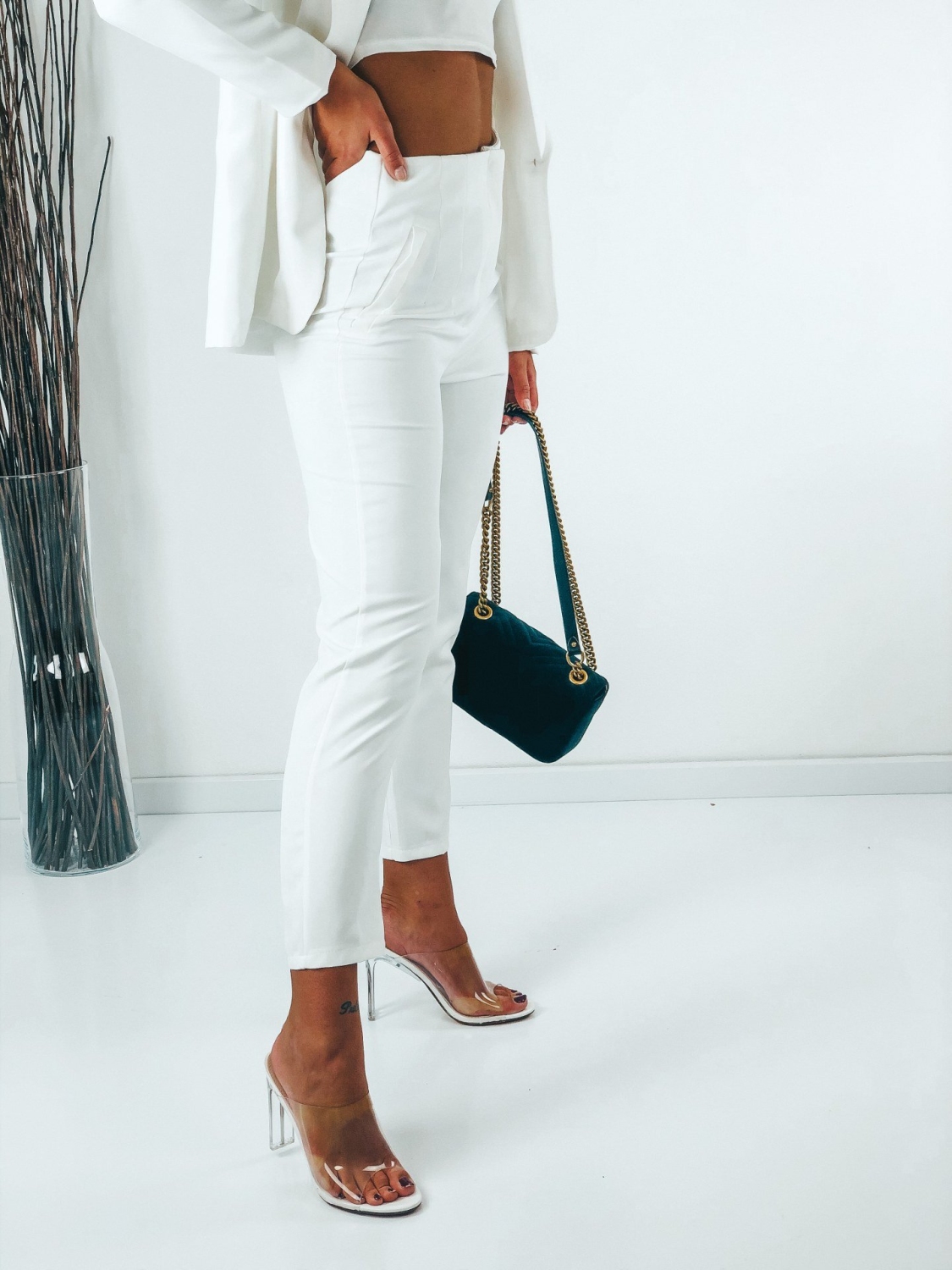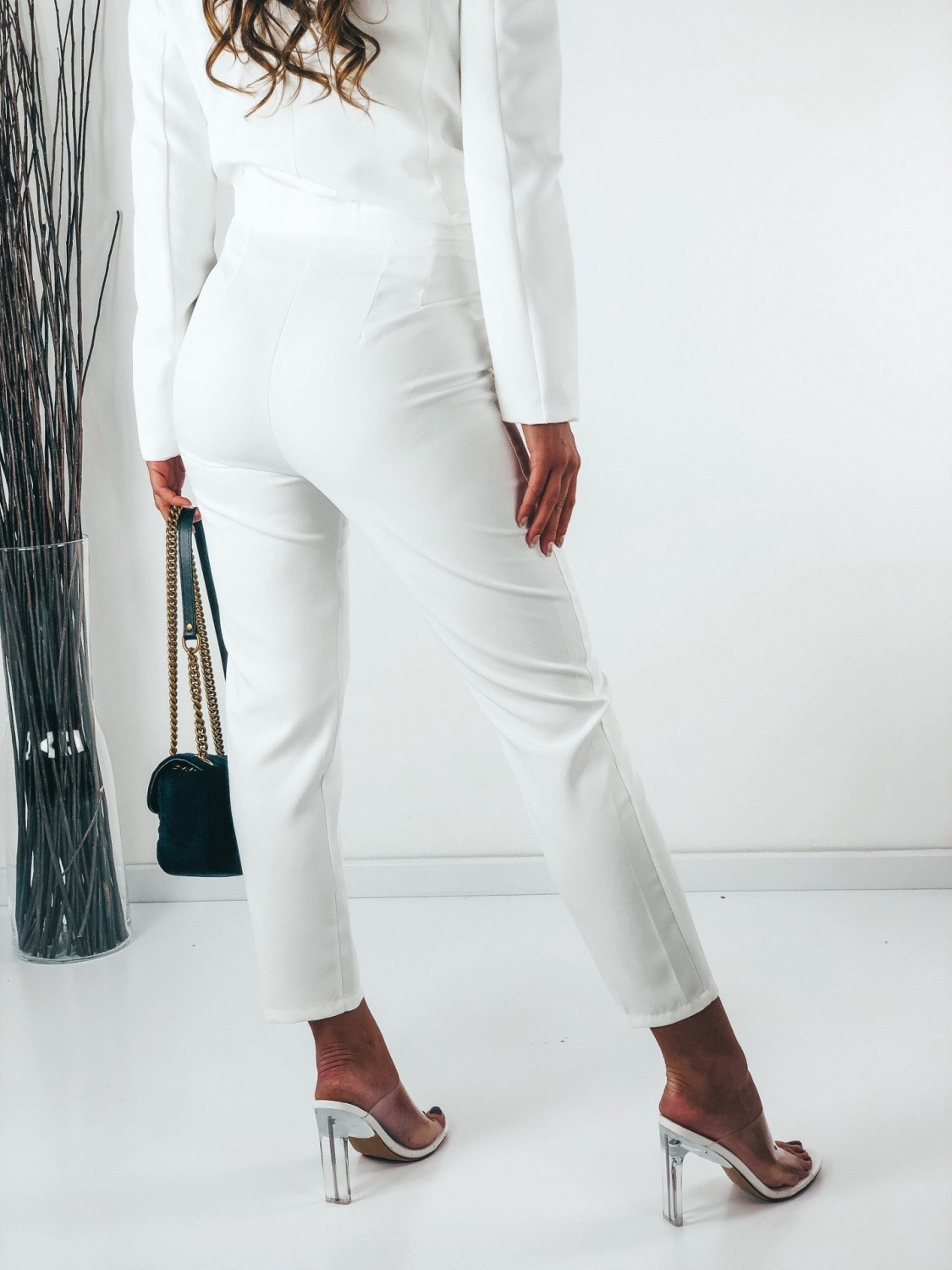 Dámske biele elegantné nohavice s vysokým pásom. Nohavice, ktoré nesmú chýbať žiadnej správnej nákupnej maniačke v šatníku. Zapínanie na gombík a zips. Na oboch stranách nohavíc sú falošené vrecká. V týchto nohaviciach sa budete cítiť veľmi pohodlne. Obujte si k nim tenisky alebo aj sandálky, dolaďte zvyšok outfitu a vyrazte v trendy kúsku kamkoľvek, nikdy nič nepokazíte. Modelka je vysoká 173 cm a má oblečenú veľkosť S.