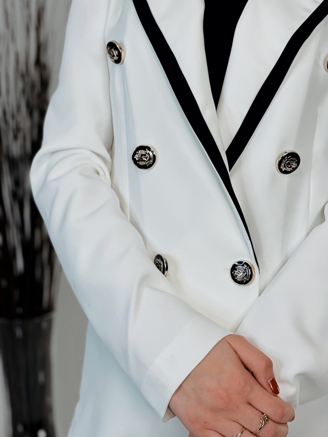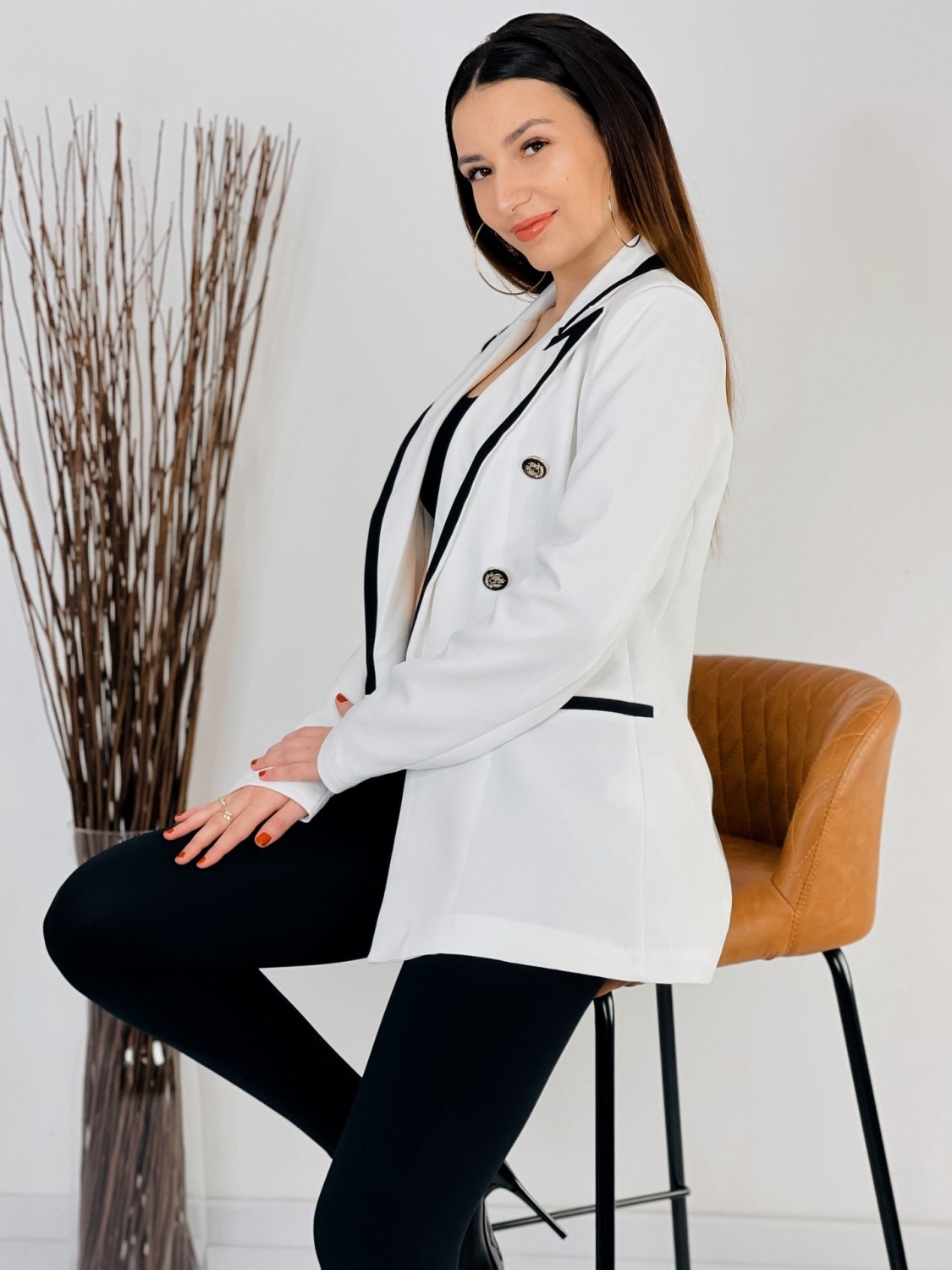 Dámske sako ležérného strihu s dvojradovým zapínaním a zlatými gombíkmi. Je ušité z mierne elastického materiálu, ktorý sa prispôsobí každej postave. Elegantné dámske sako v bielej farbe, ktoré sa v strede zapína na gombíky. Sako vhodné do práce i na rande v meste. Skvelé doplní outfit. Modelka je vysoká 168 cm a oblečenú má veľkosť S.
