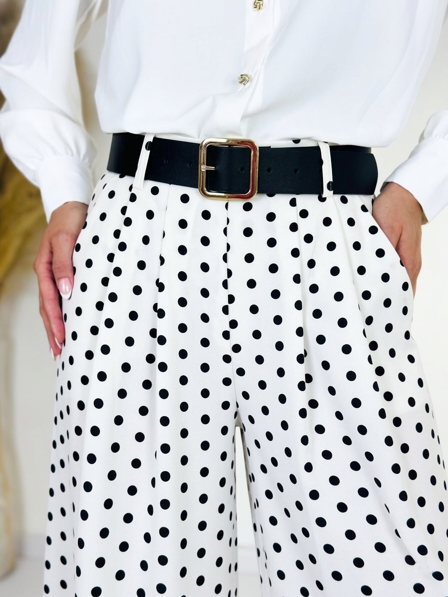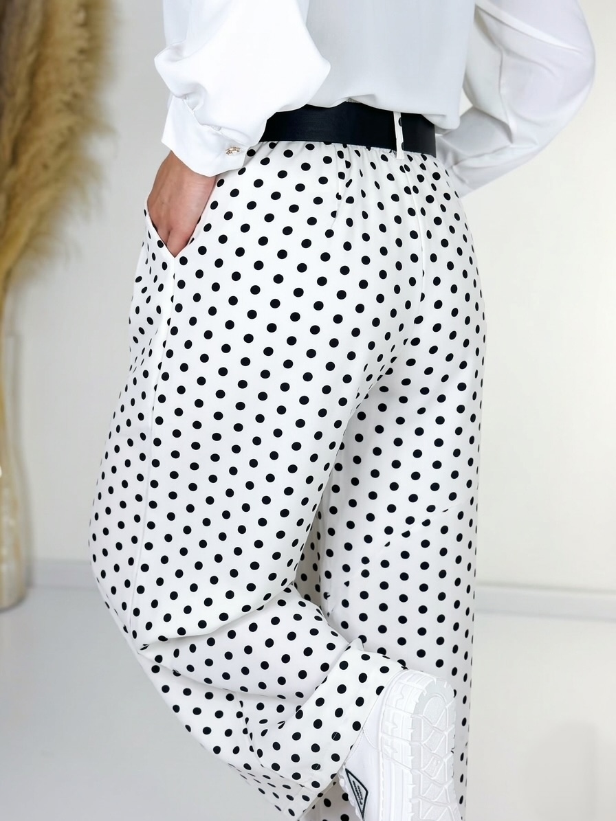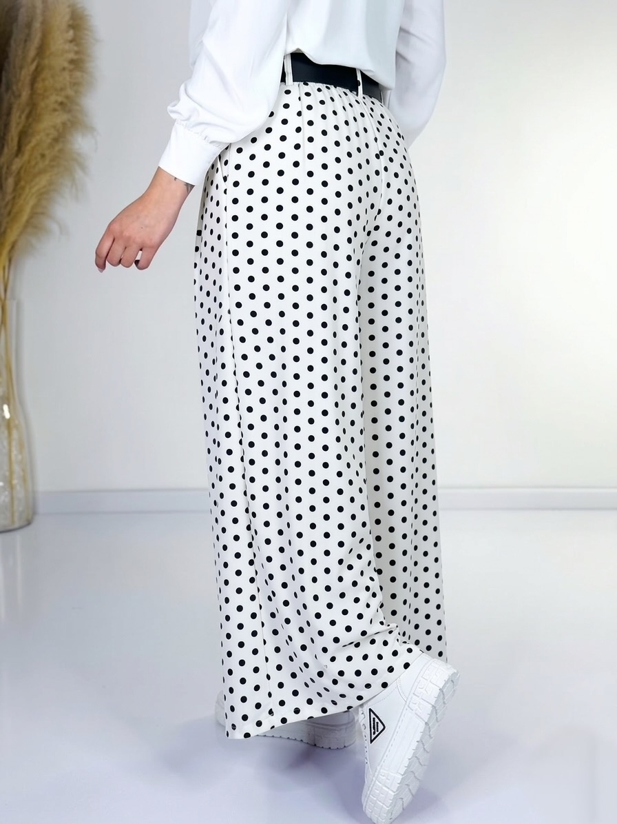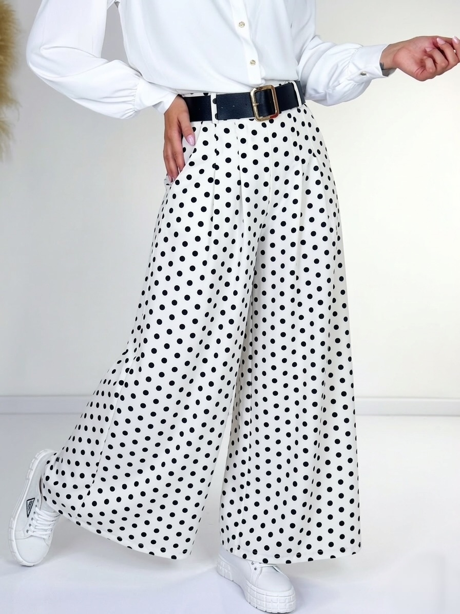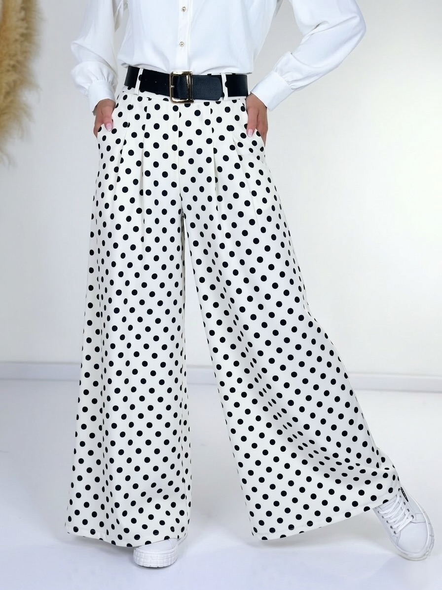 Dámske široké nohavice na bodky s vysokým pásom a opaskom, vytvárajú nádherný efekt štíhleho pásu a zároveň zaručujú maximálny komfort. Elastický pás na nohaviciach umožňuje ich prispôsobenie podľa potreby, čím poskytuje perfektné pohodlie po celý deň. Tieto nohavice nielen skvele sedia, ale aj nádherne lichotia postave. Vrecká na oboch stranách pridávajú praktický aj štýlový detail. S univerzálnou veľkosťou (UNI) sú vhodné pre rôzne typy postáv a sadnú na veľkoti S, M, L aj XL. Stačí si obuť tenisky, alebo lodičky, či mokasíny, pridať pár módnych doplnkov a máte outfit, ktorý je ideálny na každú príležitosť. Oblečte sa do pohodlia a štýlau a nechajte sa očariť týmto trendy kúskom. Modelka má výšku 175 cm a má oblečenú veľkosť UNI.