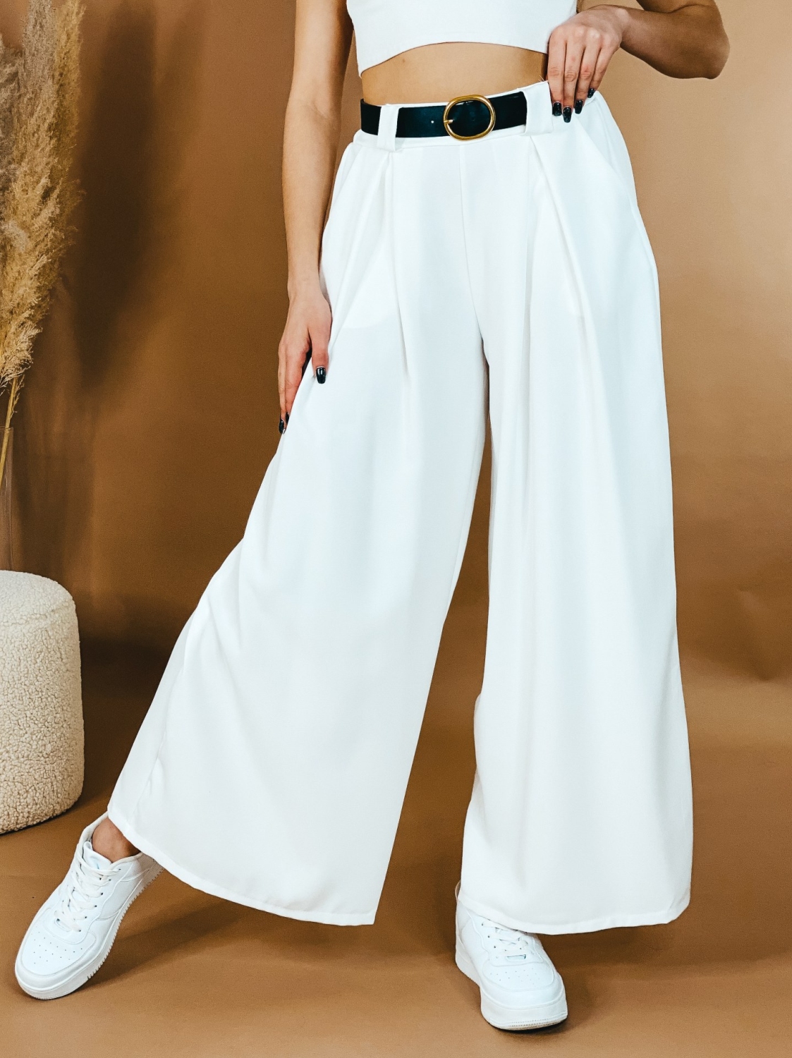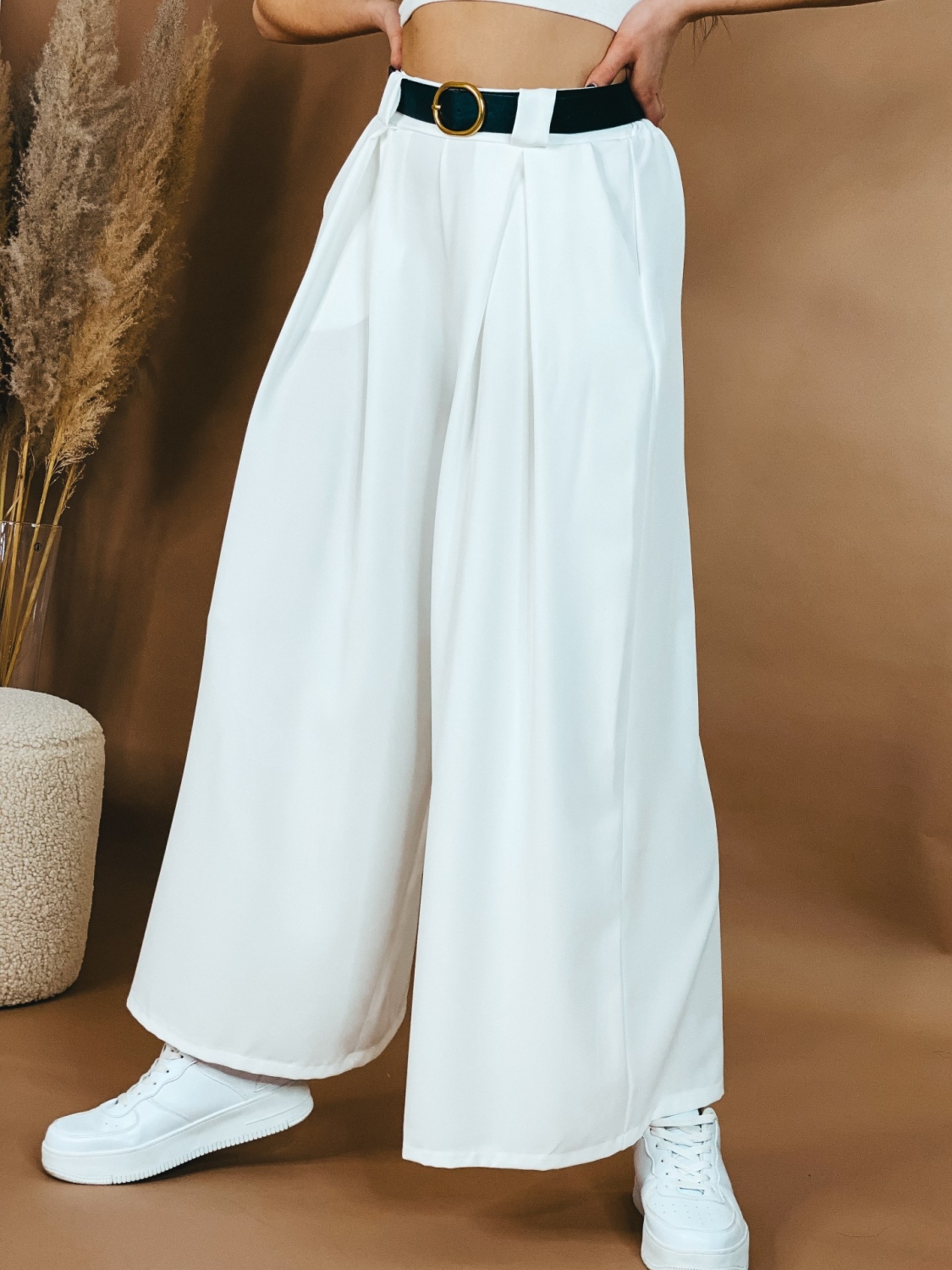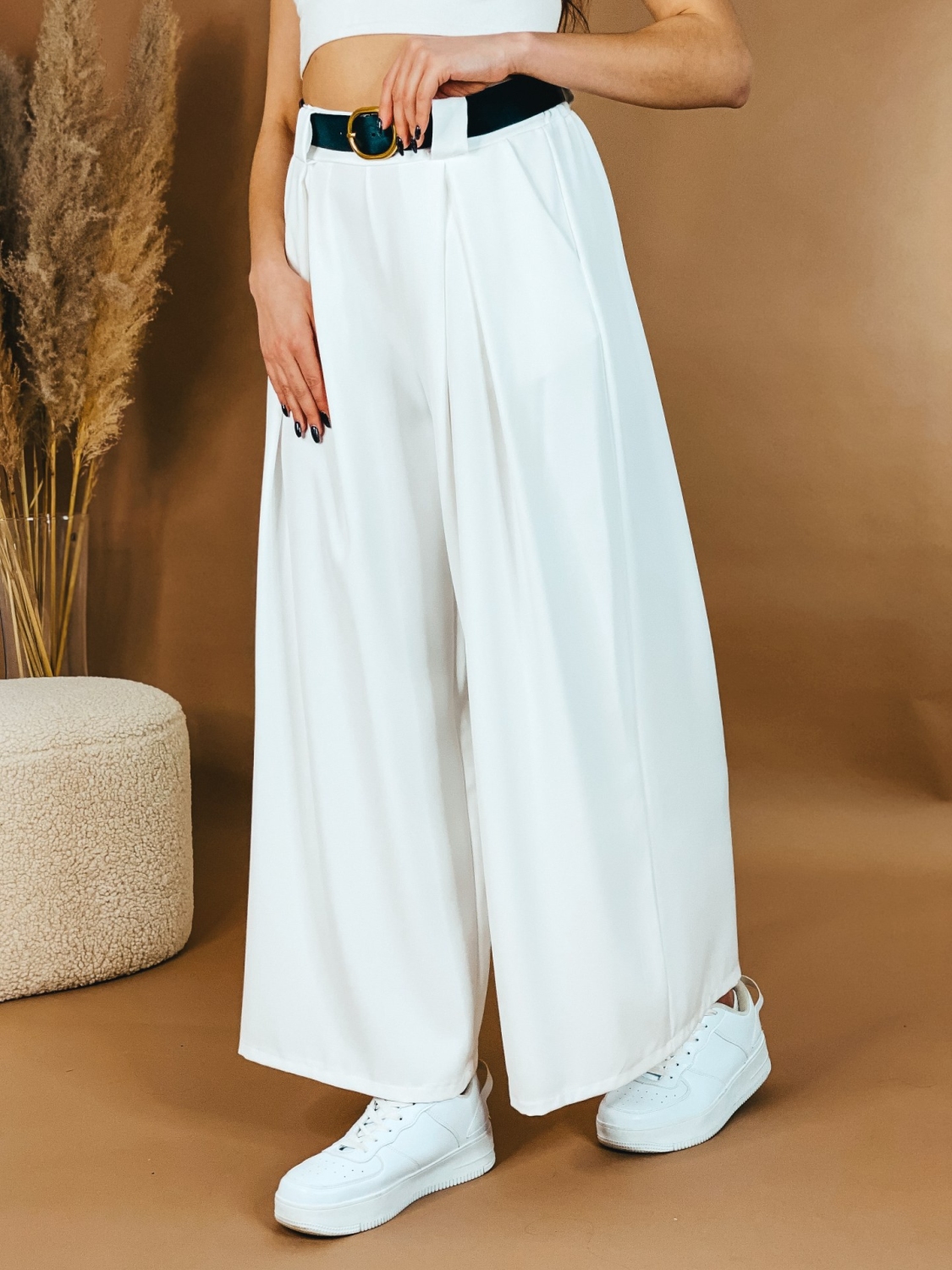 Dámske široké nohavice s vysokým pásom, ktoré sú v spodnej časti rozšírené. Perfektný efekt štíhleho pásu. Pás je pružný. Vzadu gumička. Nohavice si prispôsobite aj vďaka opasku. Pohodlný strih si okmažite zamilujete. Ihneď zalichotia Vašej postave. Bez zapínania. Obujte si k nim tenisky, dolaďte zvyšok outfitu a vyrazte v trendy kúsku kamkoľvek, nikdy nič nepokazíte. Vrecká na oboch stranách. Modelka je vysoká 170 cm a má oblečenú veľkosť UNI.
