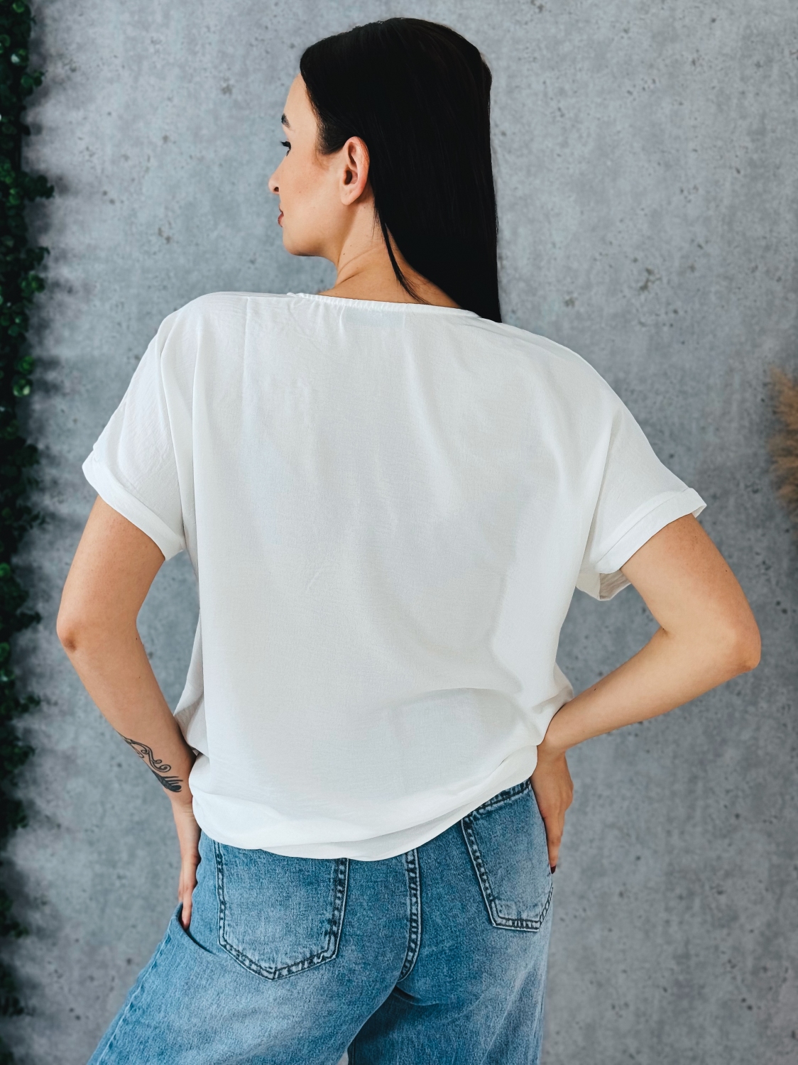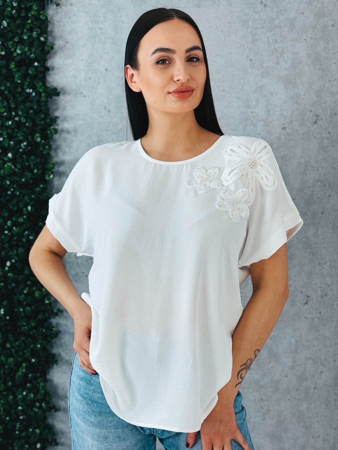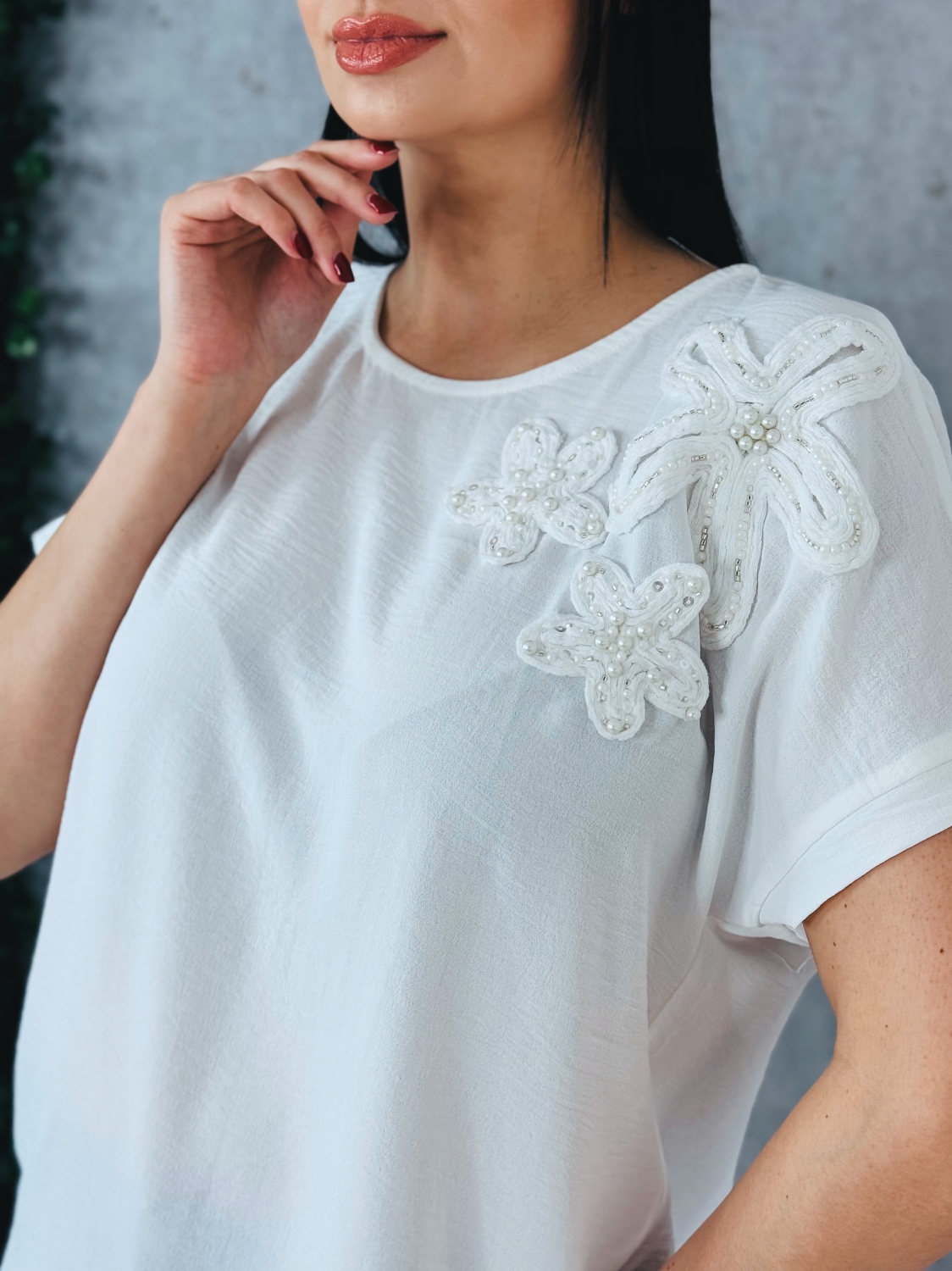 Toto dámske tričko predstavuje dokonalé spojenie minimalizmu a jemnej elegancie. Je navrhnuté pre ženy, ktoré uprednostňujú čisté línie, no zároveň si potrpia na detail, ktorý dodáva outfitu jedinečný charakter. Dominantným prvkom je precízne spracovaná kvetinová aplikácia umiestnená na ramene, ktorá pôsobí veľmi vkusne a sofistikovane. Vďaka tomuto detailu sa z jednoduchého trička stáva výrazný módny kúsok vhodný nielen na bežné nosenie, ale aj na spoločenské príležitosti. Voľnejší strih zabezpečuje pohodlie počas celého dňa a zároveň lichotí rôznym typom postavy. Krátke rukávy a ľahký, vzdušný materiál robia z tohto modelu ideálnu voľbu na teplejšie dni. Materiál je príjemný na dotyk a zaručuje komfort aj pri celodennom nosení. Tričko je veľmi ľahko kombinovateľné. Výborne sa hodí k elegantným nohaviciam, sukni aj k ležérnym rifliam. V kombinácii so sakom vytvorí upravený a moderný outfit vhodný aj do práce či na stretnutie.