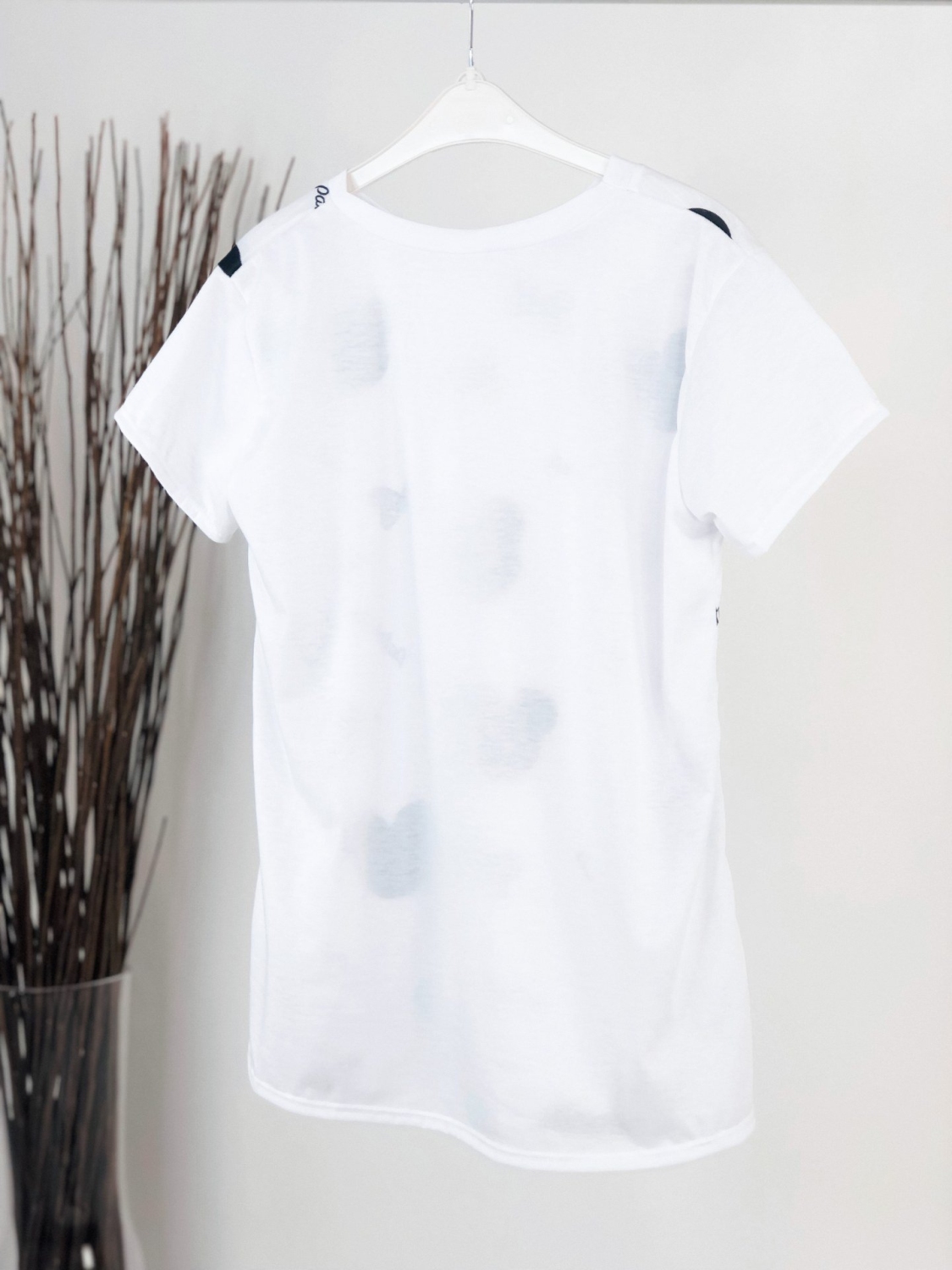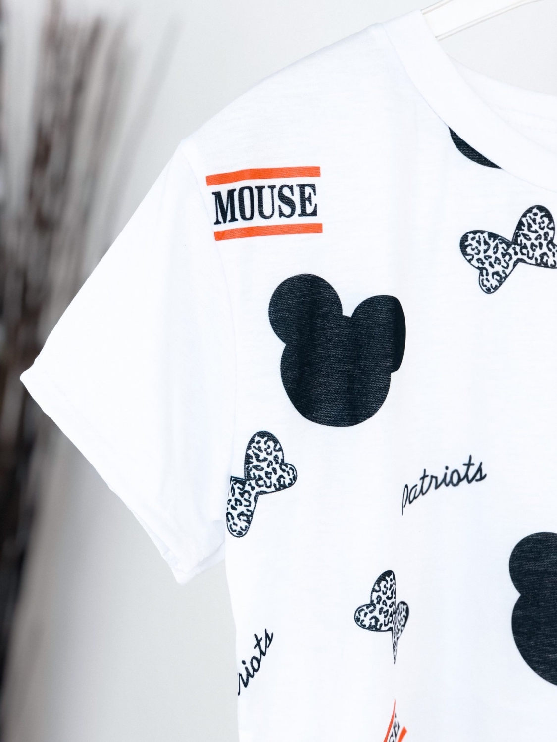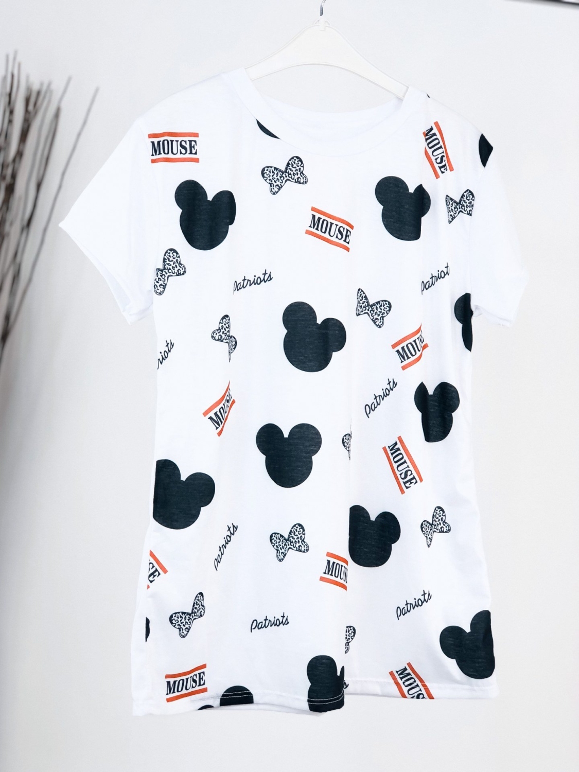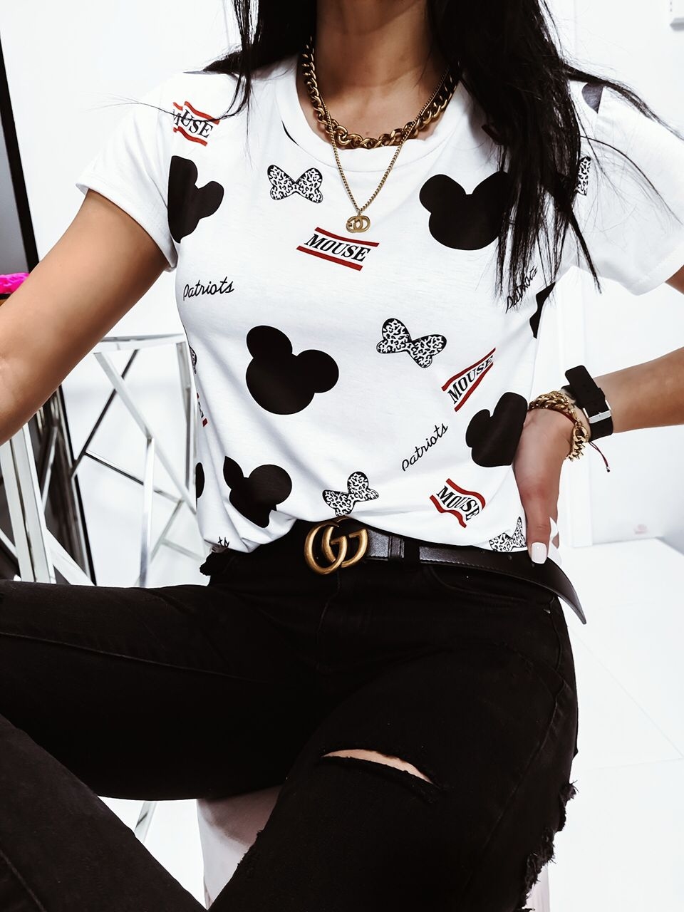 Dámske zaujímavé biele elastické tričko, ktoré je potlačené čiernym mickey mouse vzorom. Krátky rukáv a príjemný prievzdušný materiál. Ľahko kombinovateľné vhodné na bežné noseniey. Kúsok, ktorý Vás nikdy neomrzí. Štýlovo doplníte svoj outfit. Univerzálny a trendy kúsok. Modelka je vysoká 172 cm a oblečenú má veľkosť UNI. Veľkostne sadne na XS, S a M.