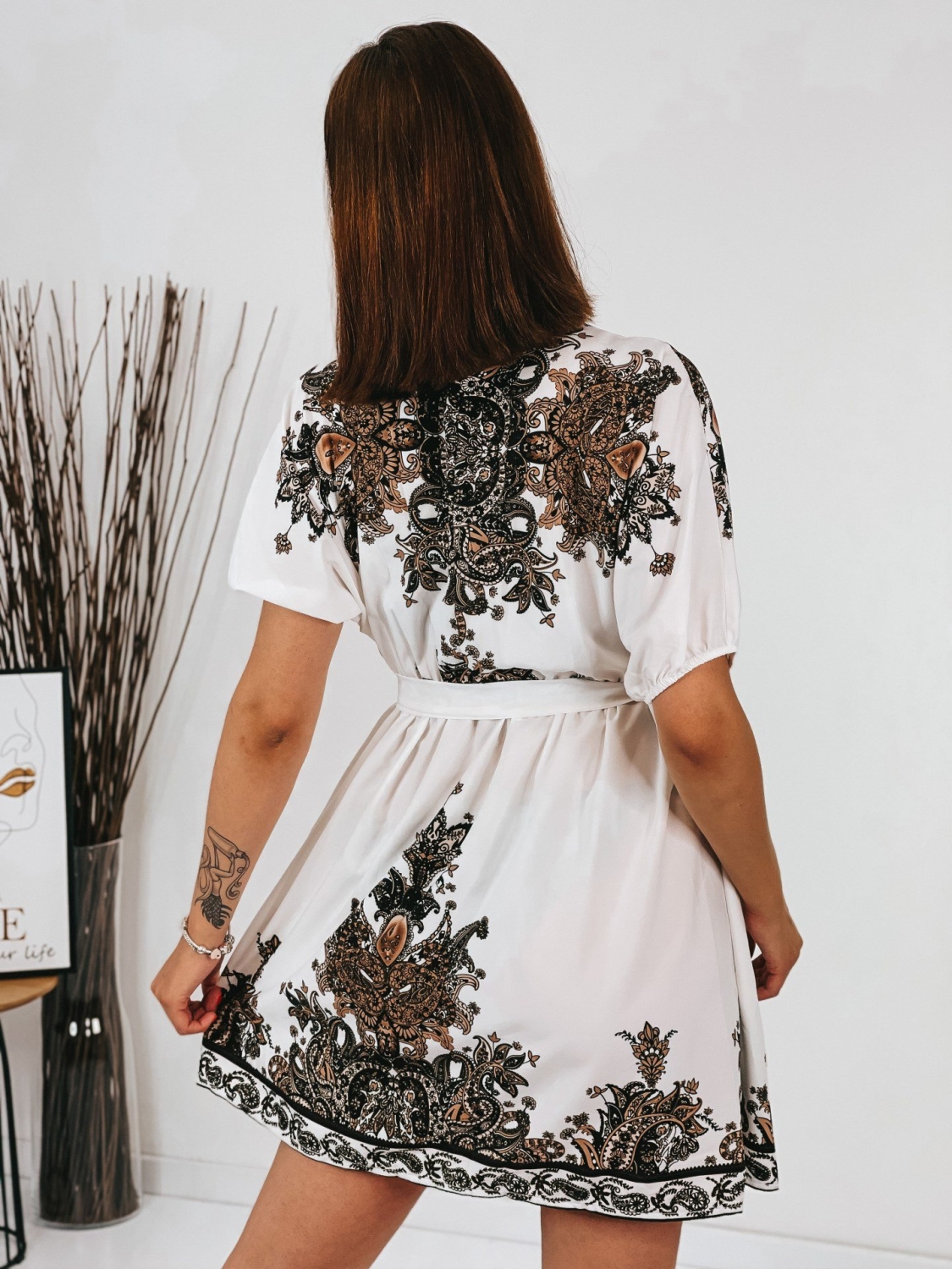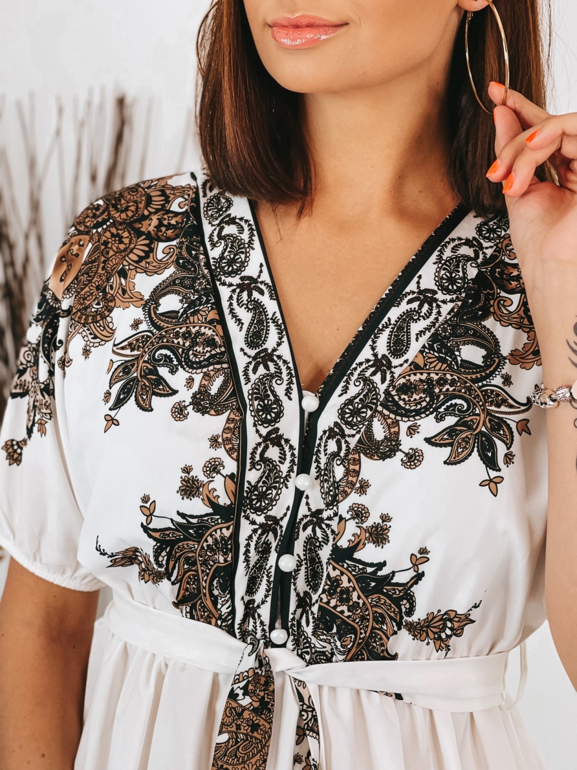 Exkluzívny kúsok dámskych bielo-hnedých šiat s krátkym rukávom a véčkovým výstrihom. Šaty sú doplnené opaskom, ktorý si prispôsobíte podľa vlastného vkusu. Veľmi kvalitný a príjemný materiál na dotyk potlačený folklórnym motívom. Zaujímavý strih šiat dostane každú správnu nákupnú maniačku. V prednej časti gombíky na zapínanie. Pohodlné a praktické na každodenné nosenie, ale kľudne aj na spoločenské udalosti. Originálna potlač. Čas kedy sa chcete cítiť neobyčajne krásna, obdivovaná, jedinečná a nezabudnuteľná. Modelka je vysoká 175 cm a oblečenú má veľkosť UNI.