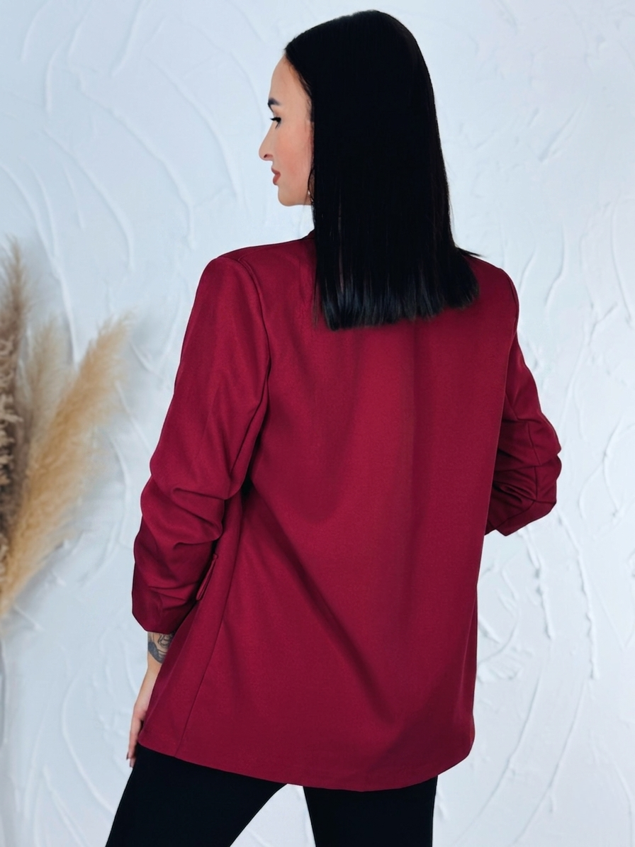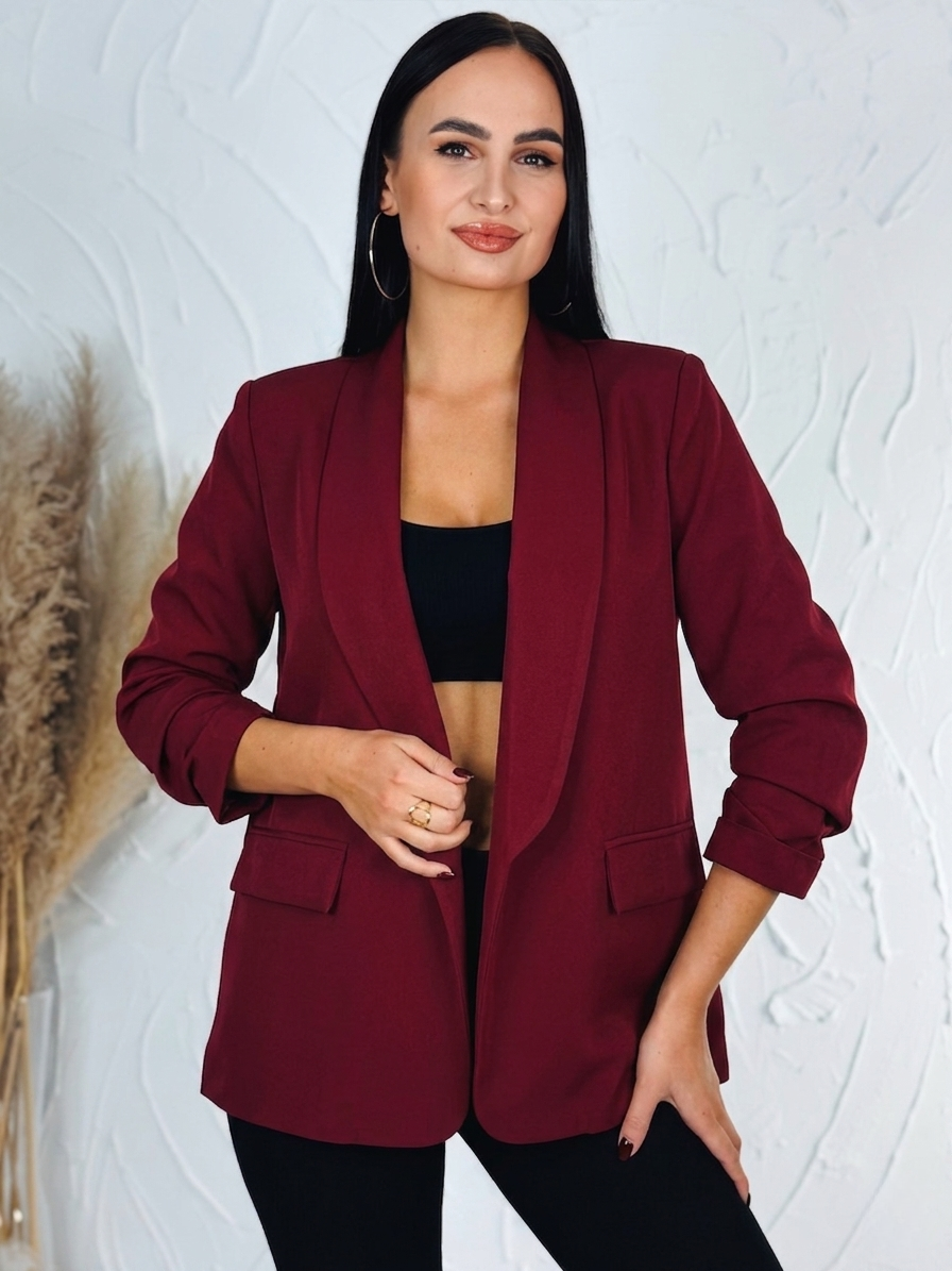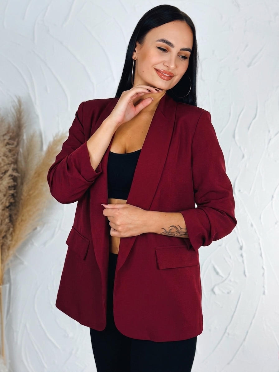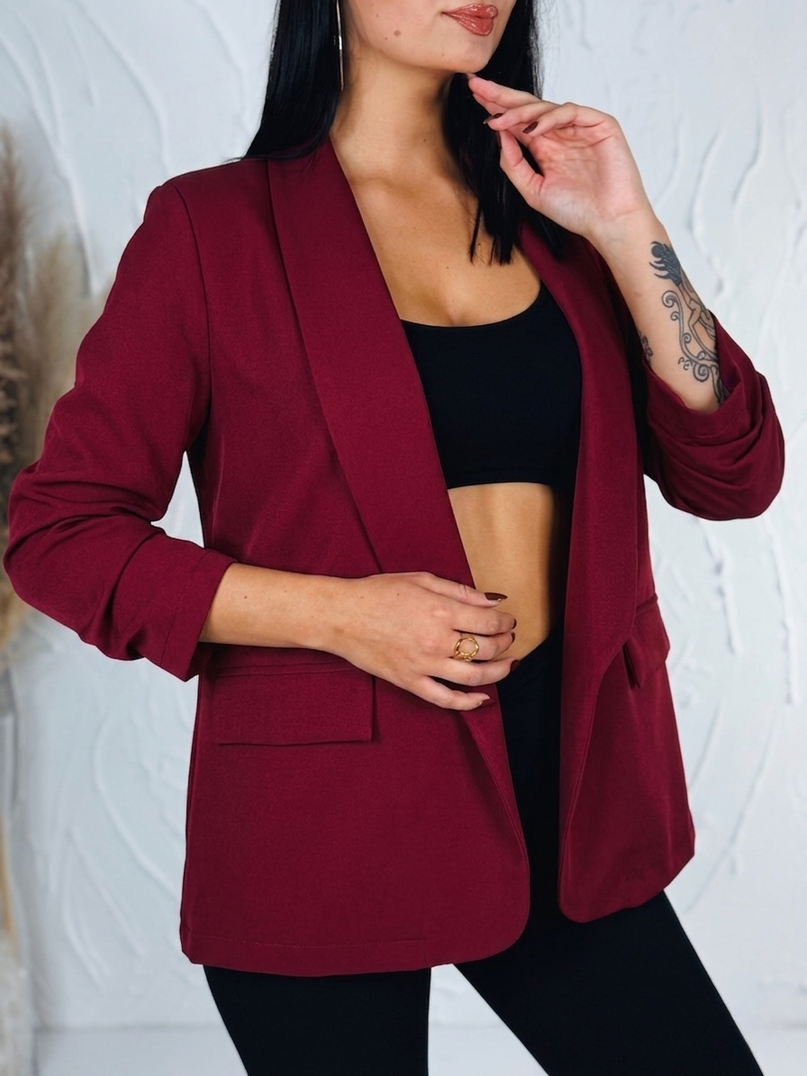 Dámske exkluzívné bordové sako, ktoré je v jednoduchom prevedení a bez zapínania. Sako vhodné do práce i na rande do mesta. Zaujímavá je aj štruktúra saka, ktorá Vás dostane. Nadčasové a mimoriadne praktické. Vyrobené z kvalitného a pohodlného materiálu. Vrecká na oboch stranách sú falošné. Dámske sako nemusíte nosiť výlučne k sukni, či elegantným nohaviciam. Môžete k nemu doladiť aj ležérny outfit s teniskami. Modelka je vysoká 175 cm a oblečenú má veľkosť UNI.