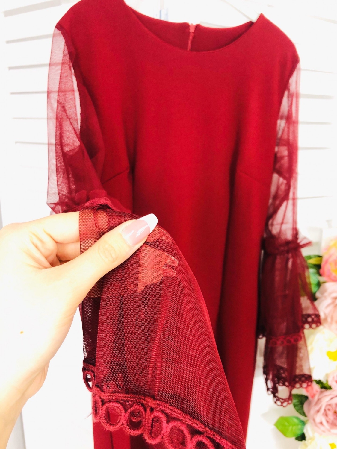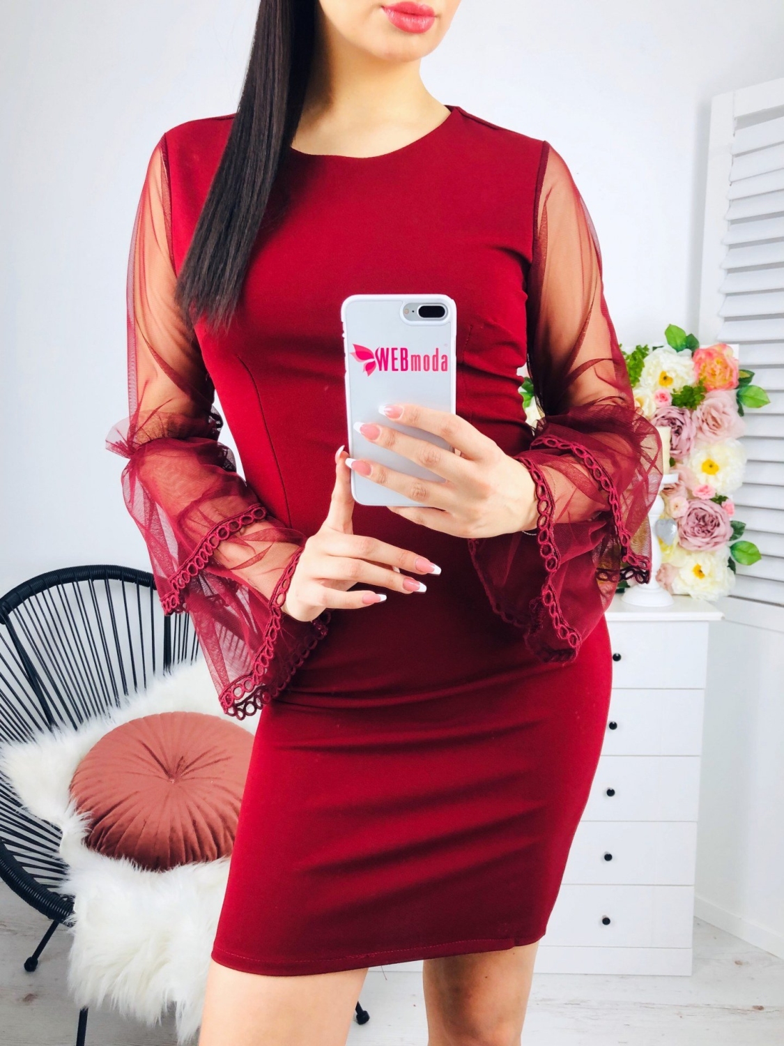 Dámske bordové spoločenské šaty, ktoré sú v zaujímavom prevedení. Originálny a jedinečný strih, vhodné na viacero príležitosti či to je svadba, stužková alebo ples. Módny kúsok pre moderné ženy. Materiál je príjemný, pohodlný a skvelo padne na postave. Spoločenské šaty majú priehľadné rukávy so zvonovým zakončením, ktoré zdobí čipka. Šaty sa zapínajú vzadu na zips. Modelka meria 175cm a má oblečenú veľkosť UNI.