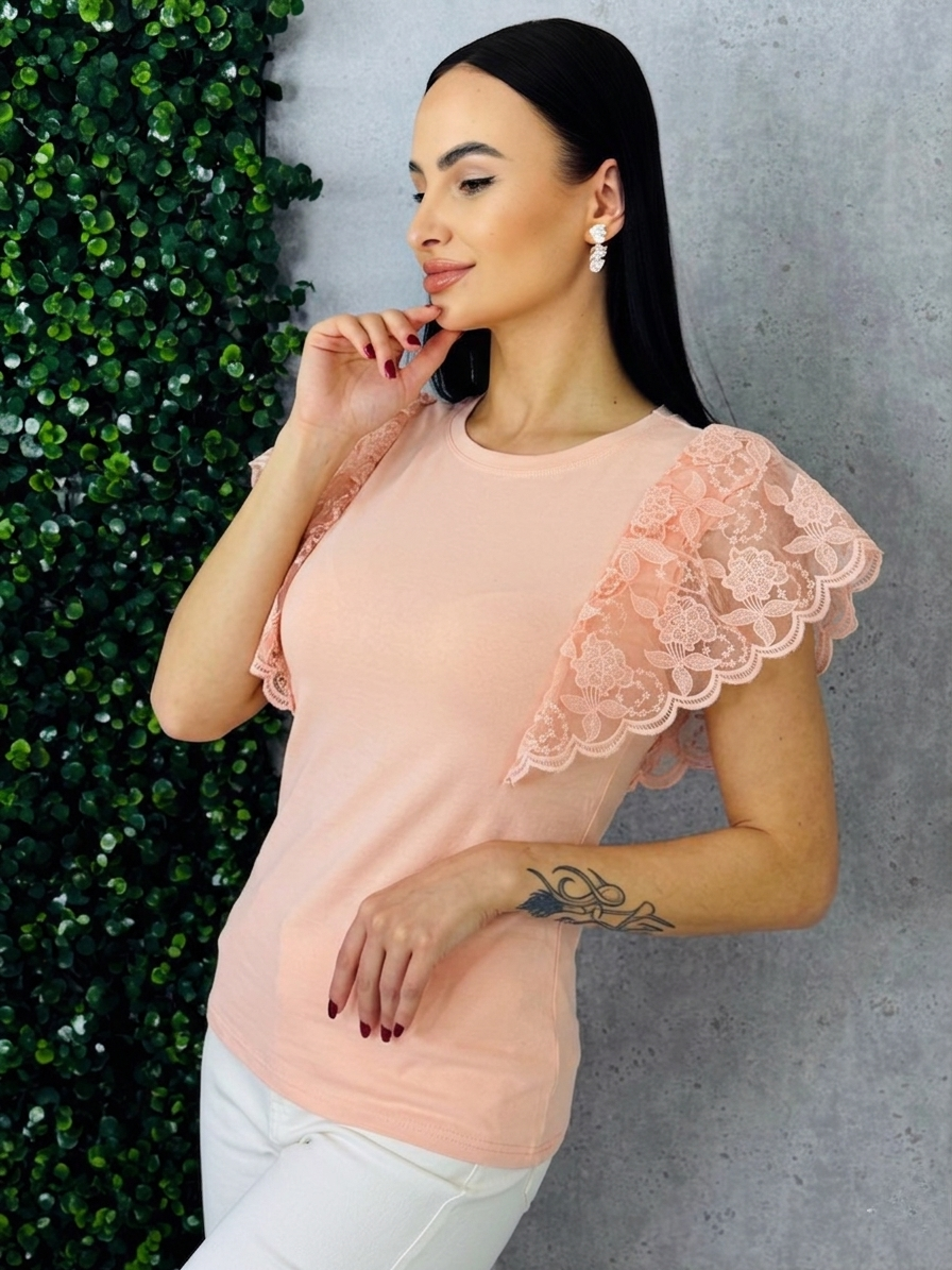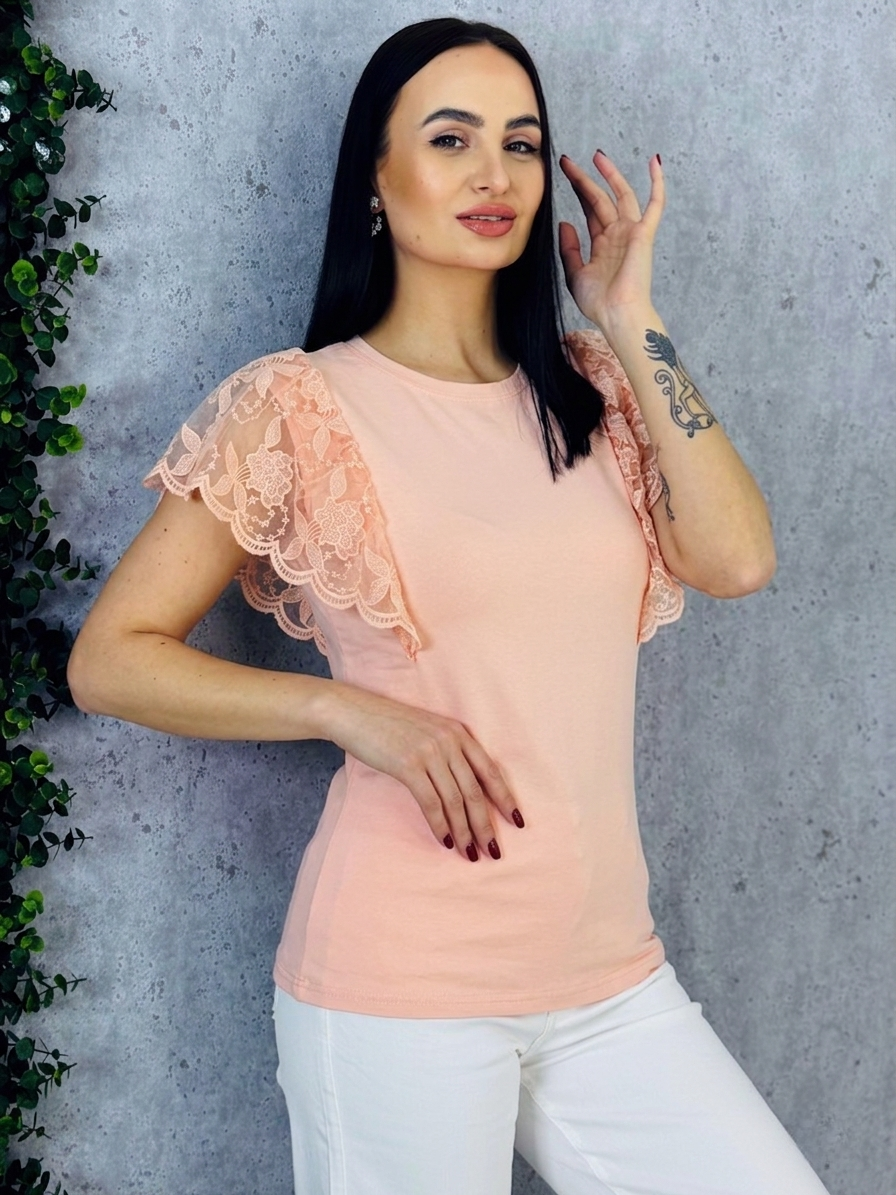 Objavte spojenie elegancie a pohodlia s týmto dámskym tričkom s čipkovanými rukávmi. Vyrobené z jemného, priedušného materiálu, ktorý sa príjemne prispôsobí každej postave, toto tričko vyniká svojím nadčasovým dizajnom a sofistikovaným detailom. Čipkové rukávy dodávajú kúsok ženskosti a romantiky, pričom jemne odhaľujú ruky a vytvárajú ľahko hravý, no elegantný vzhľad. Tričko je ideálne na kombinovanie s rôznymi outfitmi – od elegantných nohavíc a sukne až po obľúbené džínsy. Vďaka klasickému strihu a decentnému okrúhlemu výstrihu sa hodí na každodenné nosenie, do práce, na stretnutie s priateľmi alebo večerné výlety. Jeho ľahká údržba a kvalitné spracovanie zaručujú dlhú životnosť a stálu krásu materiálu aj po opakovanom praní. Toto tričko je perfektnou voľbou pre ženy, ktoré chcú byť štýlové a zároveň sa cítiť pohodlne – detailné čipkovanie dodáva jemný nádych luxusu a zaručuje, že váš outfit bude vždy pôsobiť upravene a elegantne. Vytvorte si svoj dokonalý look s týmto kúsok, ktorý kombinuje sofistikovanosť, ženskosť a praktickosť v jednom.
