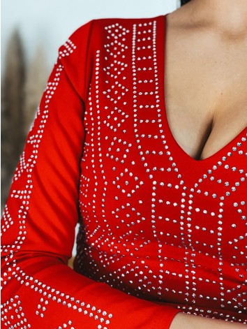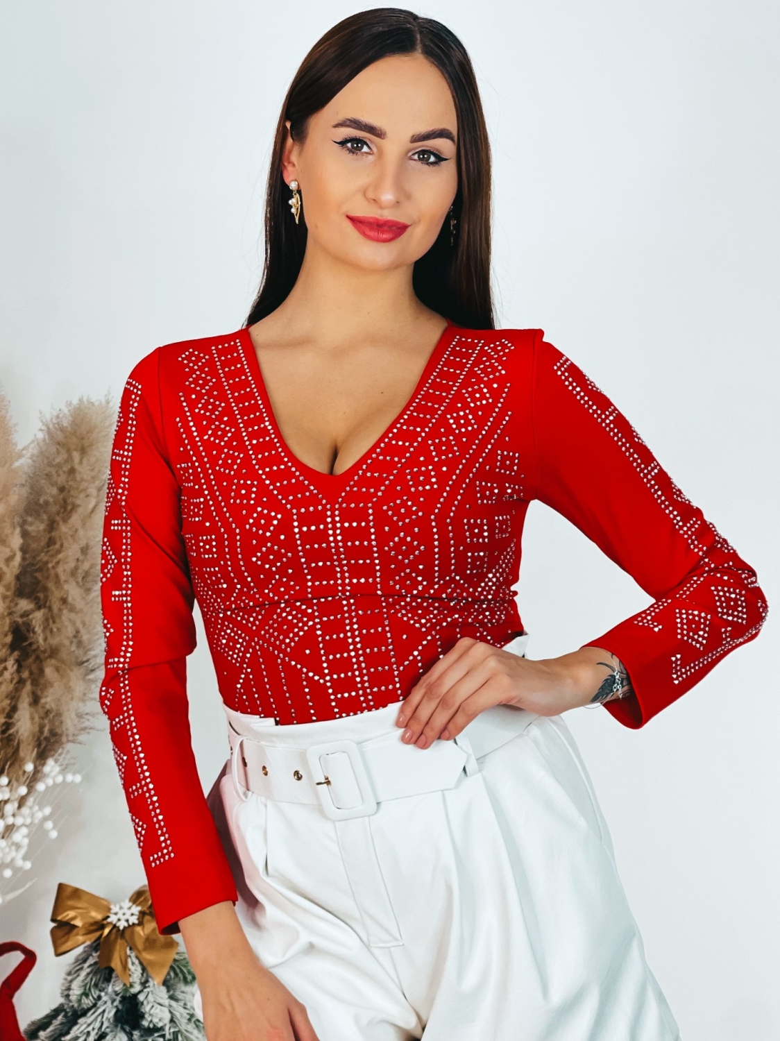 Dámske exkluzívne červené body, ktoré je doplnené ozdobnými kamienkami po celej dĺžke. Dlhý rukáv. Maximálne kvalitný a príjemný materiál, ktorý budete nosiť veľa rokov. Ľahko kombinovateľný kúsok do šatníka. Dokonale sa hodí k sukni, nohaviciam, či rifliam alebo koženkovým kraťasom. Môžete ho kombinovať podľa vlastného vkusu. Ideálny kúsok do prechodného a zimného počasia. Už pri prvom oblečení si ho okmažite zamilujete. Modelka je vysoká 175 cm a oblečenú má veľkosť UNI. Veľkostne sa prispôsobí, keďže materiál je poddajný a elastický. Túto kúpu určite neoľutujete! To Vám sľubujeme!