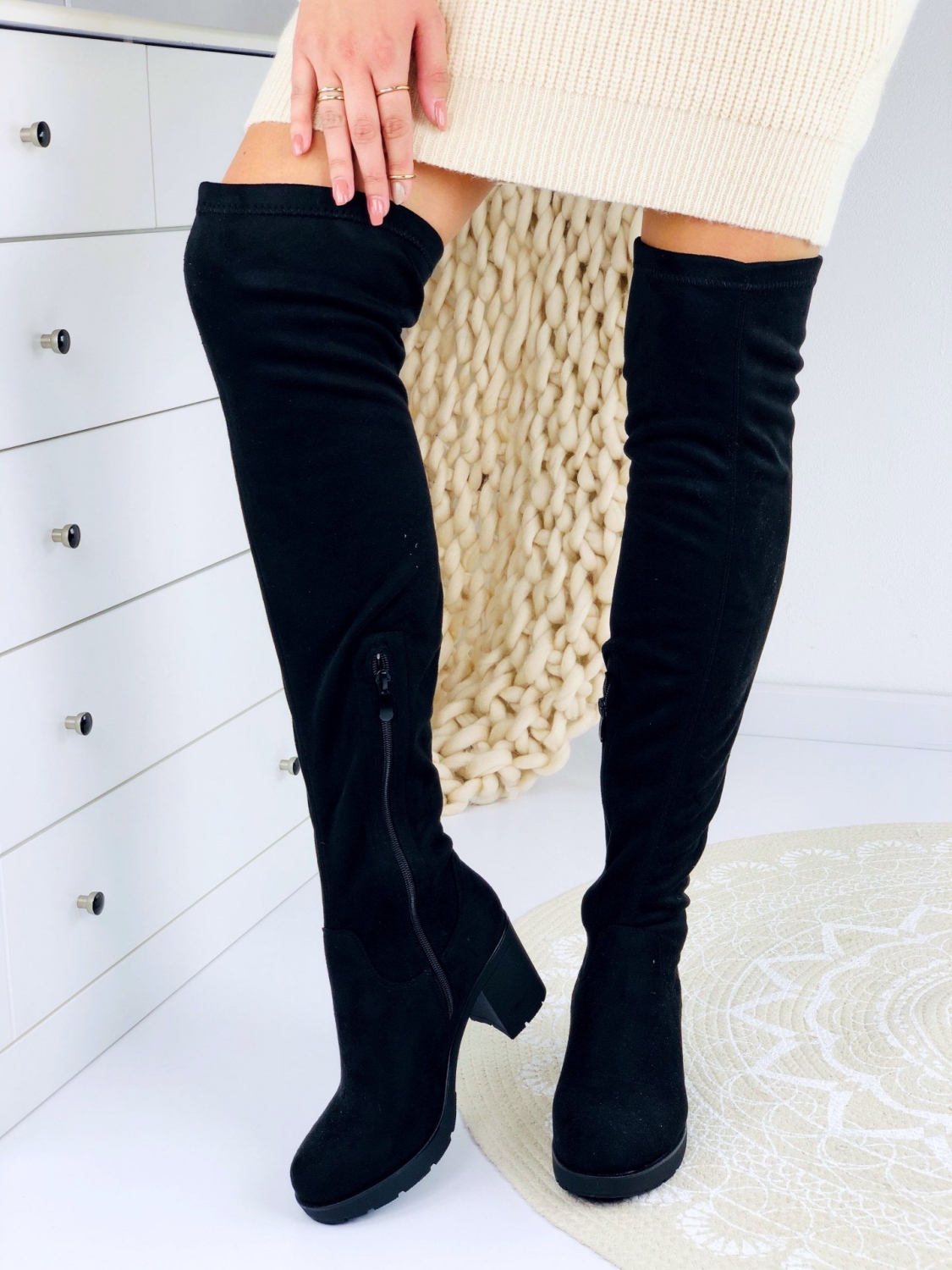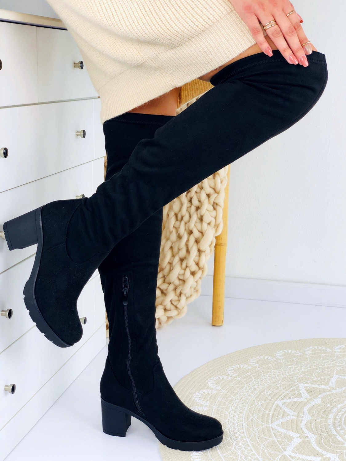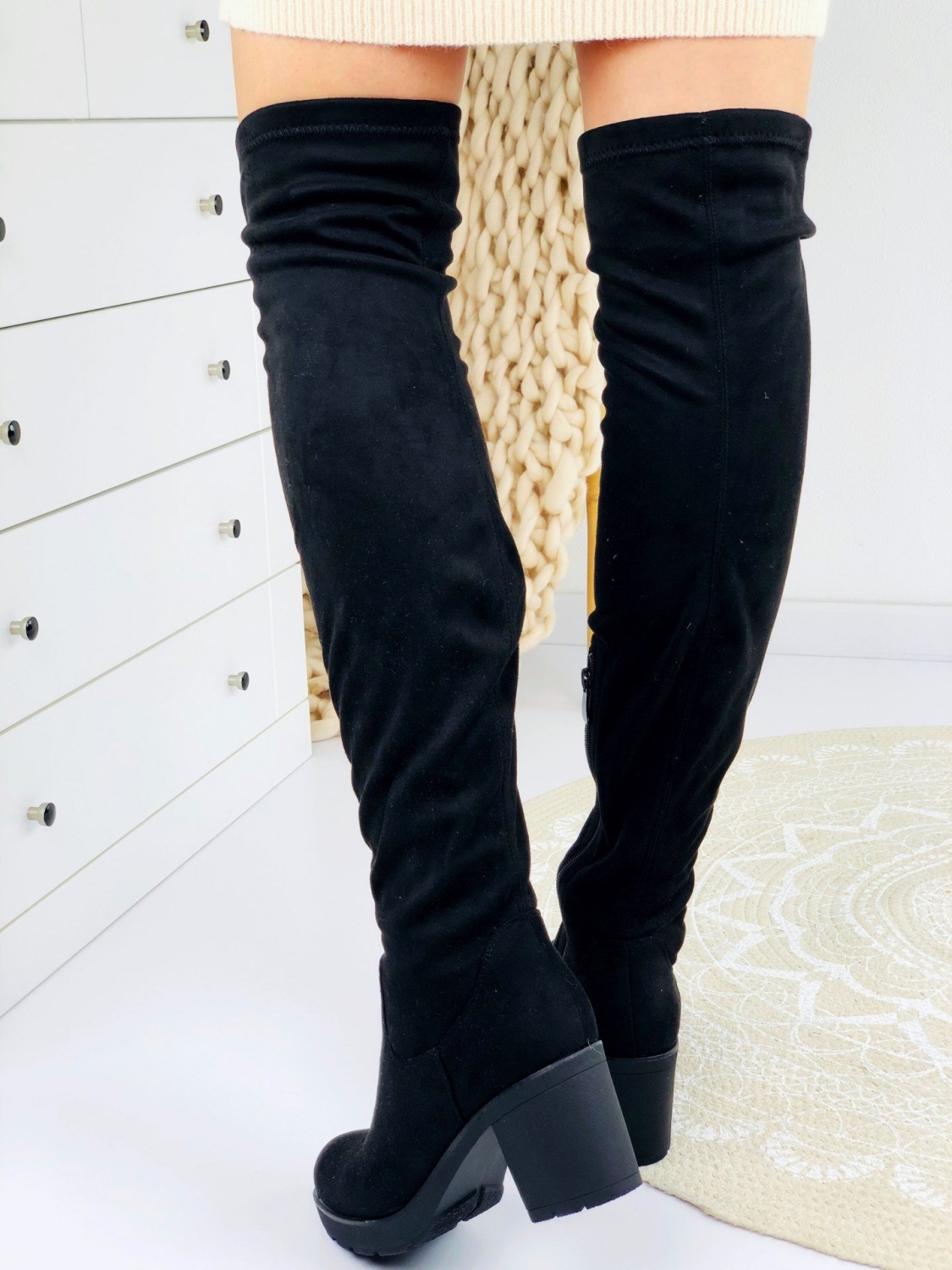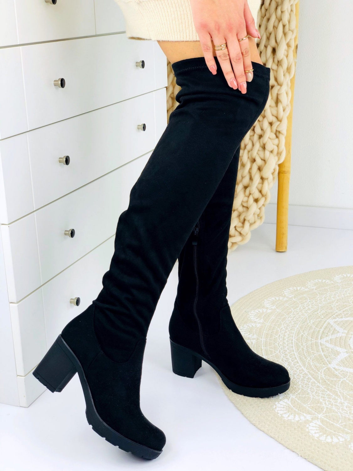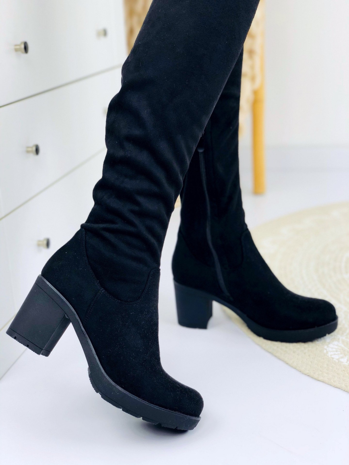Dámske vysoké čižmy nad kolená v čiernej farbe. Vďaka elegantnému strihu a hrubému 7cm opätku budete vyzerať veľmi štýlovo. Veľmi pohodlný a trendový model na každodenné nosenie. Môžete si ich obliecť do práce, na prechádzky alebo len tak do mesta na kávu. Môžete v nich vyraziť kamkoľvek. Čižmy majú zateplené vnútro. Zapínanie zboku na zips. Veľkosti sedia presne.
