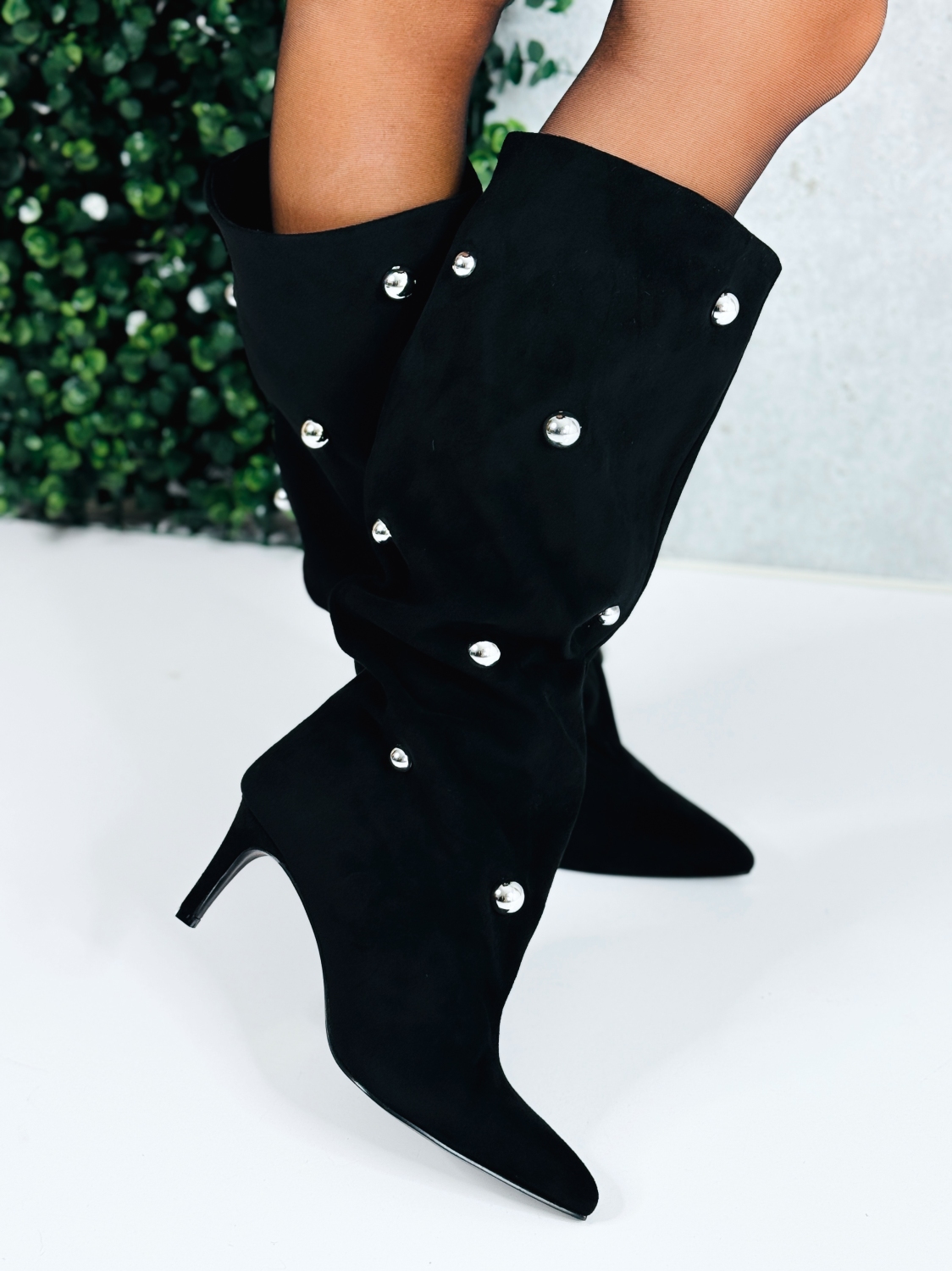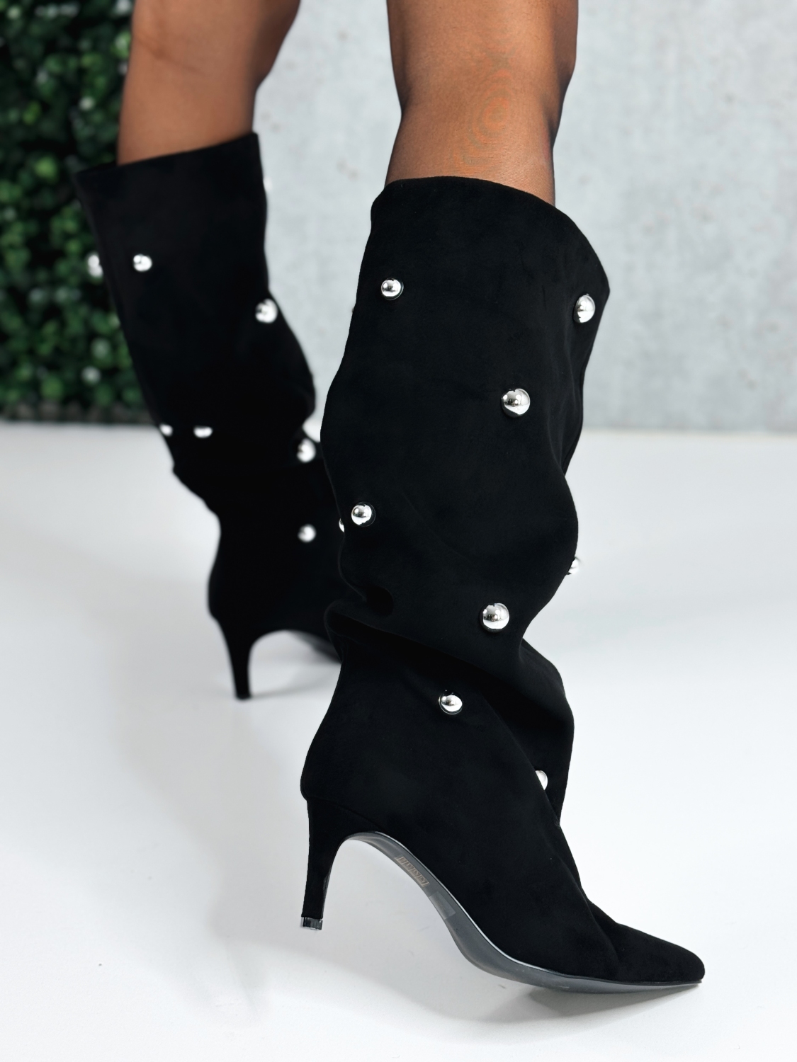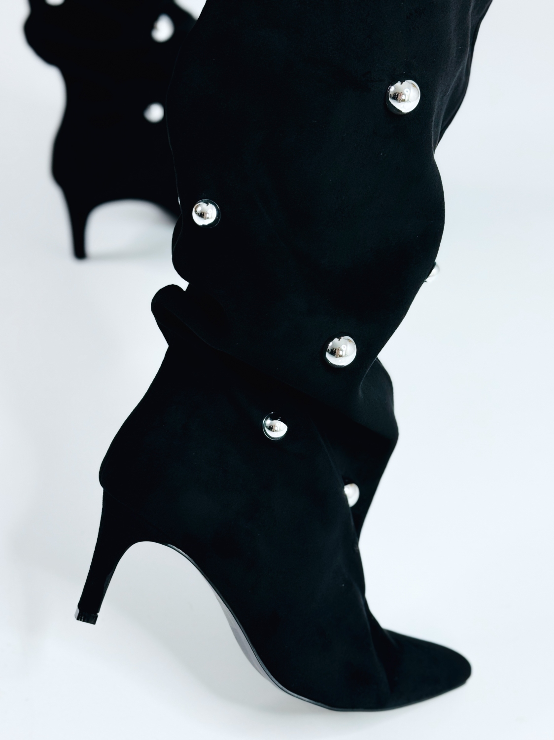 Tieto štýlové dámske čižmy pod kolená sú ideálnou voľbou pre každú modernú ženu, ktorá hľadá kombináciu pohodlia, elegancie a odvážneho dizajnu. Čižmy sú vyrobené z kvalitného materiálu, ktorý zaručuje odolnosť a dlhú životnosť. Ich hladký povrch pôsobí luxusne a zároveň prakticky, čo umožňuje jednoduchú údržbu. Nízky, stabilný opätok poskytuje pohodlnú chôdzu počas celého dňa, zatiaľ čo podkolenná dĺžka elegantne predlžuje siluetu a dodáva ženský šarm. Výnimočný dizajn týchto čižiem dopĺňajú kovové cvoky, ktoré im dodávajú moderný a jemne rockový nádych, ideálne na oživenie každého outfitu. Cvoky sú starostlivo umiestnené tak, aby boli štýlové, ale zároveň neprekážali pri nosení. Čižmy sú vhodné na rôzne príležitosti – od každodenného nosenia do práce či na prechádzky, až po večerné výlety a spoločenské udalosti. Vnútorná podšívka zabezpečuje pohodlie a teplo, zatiaľ čo pevná podrážka zaisťuje stabilitu a bezpečný krok na rôznych povrchoch.