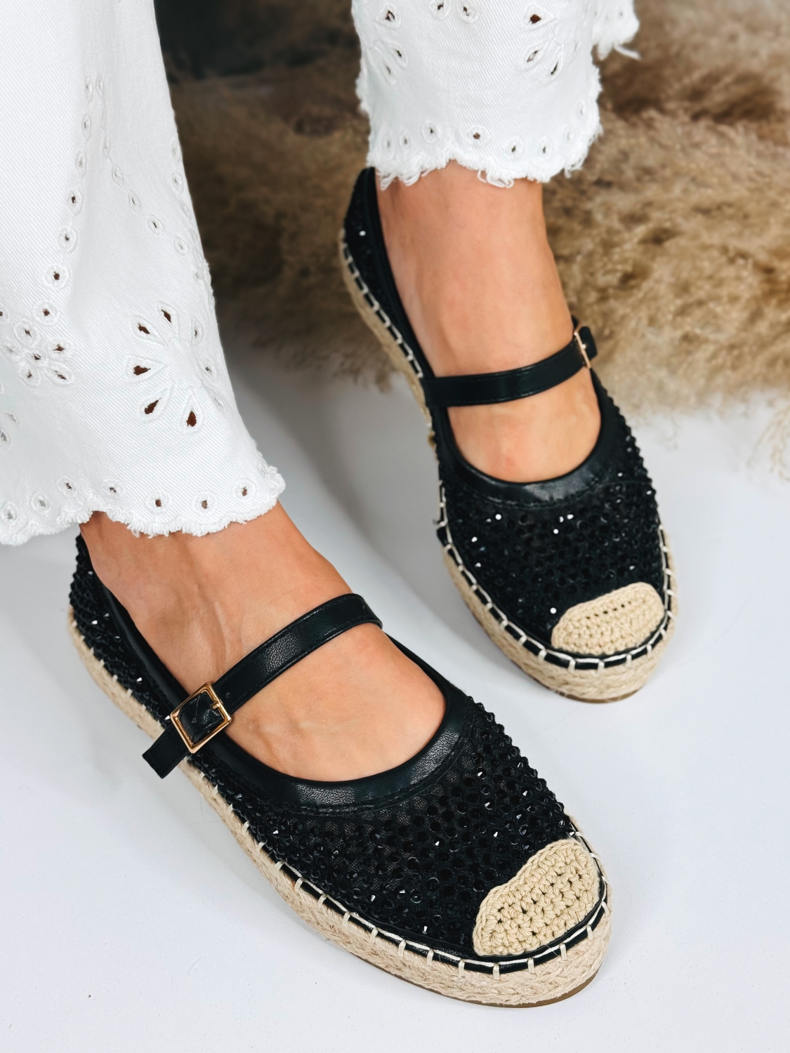 Dámske čierne espadrilky s prackou na platforme, zdobené jemnými ozdobnými kamienkami, sú dokonalým spojením elegancie, ženskosti a pohodlia. Tento model v sebe spája klasický letný štýl espadriliek s modernými detailmi, ktoré zaujmú na prvý pohľad. Práve ozdobné kamienky, ktoré sú vkusne rozmiestnené po vrchnej časti topánky, dodávajú celkovému vzhľadu luxusný a jemne trblietavý efekt. Univerzálna čierna farba zabezpečuje, že espadrilky ľahko skombinujete s akýmkoľvek outfitom – či už zvolíte romantické šaty, elegantnú sukňu alebo ležérne rifľové šortky. Vďaka kamienkom však nepôsobia obyčajne, ale naopak, dodajú vášmu vzhľadu šmrnc a originalitu. Vyššia platformová podrážka opticky predĺži nohy a zároveň poskytuje stabilitu a pohodlie pri chôdzi.
