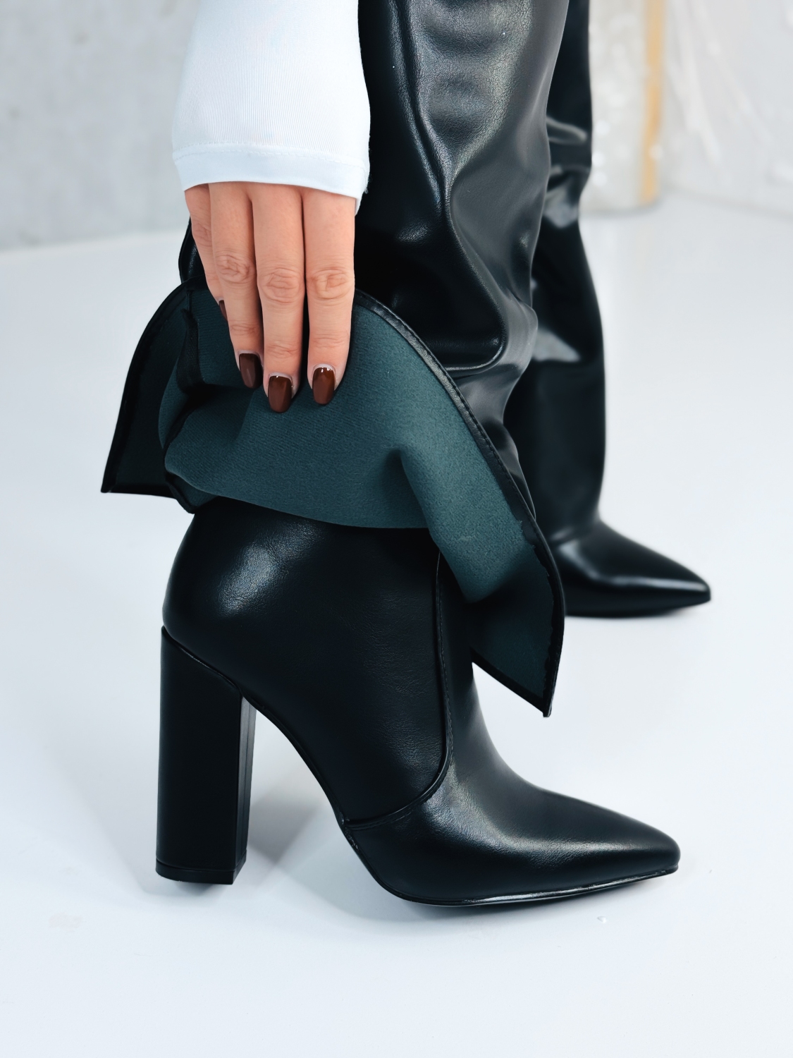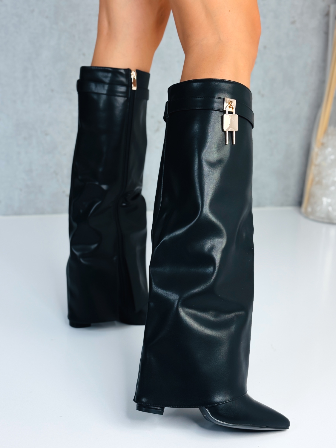 Tieto štýlové čižmy spájajú nadčasovú eleganciu s moderným dizajnom a sú jednoducho must-have kúskom tohto obdobia. Vyrobené z mäkkej koženky s jemným leskom, pôsobia luxusne na pohľad aj dotyk, pričom si zachovávajú výnimočné pohodlie počas celého dňa. Špičatý tvar opticky predlžuje nohy a dodáva postave ženský, sofistikovaný vzhľad. V hornej časti ich zdobí decentná zlatá aplikácia so zapínaním, ktorá im dodáva originálny a elegantný akcent. Praktický bočný zips zabezpečuje jednoduché obúvanie a prispôsobenie lýtku, zatiaľ čo stabilný opätok zaručuje komfort pri každom kroku. Skvelo sa kombinujú s úzkymi džínsami, krátkou sukňou či pletenými šatami, vďaka čomu vytvárajú dokonale premyslený, ženský look. Ideálne pre dni, keď chceš vyzerať elegantne, no stále prirodzene – štýl, ktorý hovorí sám za seba.