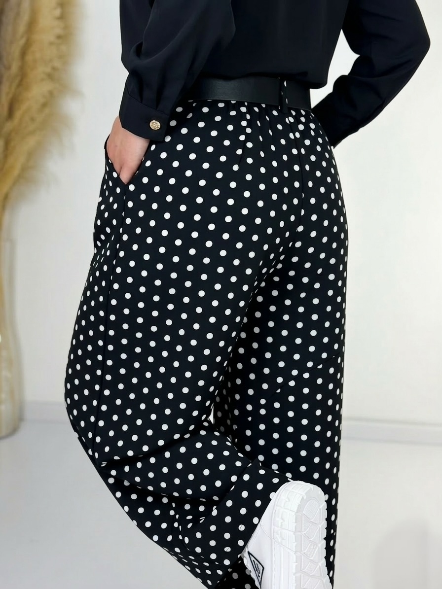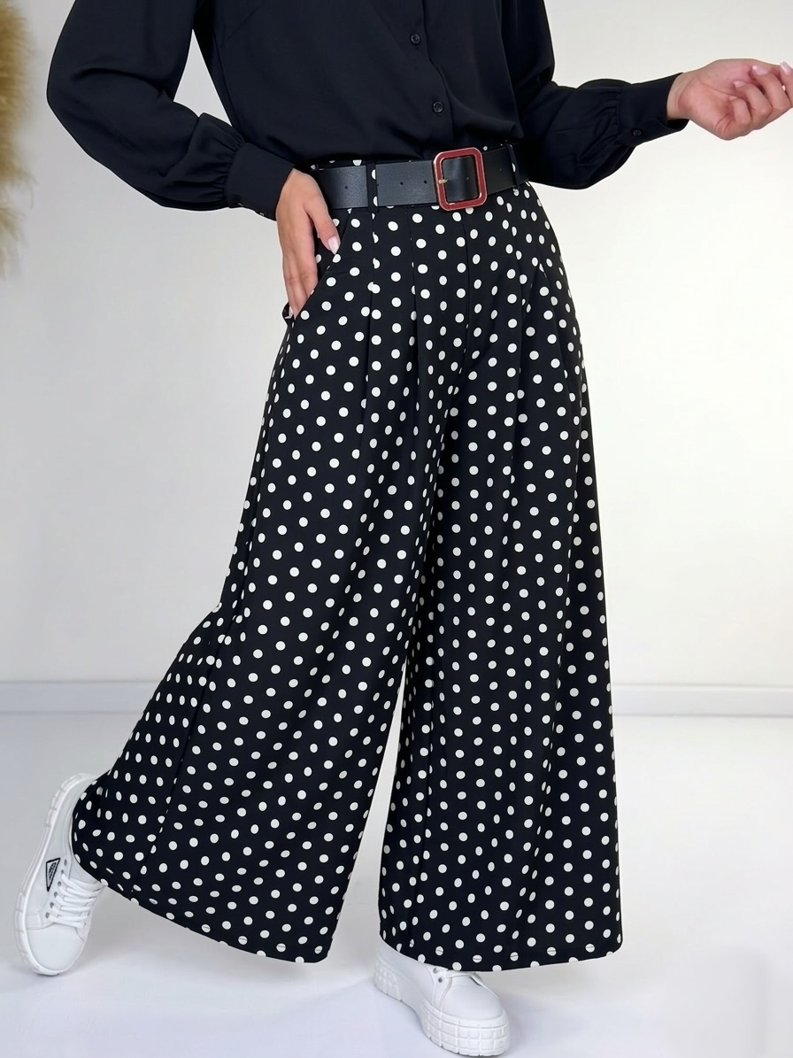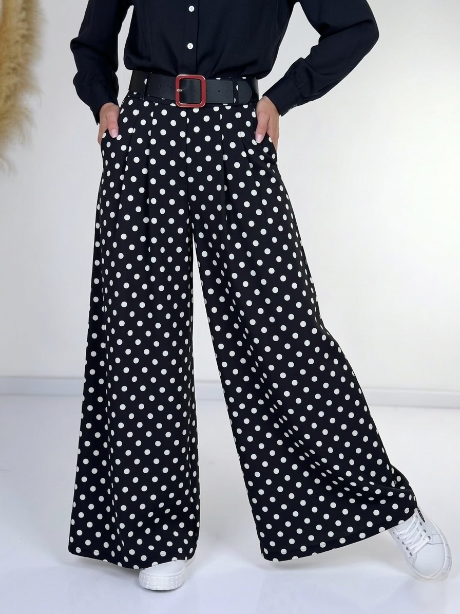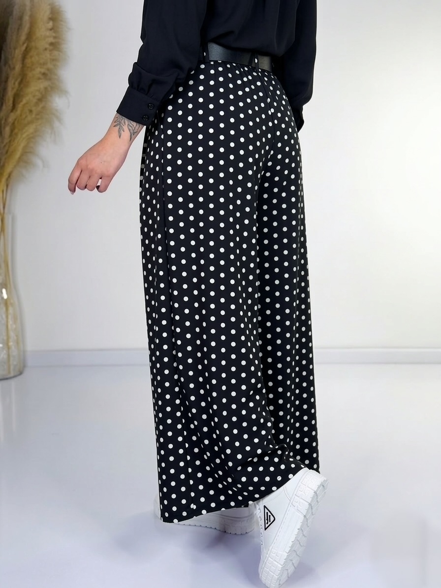 Dámske široké nohavice na bodky s vysokým pásom a opaskom, vytvárajú nádherný efekt štíhleho pásu a zároveň zaručujú maximálny komfort. Elastický pás na nohaviciach umožňuje ich prispôsobenie podľa potreby, čím poskytuje perfektné pohodlie po celý deň. Tieto nohavice nielen skvele sedia, ale aj nádherne lichotia postave. Vrecká na oboch stranách pridávajú praktický aj štýlový detail. S univerzálnou veľkosťou (UNI) sú vhodné pre rôzne typy postáv a sadnú na veľkoti S, M, L aj XL. Stačí si obuť tenisky, alebo lodičky, či mokasíny, pridať pár módnych doplnkov a máte outfit, ktorý je ideálny na každú príležitosť. Oblečte sa do pohodlia a štýlau a nechajte sa očariť týmto trendy kúskom. Modelka má výšku 175 cm a má oblečenú veľkosť UNI.