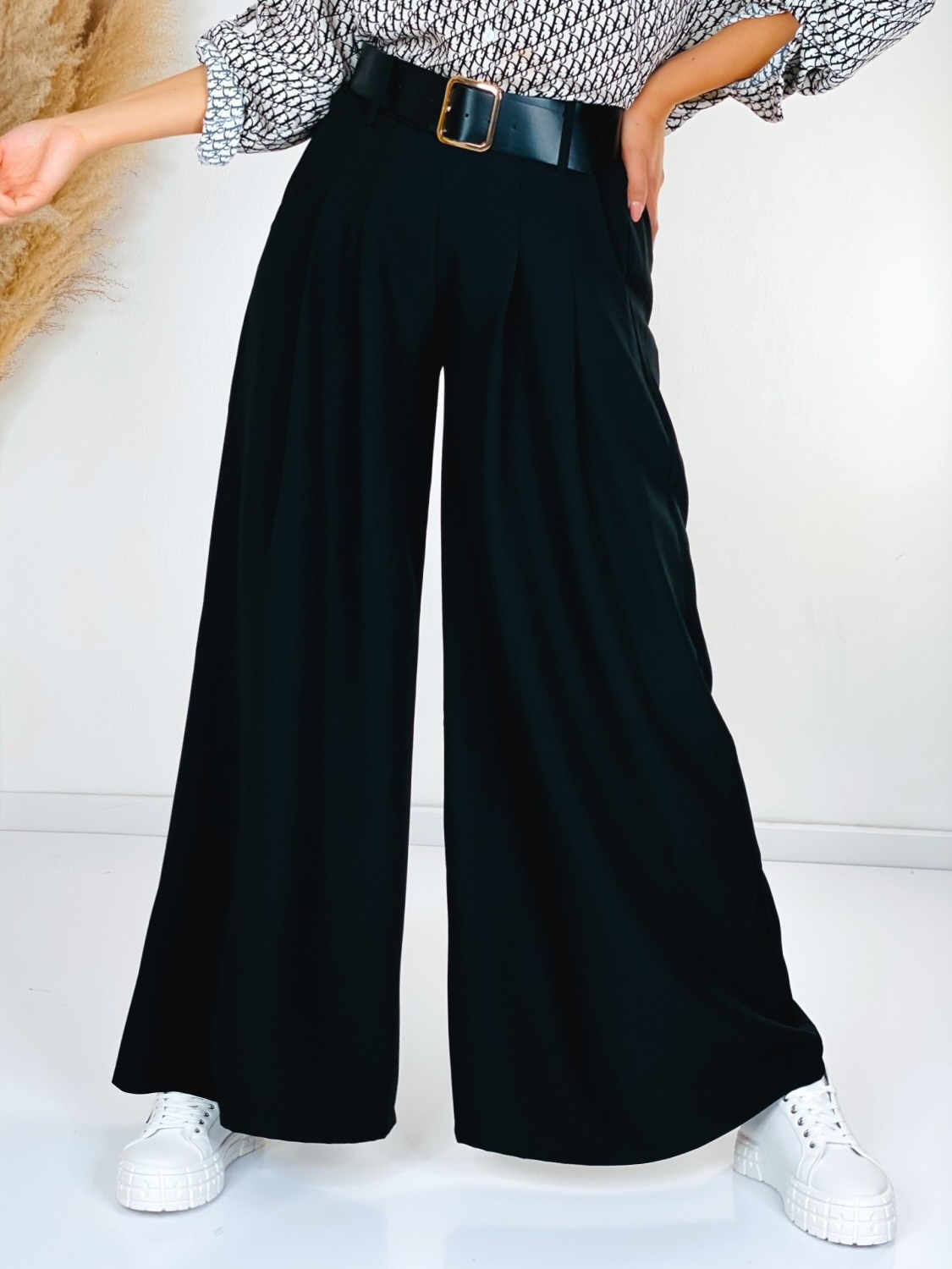 Dámske široké nohavice s vysokým pásom, ktoré sú v spodnej časti rozšírené. Perfektný efekt štíhleho pásu. Pás je pružný, prispôsobíte si ho vďaka gumičke v páse. Pohodlný strih si okmažite zamilujete. Ihneď zalichotia Vašej postave. Obujte si k nim tenisky, dolaďte zvyšok outfitu a vyrazte v trendy kúsku kamkoľvek, nikdy nič nepokazíte. Vrecká na oboch stranách. Modelka je vysoká 175 cm a má oblečenú veľkosť UNI.