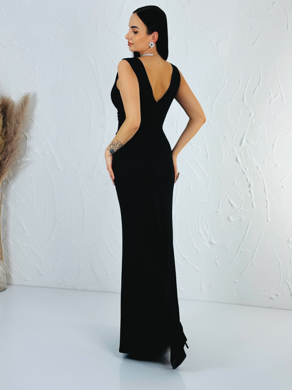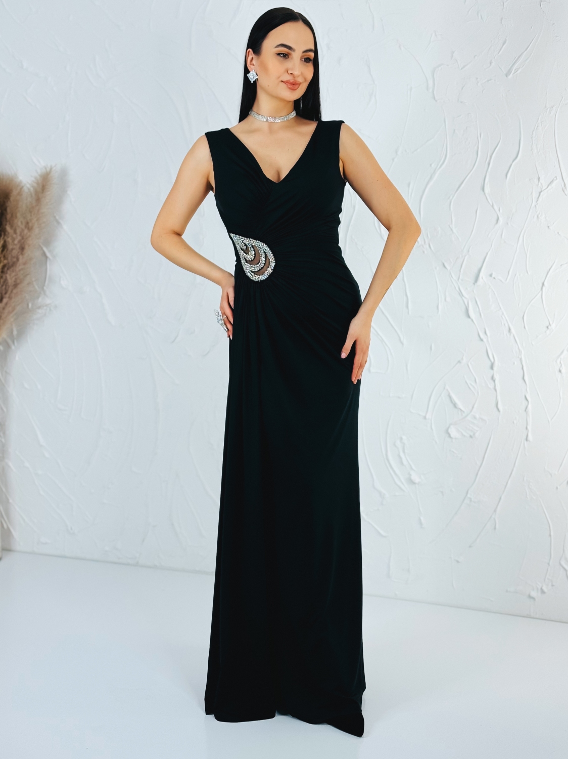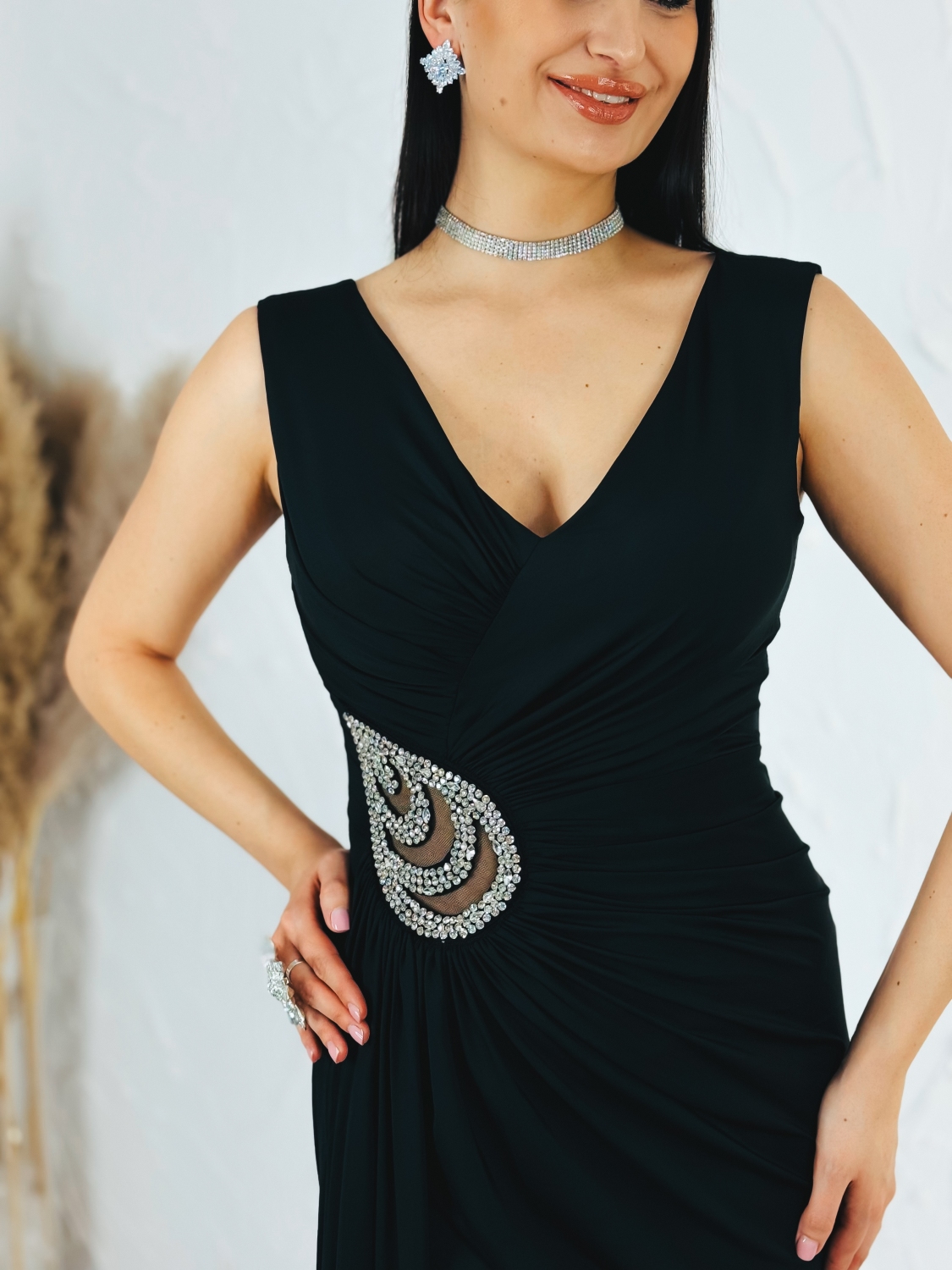 Tieto dámske spoločenské šaty sú stelesnením nadčasovej elegancie a ženského pôvabu. Dlhý splývavý strih krásne kopíruje siluetu postavy a opticky ju predlžuje, vďaka čomu pôsobí veľmi štíhlo a noblesne. Jemne priliehavý vrch so sofistikovaným riasením vytvára lichotivý efekt v oblasti pásu a dekoltu, pričom zvýrazňuje ženské krivky bez zbytočnej okázalosti. Dominantným dizajnovým prvkom je luxusná strieborná aplikácia v oblasti pásu, ktorá dodáva šatám exkluzívny charakter a zároveň slúži ako elegantný akcent, ktorý priťahuje pohľad. Aplikácia je precízne spracovaná a pôsobí veľmi vkusne, vďaka čomu sú šaty ideálnou voľbou aj na tie najvýznamnejšie spoločenské udalosti. Hlbší V-výstrih opticky predlžuje krk a pôsobí veľmi žensky. Dlhá sukňa s rozparkom zabezpečuje nielen zvodný detail, ale aj pohodlie pri chôdzi a tanci, čo oceníte najmä počas dlhých večerov. Šaty sú vyrobené z príjemného, hladkého a splývavého materiálu, ktorý sa krásne prispôsobí pohybu tela a pôsobí luxusne na pohľad aj na dotyk. Zapínanie je riešené skrytým zipsom na zadnej strane, čo zabezpečuje jednoduché obliekanie a čistý, nerušený vzhľad. Tento model je ideálny na plesy, svadby, galavečery, stužkové, formálne oslavy či večerné spoločenské podujatia, kde chcete pôsobiť elegantne, sebavedomo a výnimočne.