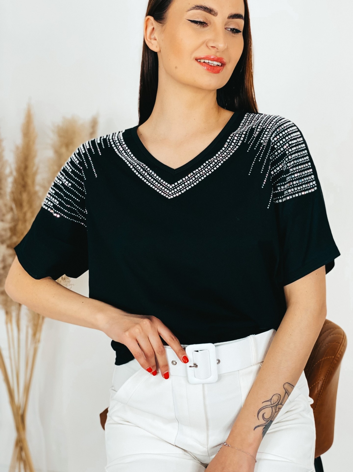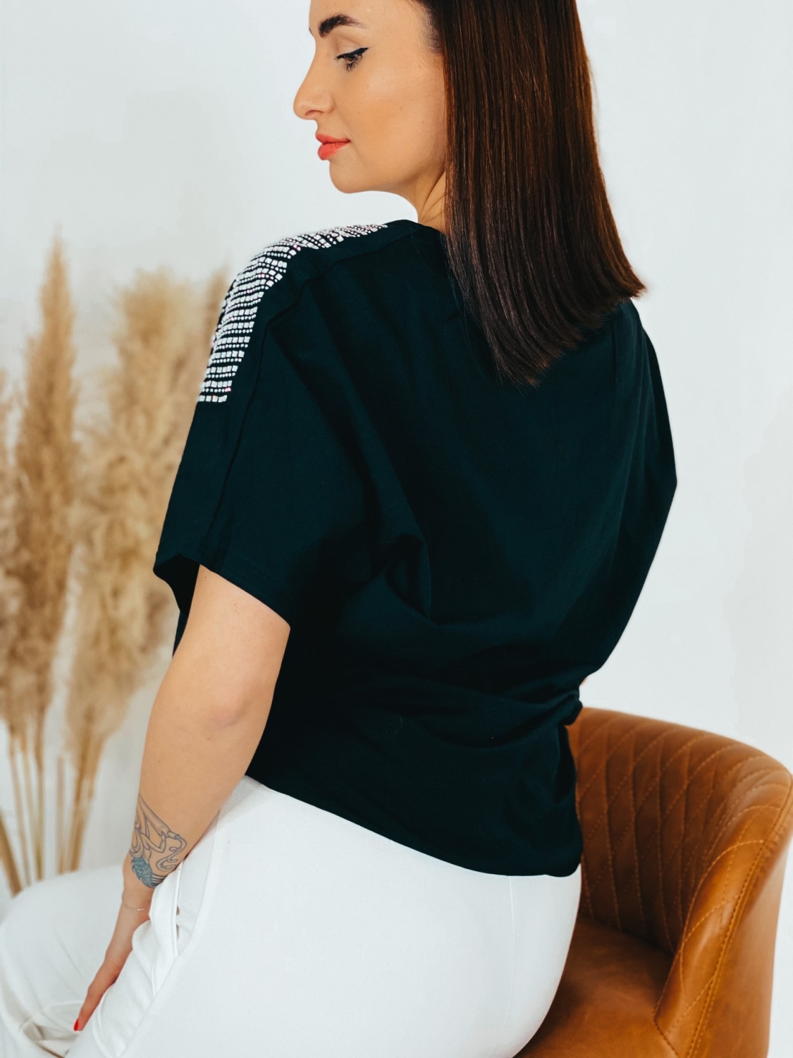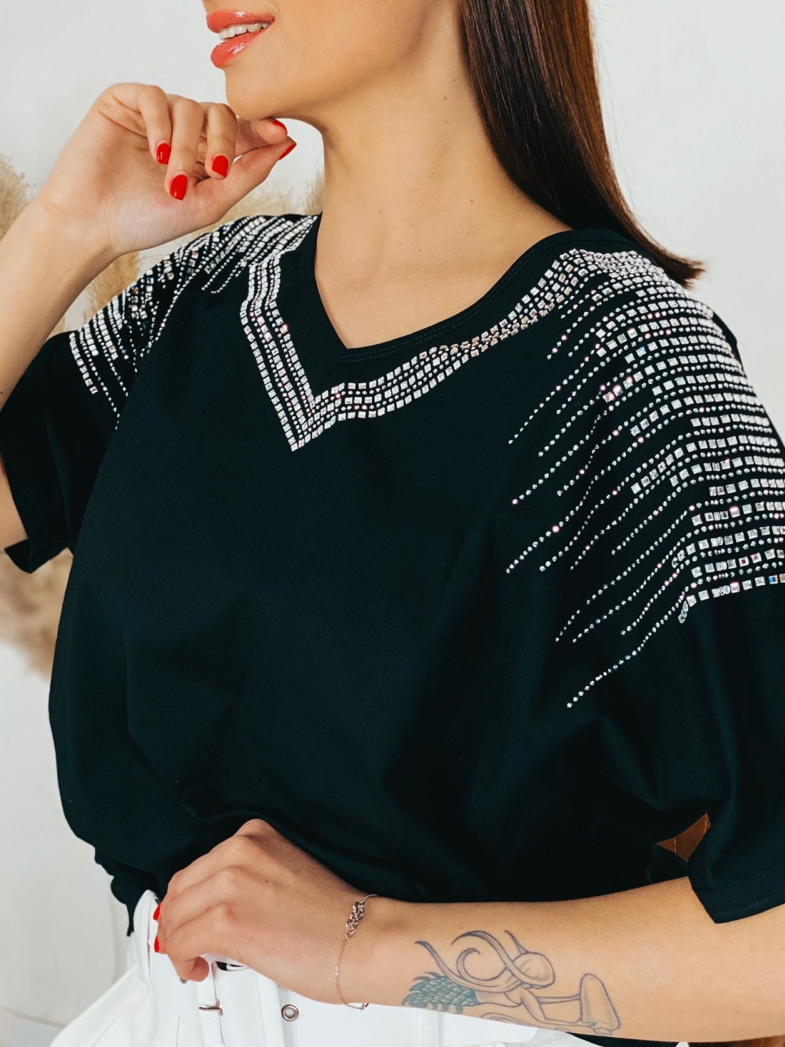 Dámske elegantné tričko s aplikáciami v prednej časti a véčkovým výstrihom. Ľahko kombinovateľný s možnosťou nosenia aj na slávnostejšiu príležitosť k sukni, nohaviciam alebo kostýmu. Taktiež je vhodný aj na bežné nosenie, ako do práce, školy, či na rande. Kúsok, ktorý Vás nikdy neomrzí a ihneď ohúri aj Vaše okolie. Perfektný oversize strih. Vkusný kúsok pre každú žienku, ktorá má rada zaujímave kúsky. Modelka je vysoká 175 cm a oblečenú má veľkosť S/M.