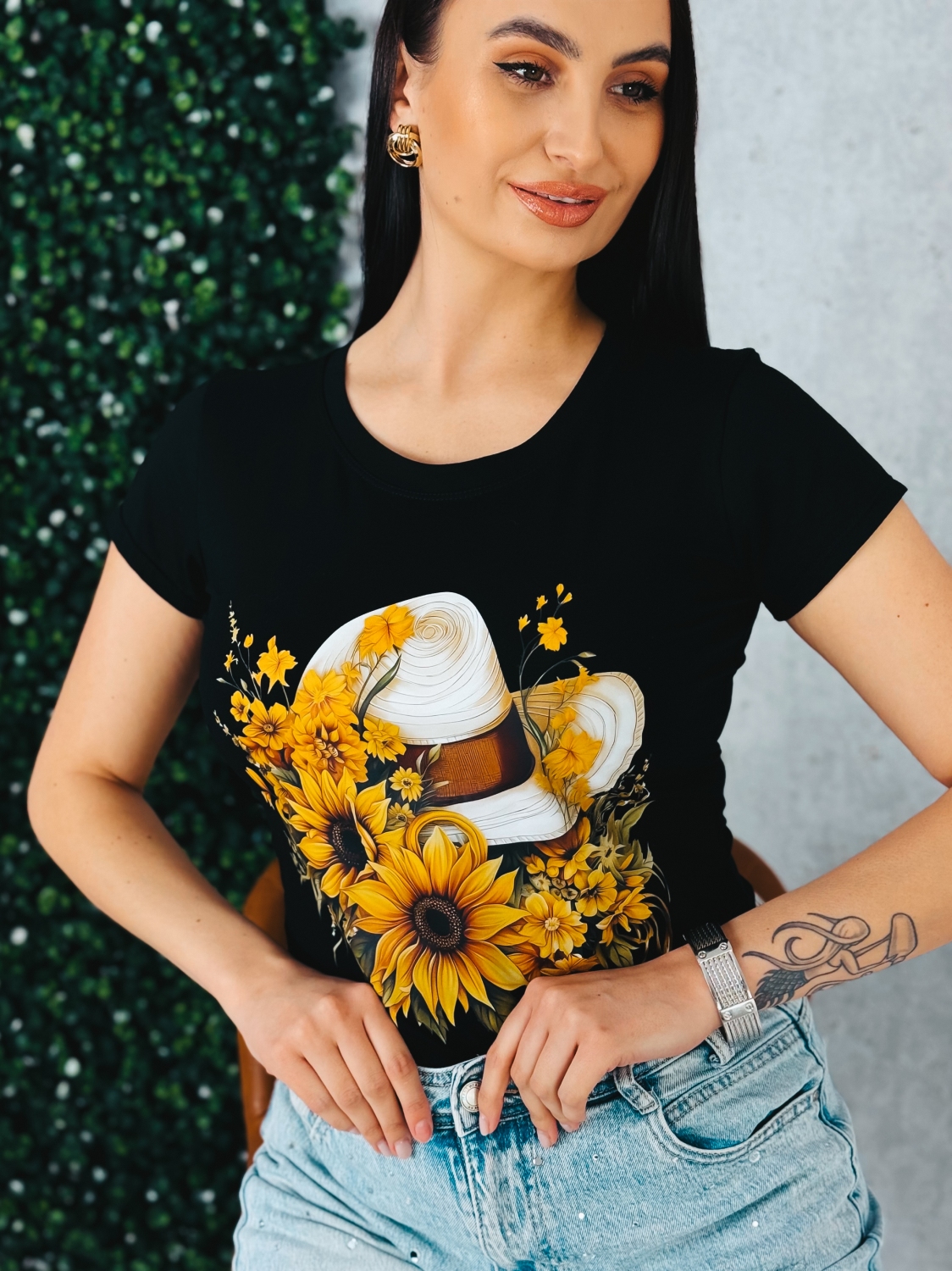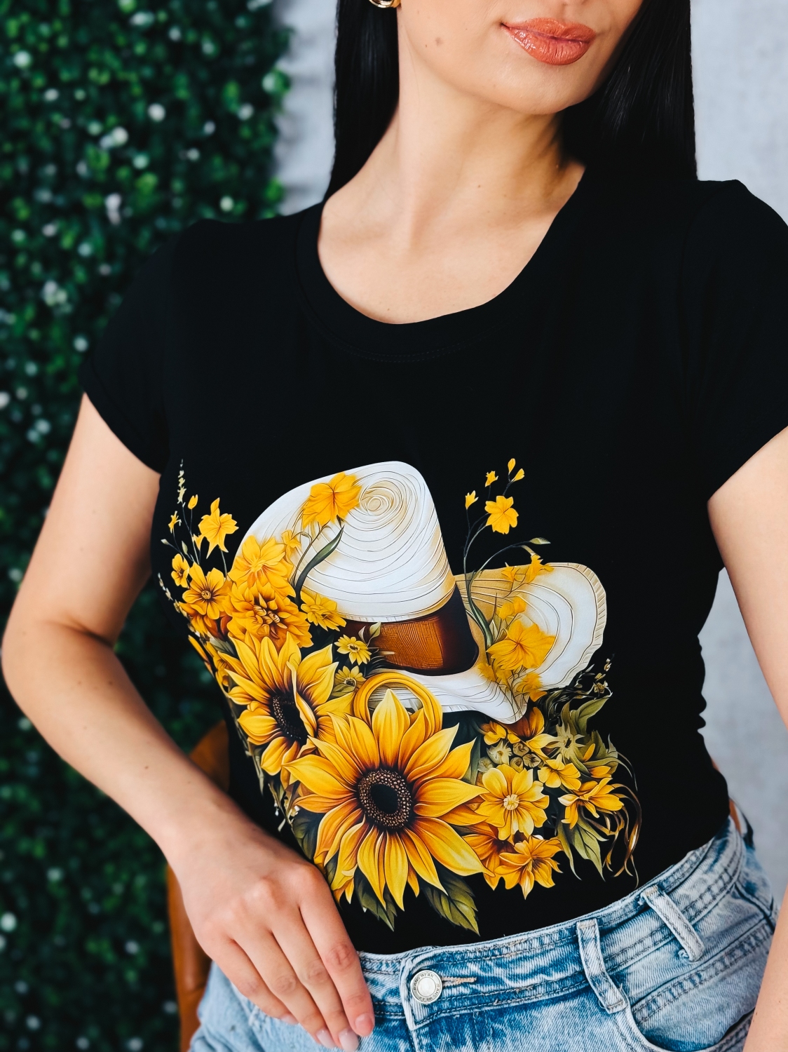 Štýlové dámske čierne tričko s výraznou potlačou elegantného bieleho klobúka obklopeného rozkvitnutými slnečnicami je ideálnym kúskom pre ženy, ktoré milujú kombináciu ženskosti, elegancie a moderného dizajnu. Kontrast sýtych žltých tónov kvetov s hlbokou čiernou farbou vytvára výrazný, no zároveň vkusný efekt. Dominantný motív pôsobí romanticky aj sofistikovane zároveň. Slnečnice symbolizujú radosť, energiu a pozitívnu náladu, zatiaľ čo klobúk dodáva celému dizajnu nádych elegancie a letnej bezstarostnosti. Tričko tak pôsobí sviežo, žensky a zároveň veľmi štýlovo. Strih krásne zvýrazní postavu a vďaka univerzálnej čiernej farbe sa ľahko kombinuje s džínsami, šortkami aj sukňou. Je vhodné na bežné nosenie, stretnutia s priateľmi, dovolenku či voľný čas. Výrazná potlač z neho robí kúsok, ktorý nepotrebuje výrazné doplnky – stačí si ho obliecť a outfit je hotový.