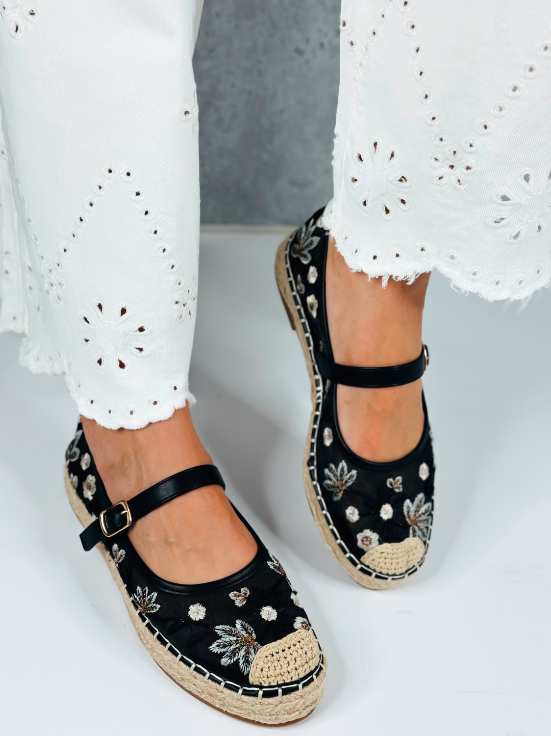 Tieto dámske vyšívané espadrilky sú stelesnením jemnosti, romantiky a letnej elegancie. Ich jedinečný dizajn vyniká krásnou kvetinovou výšivkou na prednej časti, ktorá dodáva obuvi originálny a ženský charakter. Precízne spracovaná výšivka pôsobí luxusne a zároveň hravo, čím dokonale oživí každý outfit. Zvršok espadriliek je vyrobený z príjemného textilného materiálu, ktorý je ľahký, priedušný a ideálny na teplé dni. Vnútro topánok poskytuje komfort pri nosení, zatiaľ čo klasická espadrilková podrážka s prírodným vzhľadom dodáva modelu autentický letný štýl. Remienok okolo členka zabezpečuje stabilitu a pevné držanie nohy, pričom zároveň pôsobí veľmi elegantne a zvýrazňuje ženskosť. Vďaka nemu espadrilky perfektne sedia na nohe a sú vhodné aj na dlhšie prechádzky či celodenné nosenie.