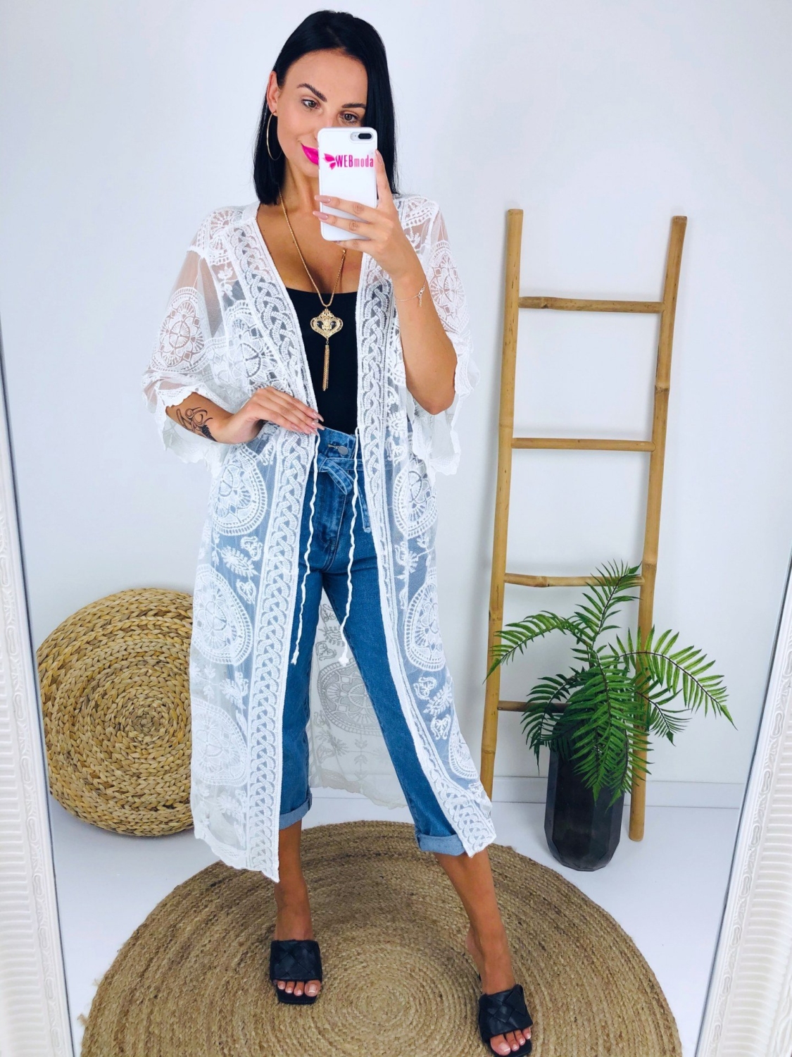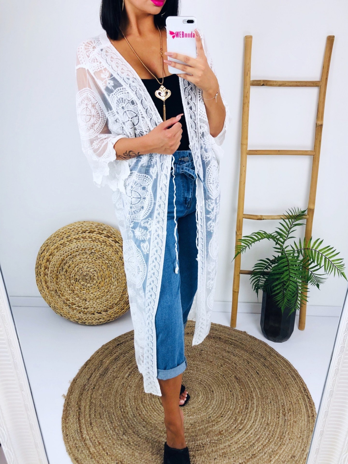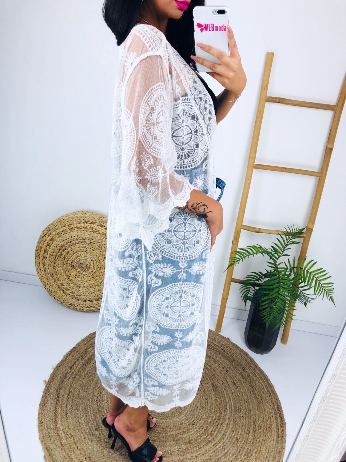 Dámske čipkované dlhé kimono. Kimono je všestranný kúsok, ktorý Vám túto sezónu nesmie v šatníku chýbať. Obliecť si ho môžete na bežný deň alebo na plavky k vode. Neodmysliteľná súčasť plážovej výbavy na toto leto. Zložené je z pohodlného a kvalitného padavého materiálu.