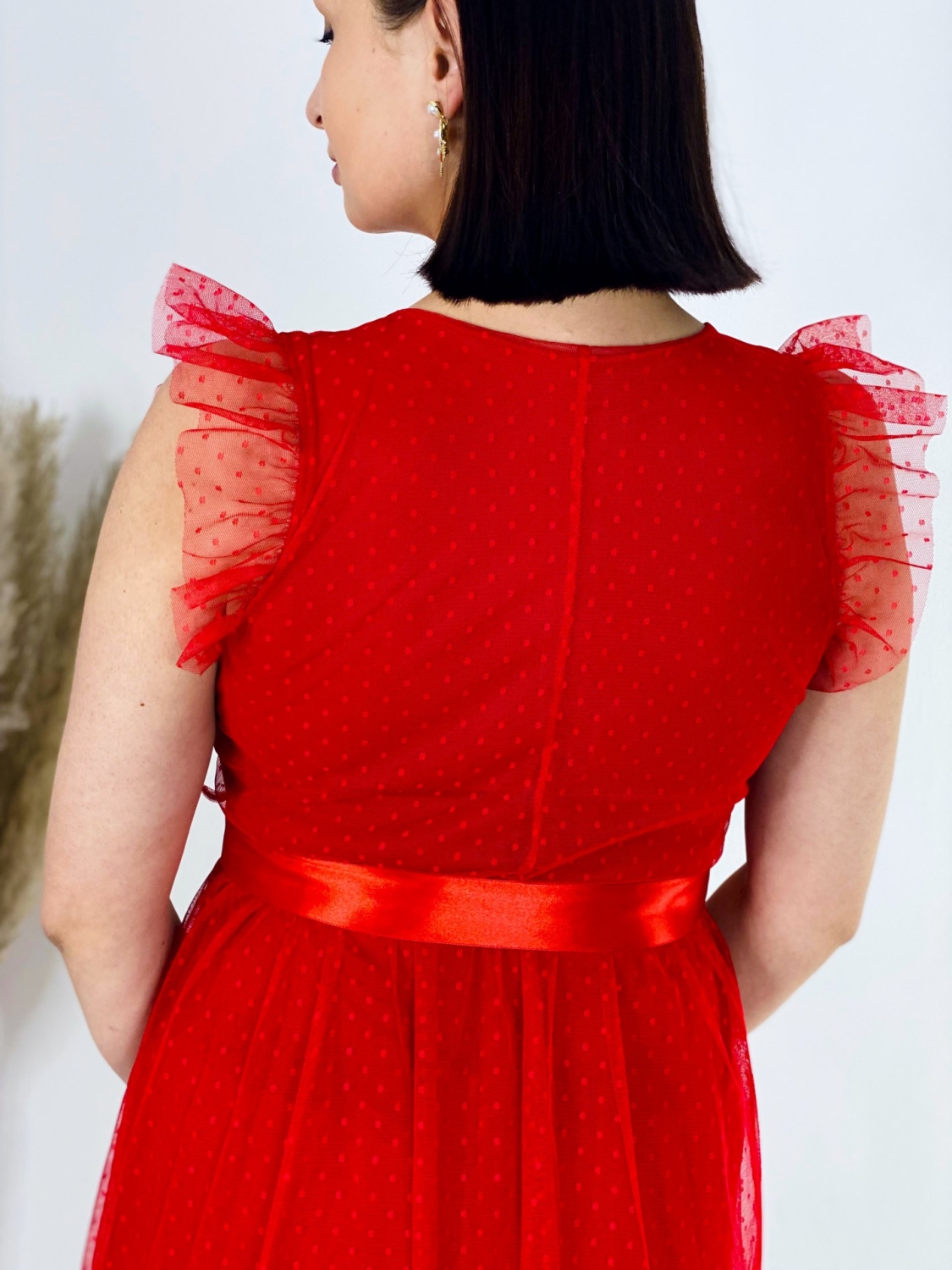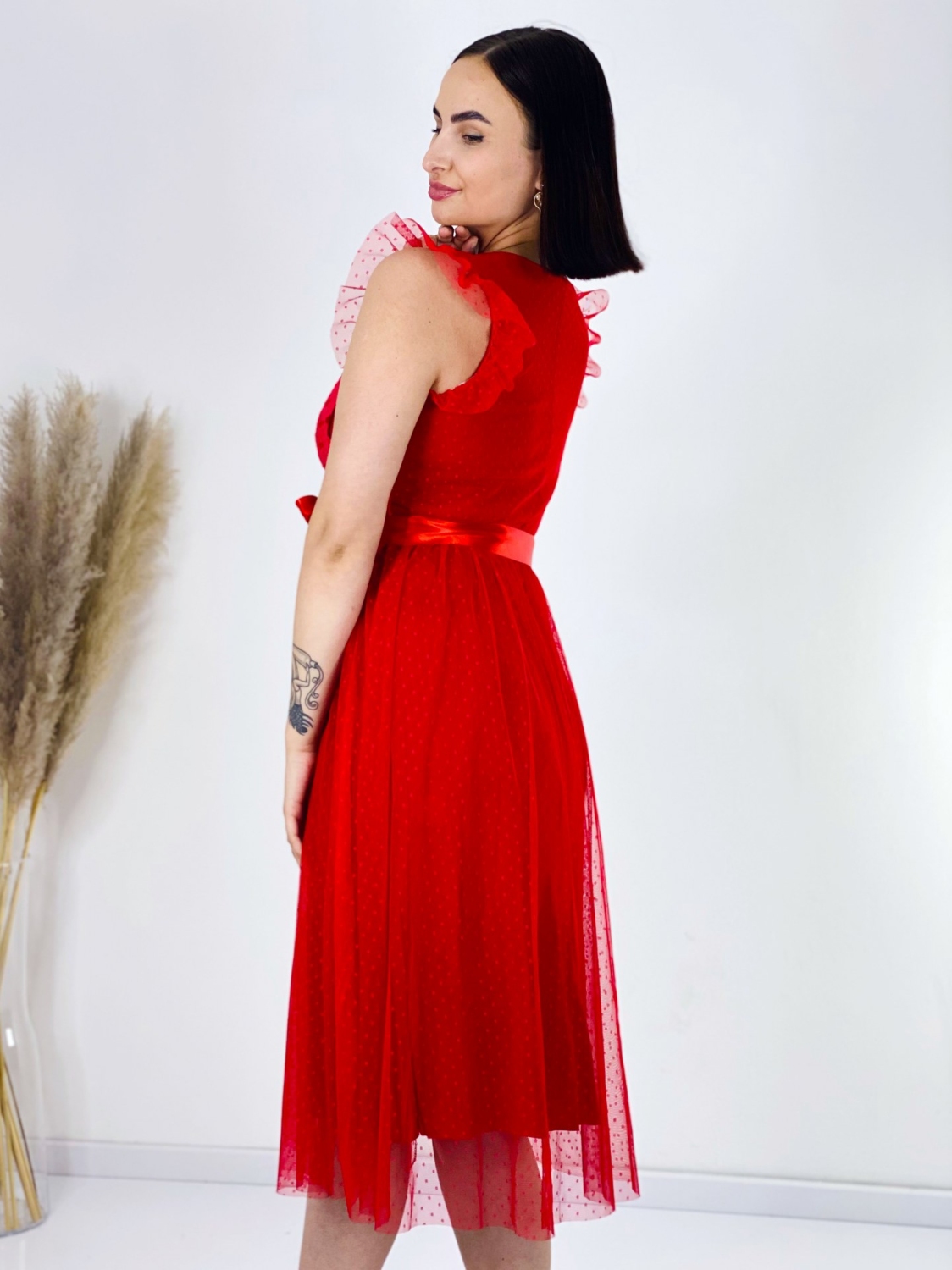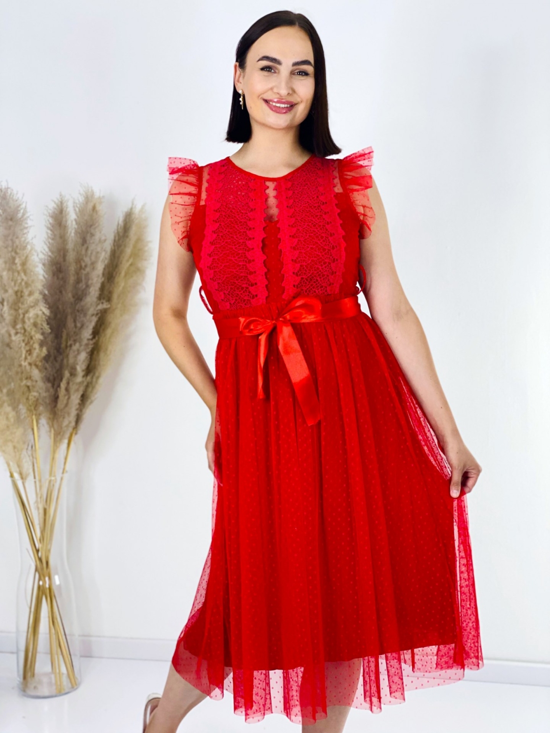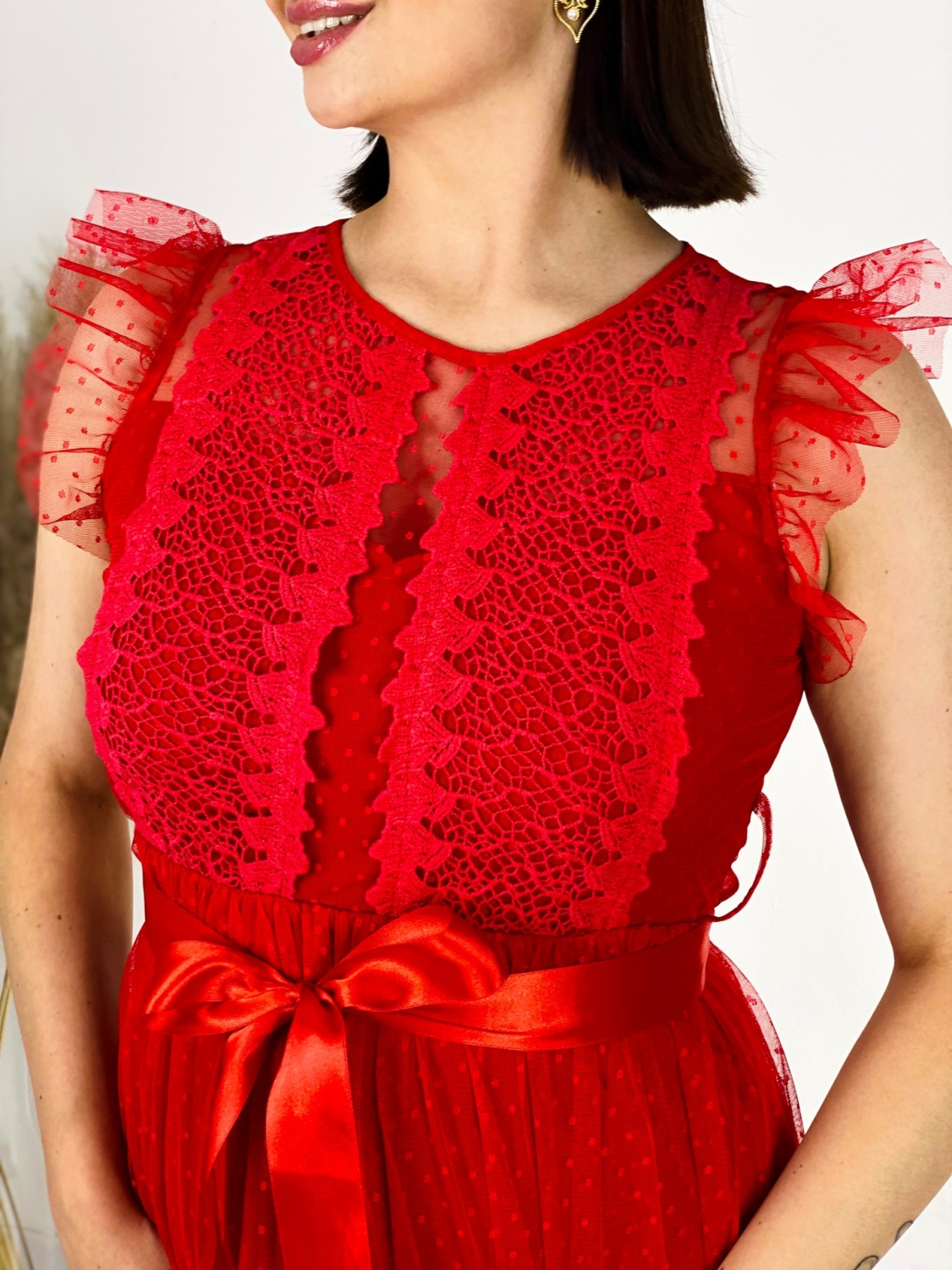 Ak hľadáte dokonalé šaty pre svoje družičky, máte sa na čo tešiť. Tieto luxusné šaty s jemnou čipkou a krásnym opaskom sú dokonalou voľbou pre každú ženu, ktorá chce vyzerať romanticky a elegantne. Ich romantický strih doplnený o opasok zvýrazní vašu ženskú postavu a pritiahne všetky zraky. Jemné volániky na rukávoch dodávajú šatám nádych krehkosti a zjemňujú celkový dojem. Tieto nádherne žiarivé šaty sú vhodné nielen na špeciálne príležitosti, ale ich môžete nosiť aj na bežné spoločenské udalosti. Neváhajte a doplňte si ich krásnymi doplnkami pre ešte dokonalejší vzhľad. Šaty sú v áčkovom strihu a bez zapínania. Či už si ich oblečiete na svadbu, ples alebo firemný večierok, budete v nich žiariť. Tieto šaty sú skrátka perfektnou voľbou pre každú príležitosť. Modelka je vysoká 175 cm a oblečenú má veľkosť UNI.