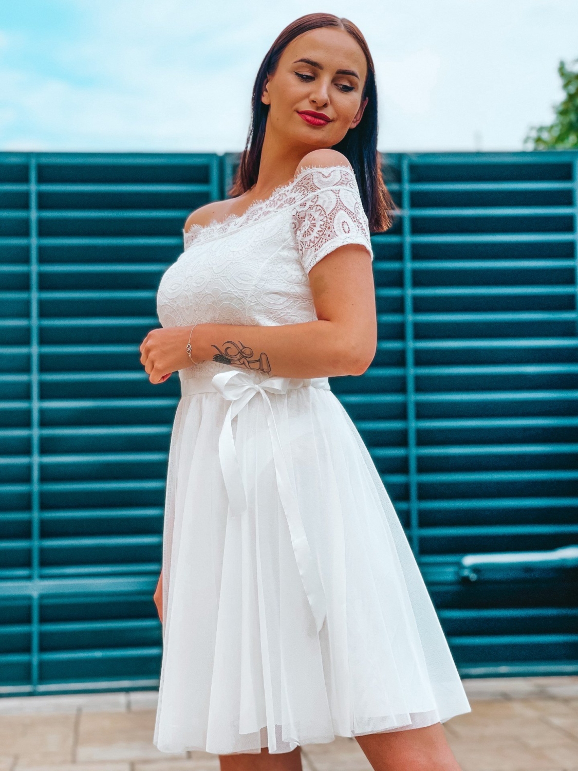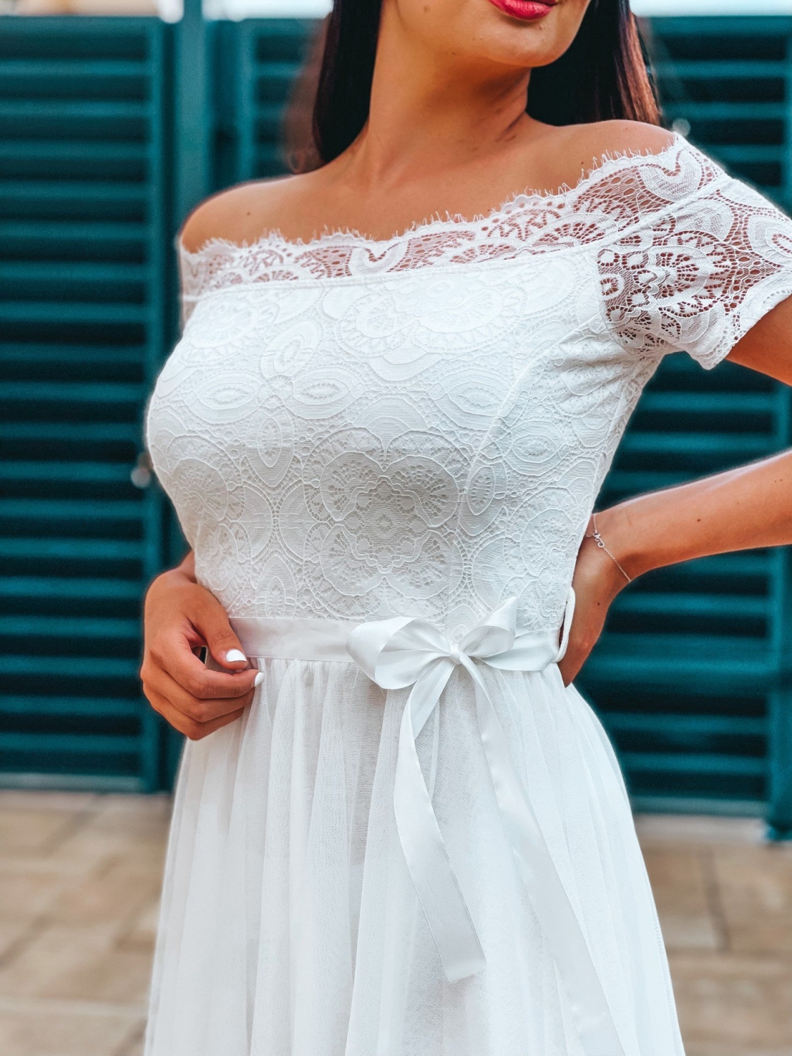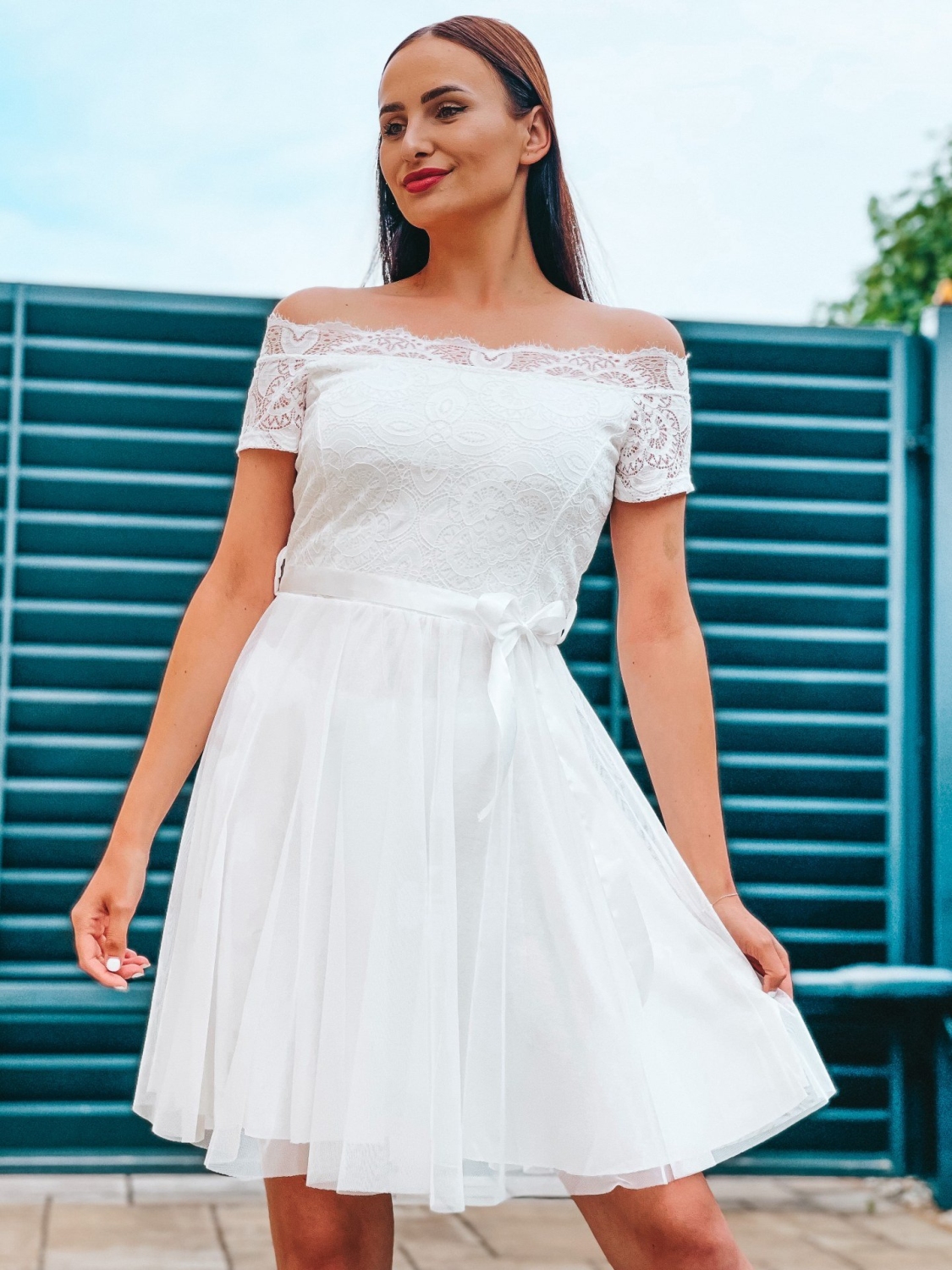 Dámske trendy spoločenské čipkované šaty s opaskom na ramená. Doplnené jemnou čipkou v prednej časti a tylovou sukňou. Šaty zvýraznia tvoje silné stránky a čipka ti dodá dievčenský šarm! Kvalitný a príjemný materiál. Vďaka zaujímavému strihu budete vynikať a určite neostanete bez povšimnutia. Šaty ľahko skombinujete podľa vlastného vkusu. Pohodlné a praktické s možnosťou nosenia na spoločenské udalosti.