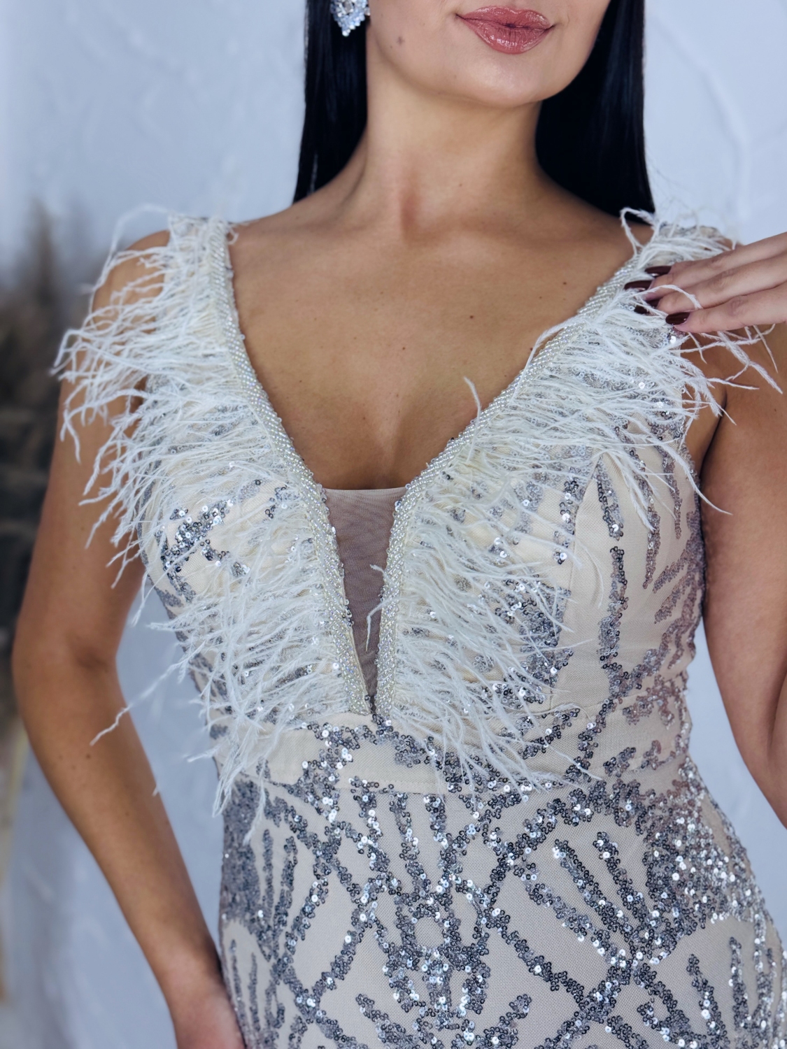 Dámske dlhé béžové spoločenské šaty s flitrami a rozparkom. Zaboduj eleganciou, zmyselnosťou a šarmom v týchto nádherných béžových spoločenských šatách, ktoré očaria už na prvý pohľad. Šaty sú ušité z kvalitného, jemne elastického materiálu, ktorý sa krásne prispôsobí postave a zvýrazní ženské krivky. Béžová farba pôsobí sofistikovane a nežne, pričom flitrové detaily im dodávajú dávku luxusu a trblietavého pôvabu – presne to, čo potrebuješ, aby si zažiarila na každej spoločenskej udalosti. Predná časť šiat je doplnená elegantným rozparkom, ktorý pôsobí zvodne, no stále vkusne. Dlhá silueta opticky predlžuje postavu a vytvára dokonale ženský vzhľad. Zadná časť je navrhnutá tak, aby šaty krásne sedeli a lichotili každej postave.Tento model je ideálnou voľbou na plesy, svadby, večerné oslavy či galavečery, kde chceš byť stredobodom pozornosti. Flitre zachytávajú svetlo pri každom pohybe, vďaka čomu budeš doslova žiariť.