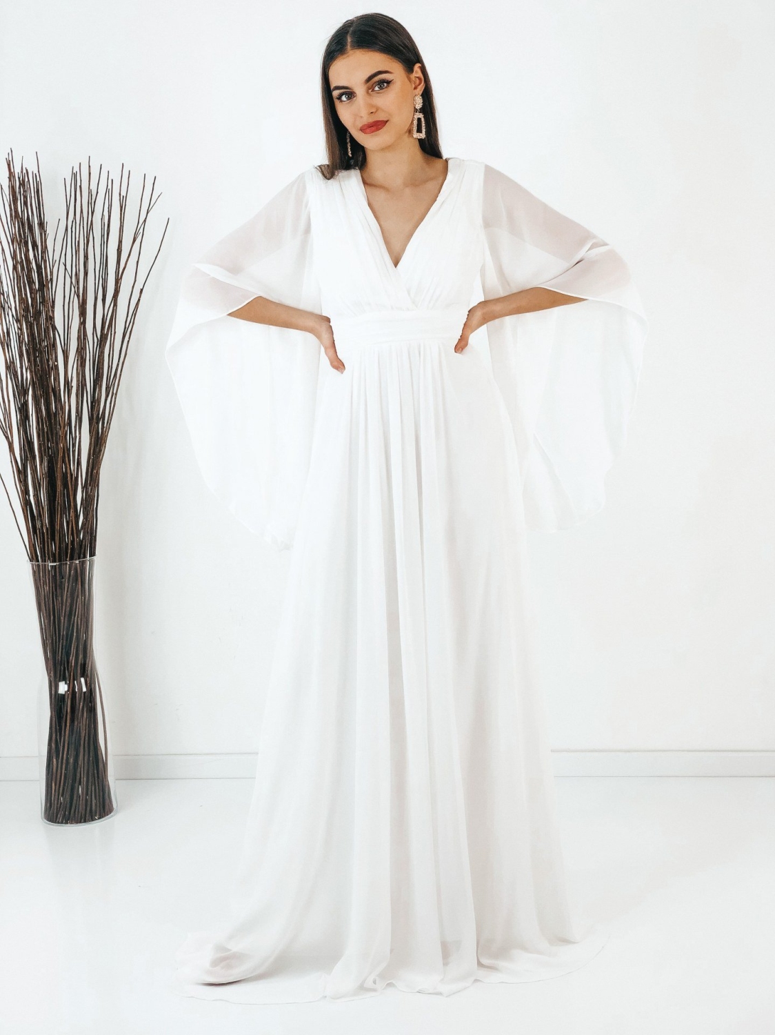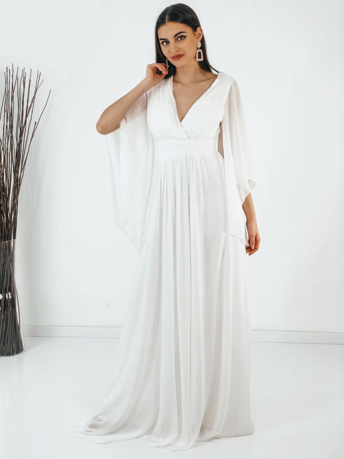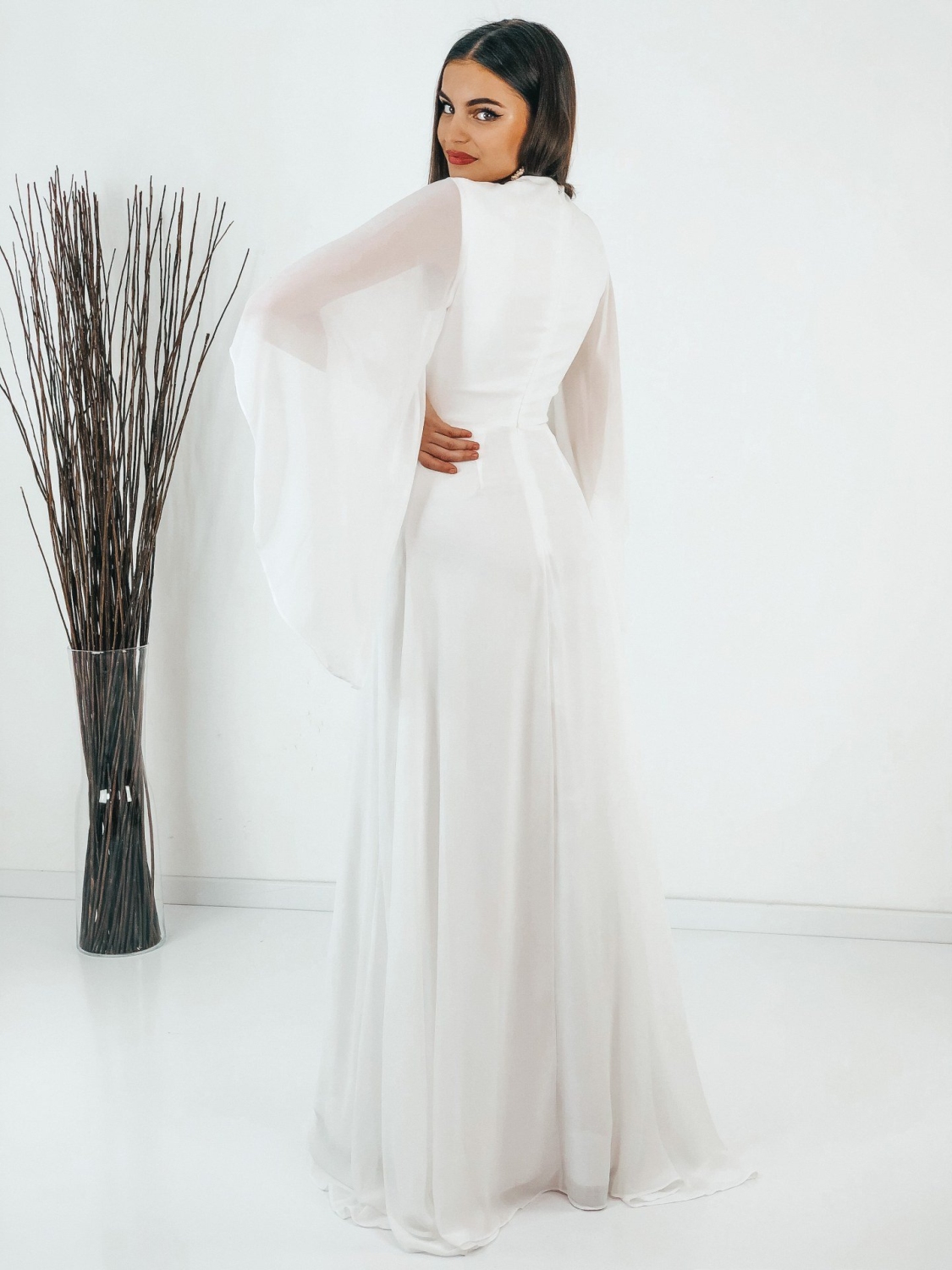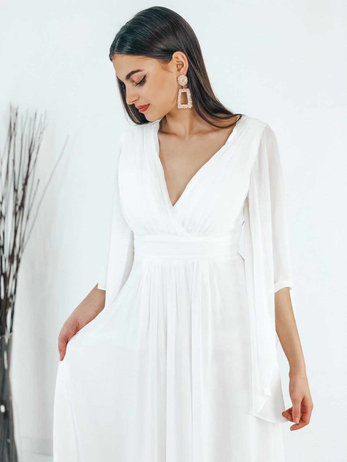 Dlhé spoločenské šaty v bielej farbe, v ktorých zažiari každá dáma. Veľmi luxusný kúsok z našej ponuky, ktorý očarí každú z Vás a samozrejme aj ostatných okolo Vás. Vhodné sú na rôzne spoločenské udalosti ako je svadba, stužková slávnosť či ples. Šaty sú doplnené volánmi a véčkovým výstrihom. Exkluzívny kúsok, ktorý by nemal chýbať žiadnej žene, ktorá má rada kvalitnú a štýlovú módu. Zapínanie šiat vzadu na zips.
