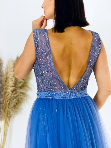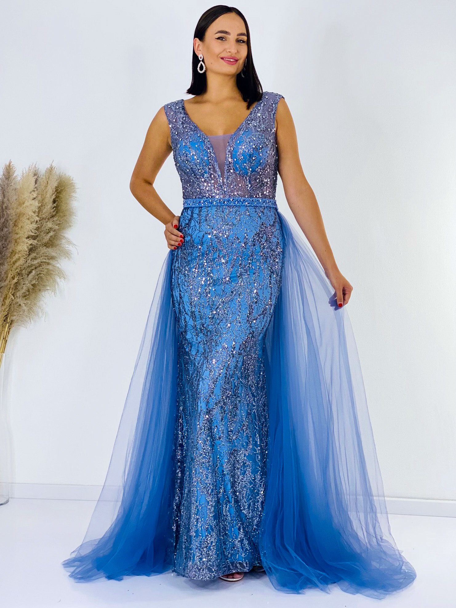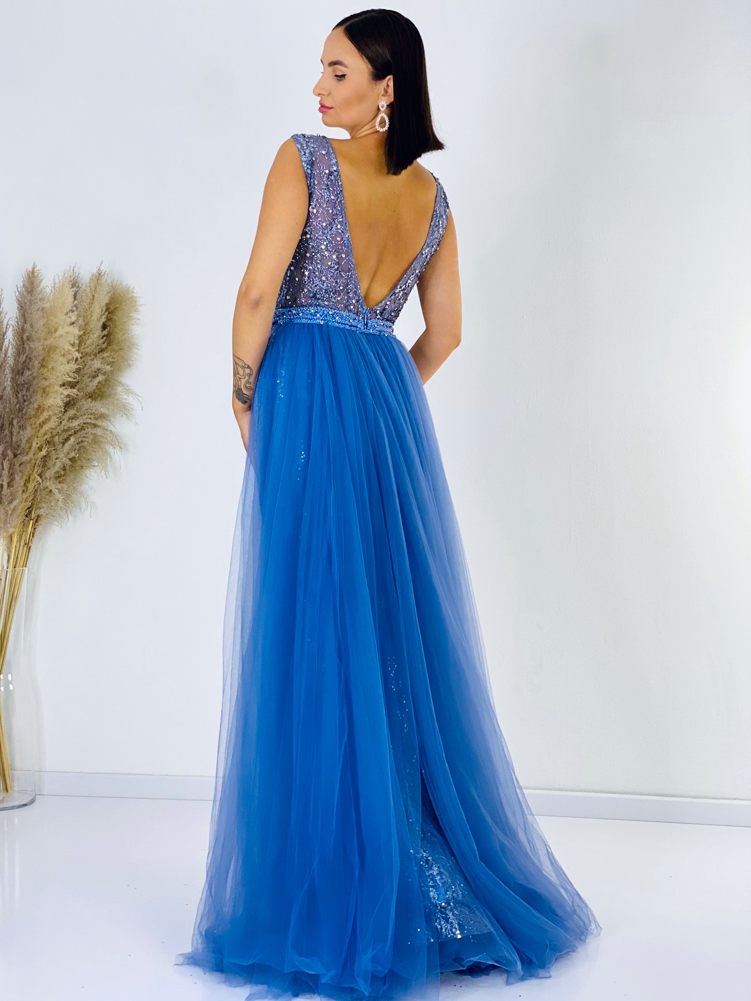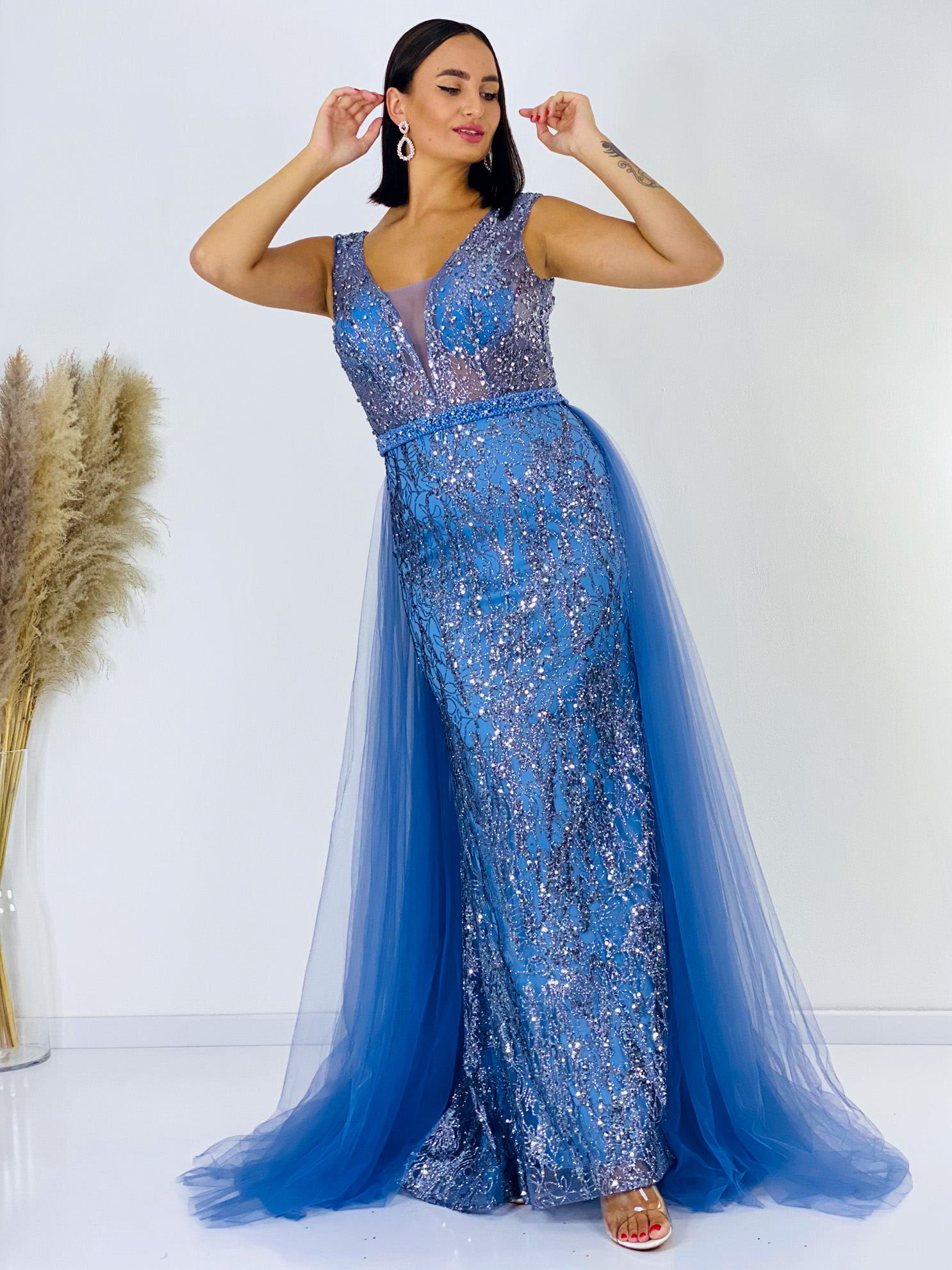 Exkluzívne dlhé spoločenské šaty v trblietavom prevedení, v ktorých zažiari každá dáma. Veľmi luxusný a štýlový kúsok z našej ponuky, ktorý očarí každú z Vás a samozrejme aj ostatných okolo Vás. Vhodné sú na rôzne spoločenské udalosti ako je svadba, stužková slávnosť či ples. Spoločenské šaty majú krásny odhalený výstrih a vystužené prsia. Zapínanie vzadu na zips. Šaty sú mierne elastické, vďaka čomu sa skvelo prispôsobia postave a opticky Vás predĺžia. Vzadu s vlečkou, ktorá je odnímateľná. Modelka meria 175 cm a má oblečenú veľkosť M.
