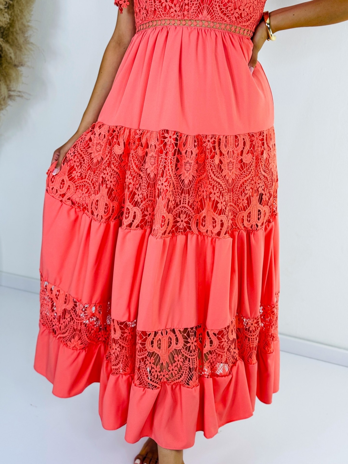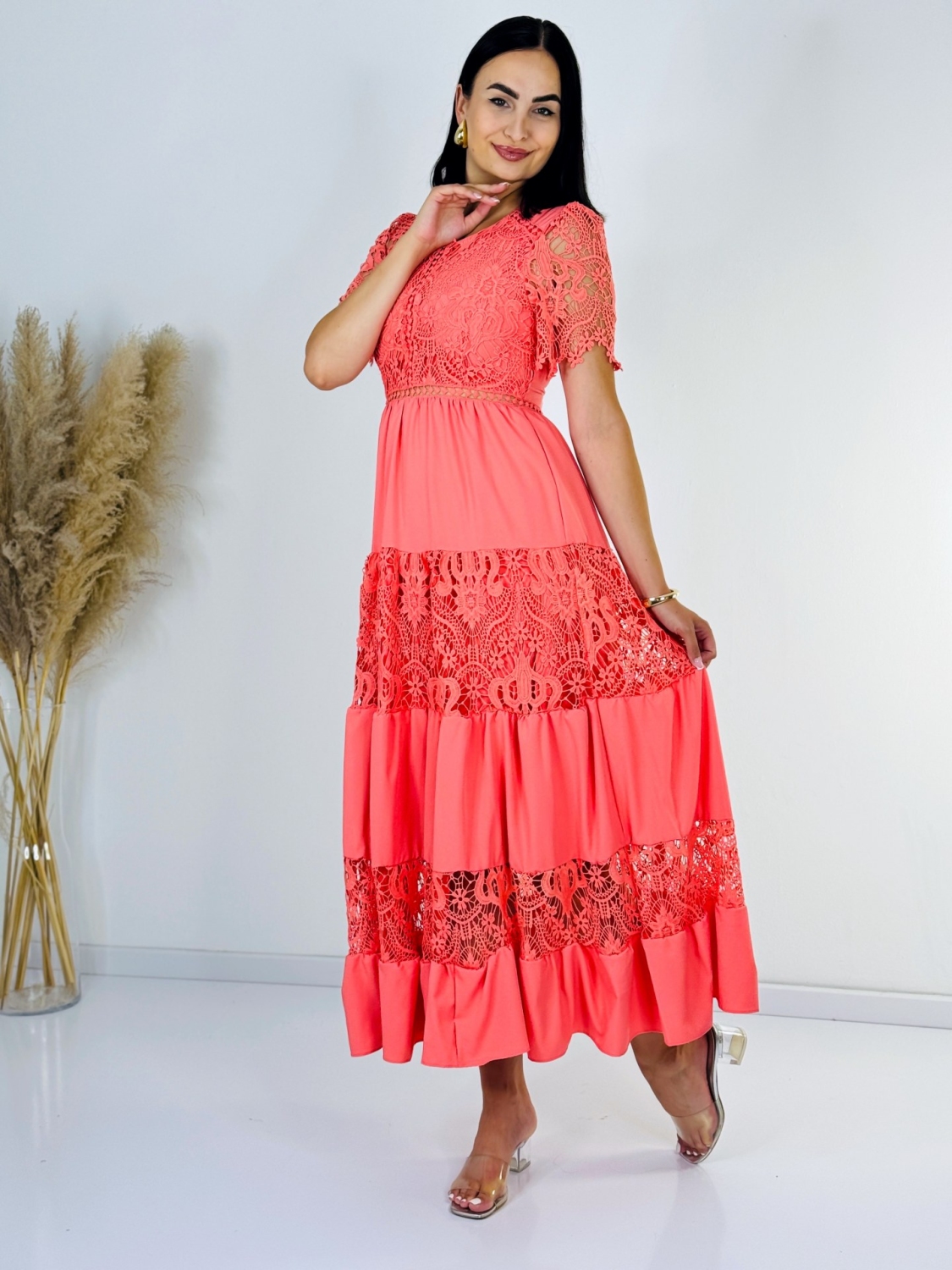 Tieto exkluzívne dámske dlhé čipkované šaty sú dokonalou voľbou pre každú ženu, ktorá chce vyzerať a cítiť sa skvelo. Ich štýlový vzorovaný dizajn zaručuje, že budete vyzerať nádherné a budete sa v nich cítiť sebavedomá. Materiál šiat je príjemný na dotyk a zároveň odolný voči opotrebovaniu. Elegantný strih dodá Vášmu outfitu luxusný a rafinovaný vzhľad. Neváhajte a pridajte si tieto úžasné elegantné šaty do svojho šatníka. Budete v nich vyzerať a cítiť sa fantasticky počas každej spoločenskej príležitosti. Šaty sa zapínajú vzadu na zips. Neváhajte a investujte do tohto nadčasového kúska. Modelka je vysoká 175 cm a oblečenú má veľkosť S/M.
