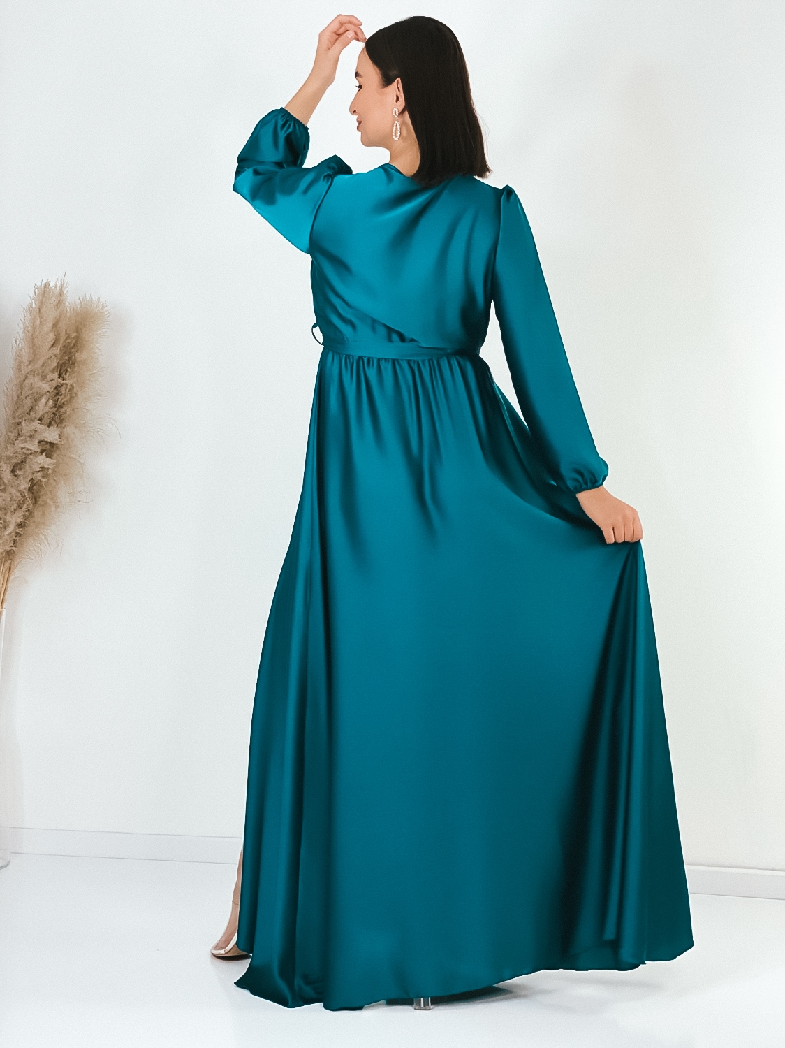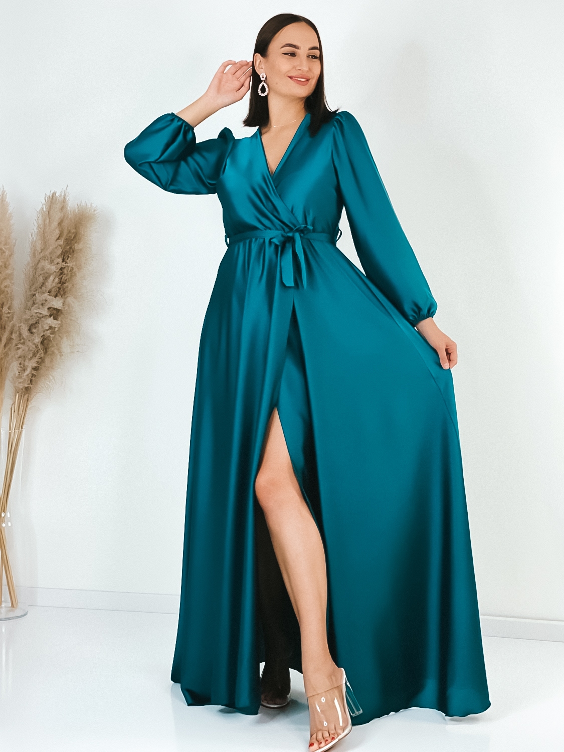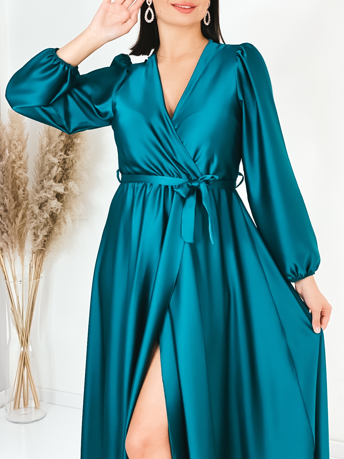Dámske spoločenské šaty v skvelom pohodlnom saténovom prevedení. Univerzalný kúsok šiat, ktorý si môžete prispôsobiť podľa seba a šaty si uviazať podľa vlastného vkusu. Šaty sa vďaka materiálu prispôsobia ihneď Vašej postave. Veľmi luxusný kúsok z našej ponuky, ktorý očarí každú z Vás a samozrejme aj ostatných okolo Vás. Materiál, ktorý Vám dodá šmrnc. Bez zapínania s gumičkou v páse. Vhodné sú na rôzne spoločenské udalosti ako je svadba, stužková slávnosť či ples. Doplnené razporkom v prednej časti. Dlhý 62 cm rukáv. Modelka je vysoká 175 cm a má oblečenú veľkosť UNI.