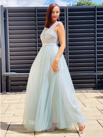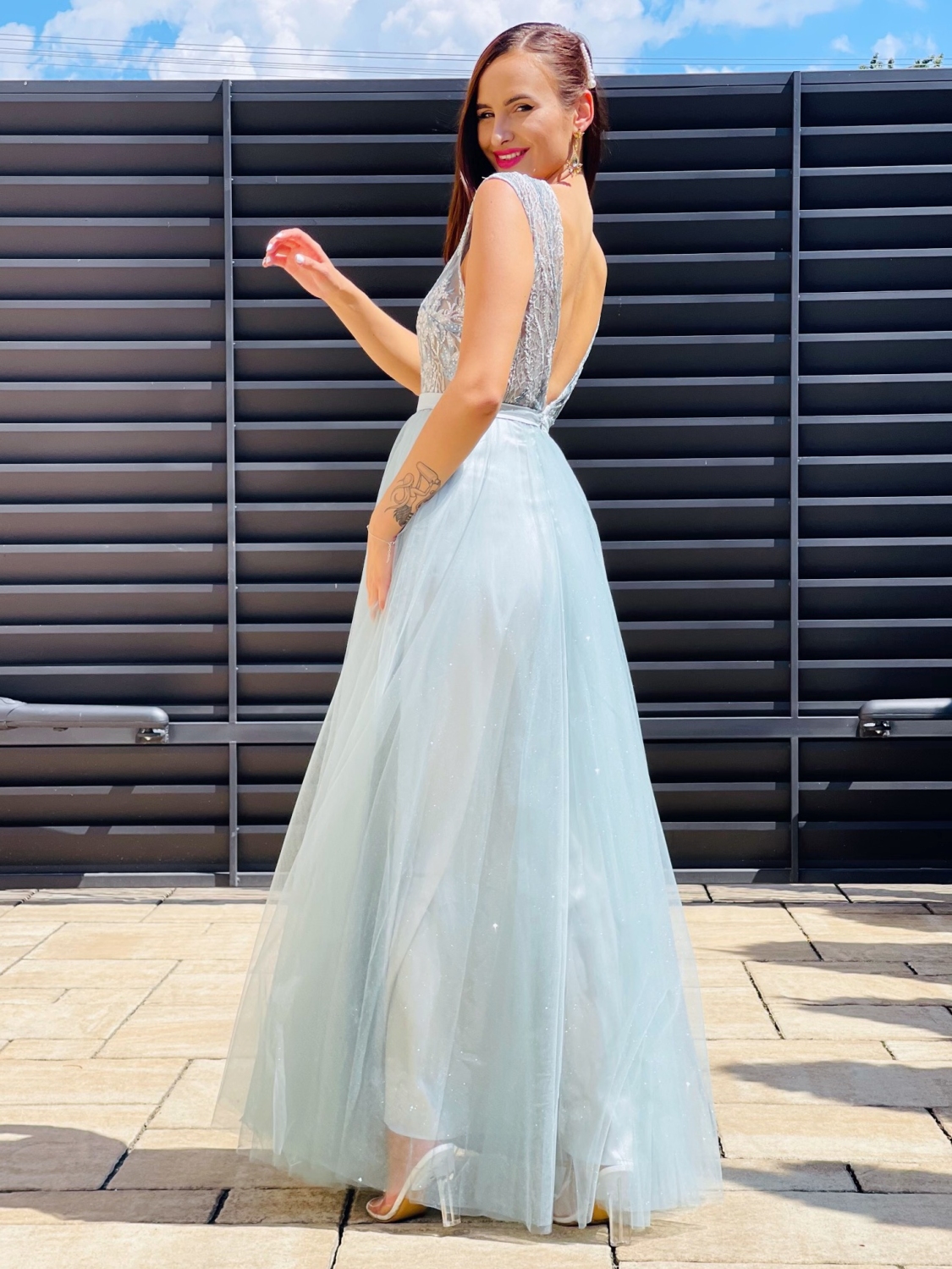 Dámske spoločenské šaty v trblietavom prevedení s tylovou sukňou. Veľmi luxusný kúsok z našej ponuky, ktorý očarí každú z Vás a samozrejme aj ostatných okolo Vás. Jemné trblietky zdobia celé šaty. Zapínanie vzadu na zips. Šaty majú vystúžené prsia. Vhodné sú na rôzne spoločenské udalosti ako je svadba, stužková slávnosť či ples. Modelka je vysoká 175 cm a má oblečenú veľkosť M.