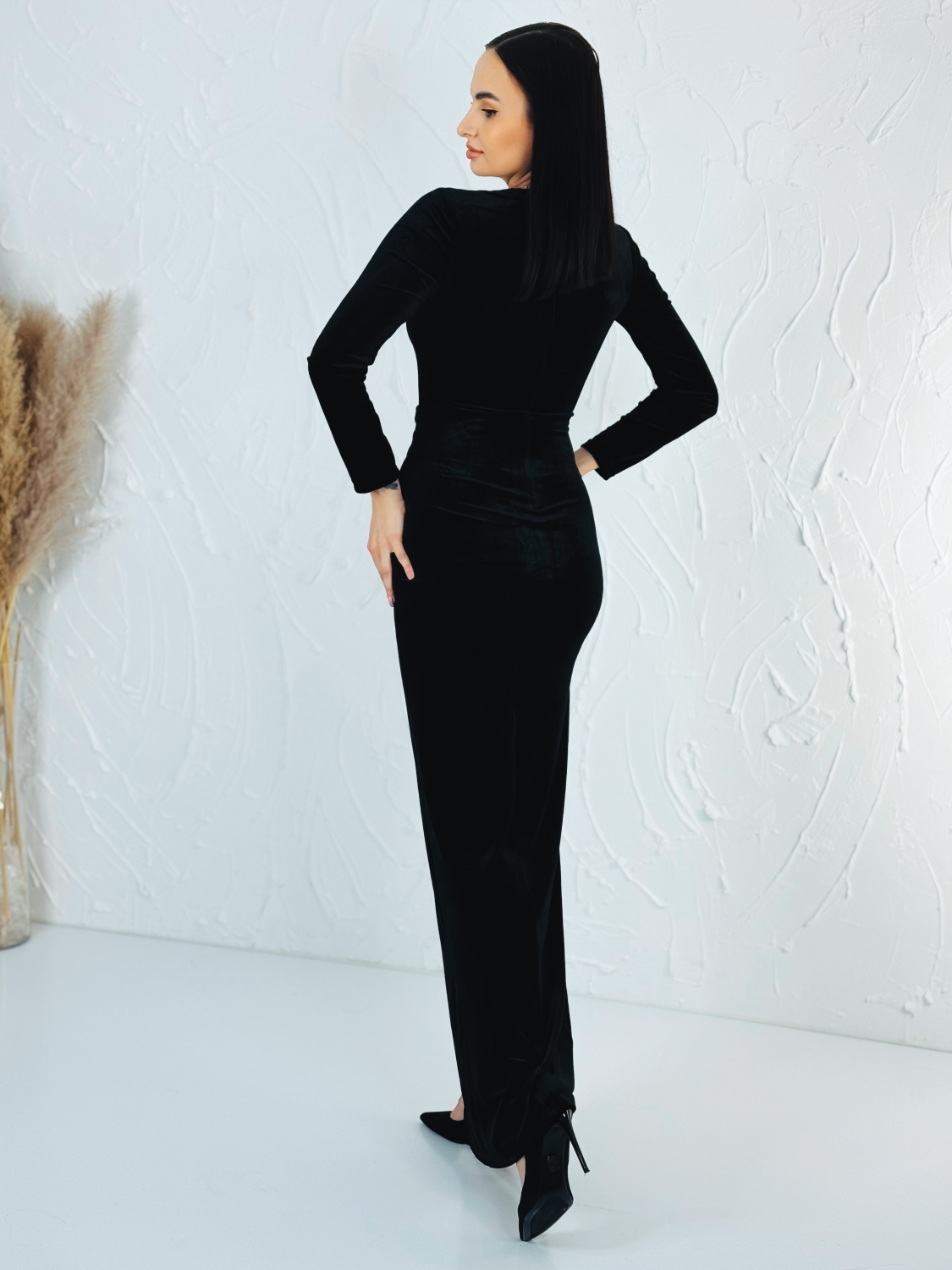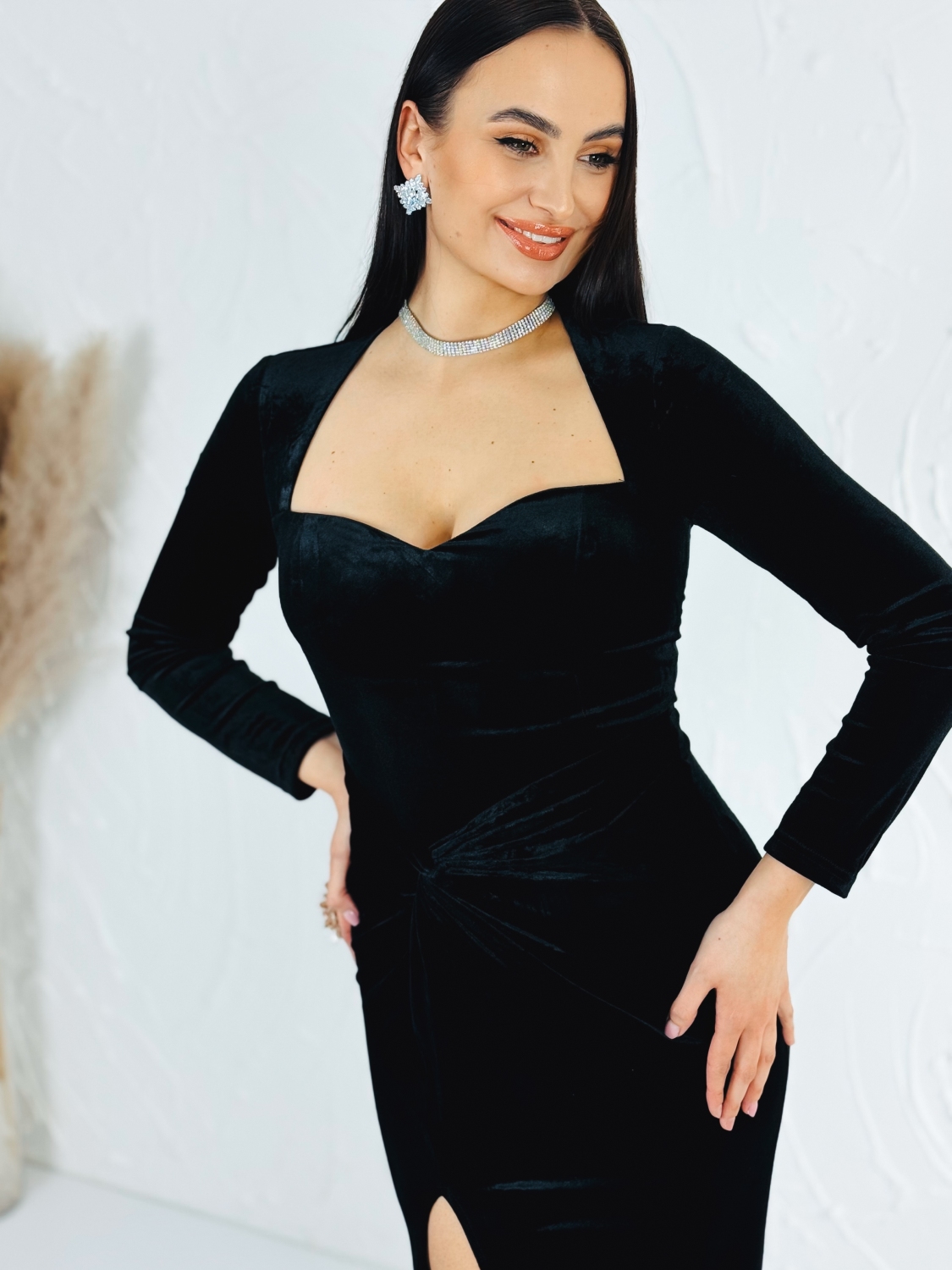 Exkluzívne dlhé spoločenské šaty v zamatovom prevedení, v ktorých zažiari každá dáma. Veľmi luxusný a štýlový kúsok z našej ponuky, ktorý očarí každú z Vás a samozrejme aj ostatných okolo Vás. Vhodné sú na rôzne spoločenské udalosti ako je svadba, stužková slávnosť či ples. Spoločenské šaty majú krásny odhalený výstrih a vystužené prsia. Doplnené sú razporkom. Zapínajú sa vzadu na zips. Šaty sú mierne elastické, vďaka čomu sa skvelo prispôsobia postave a opticky Vás predĺžia. Modelka meria 175 cm a má oblečenú veľkosť S.