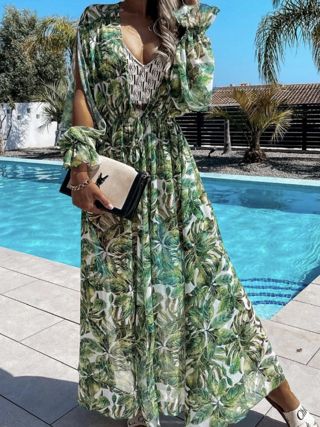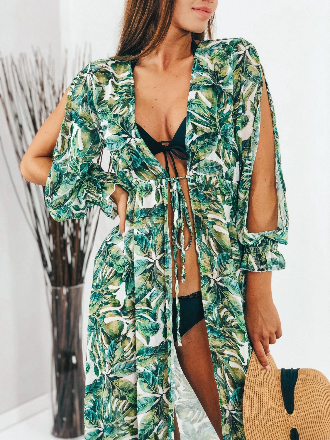 Dámske exkluzívne dlhé vzorované kimono s viazaním v páse. Plážové kimono je všestranný kúsok, ktorý Vám túto sezónu nesmie v šatníku chýbať. Obliecť si ho môžete na bežný deň, alebo na plavky k vode (ako prehoz na plavky). Plážove kimono je neodmysliteľná súčasť plážovej výbavy na toto a určite aj budúce leto, povynná výbava na každú letnú dovolenku, či pobyt pri vode. Letné kimono si obľúbi každá z Vás. Je zložené z pohodlného a kvalitného materiálu. Modelka má výšku 173 cm a oblečenú má veľkosť UNI.