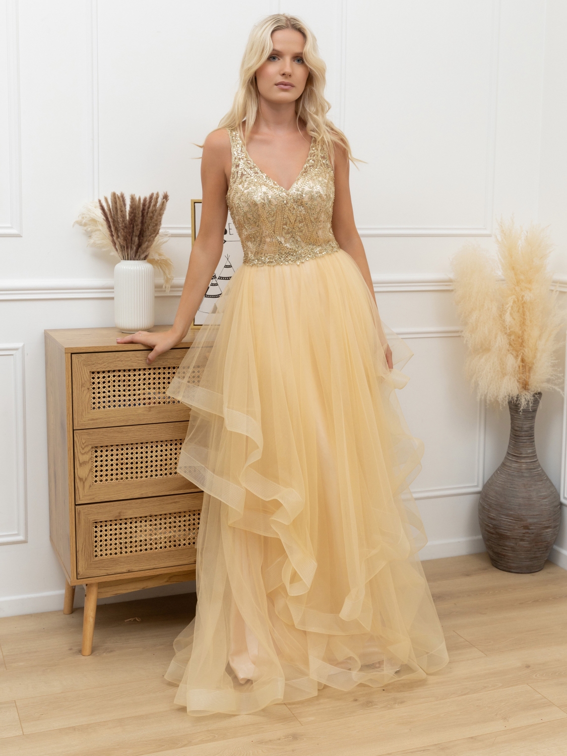 Tieto elegantné dámske spoločenské šaty sú dokonalou voľbou pre každú príležitosť, kde chcete očariť štýlom a ženskosťou. Vrchná časť šiat je zdobená jemnými kamienkami, ktoré dodávajú šatám sofistikovaný a iskrivý vzhľad, zatiaľ čo precízne zapínanie na zips vzadu zabezpečuje pohodlné a pevné usadenie na postave. Sukňa je vyrobená z ľahkého tylu, ktorý vytvára krásny nadýchaný efekt a elegantný plynulý pohyb pri každom kroku. Šaty zvýrazňujú ženské krivky a zároveň poskytujú komfort počas nosenia, čo ich robí ideálnym spoločníkom na plesy, svadby, spoločenské večery alebo iné slávnostné udalosti. Vďaka kombinácii lesku kamienkov na vrchu a vzdušného tylu v spodnej časti pôsobia šaty zároveň luxusne aj romanticky. Ich nadčasový dizajn zaručuje, že sa stanú nezabudnuteľným kúskom vo vašom šatníku. Tieto spoločenské šaty sú dostupné v rôznych veľkostiach a sú stvorenou investíciou do vašej elegancie a sebavedomia, ktoré si každý všimne.