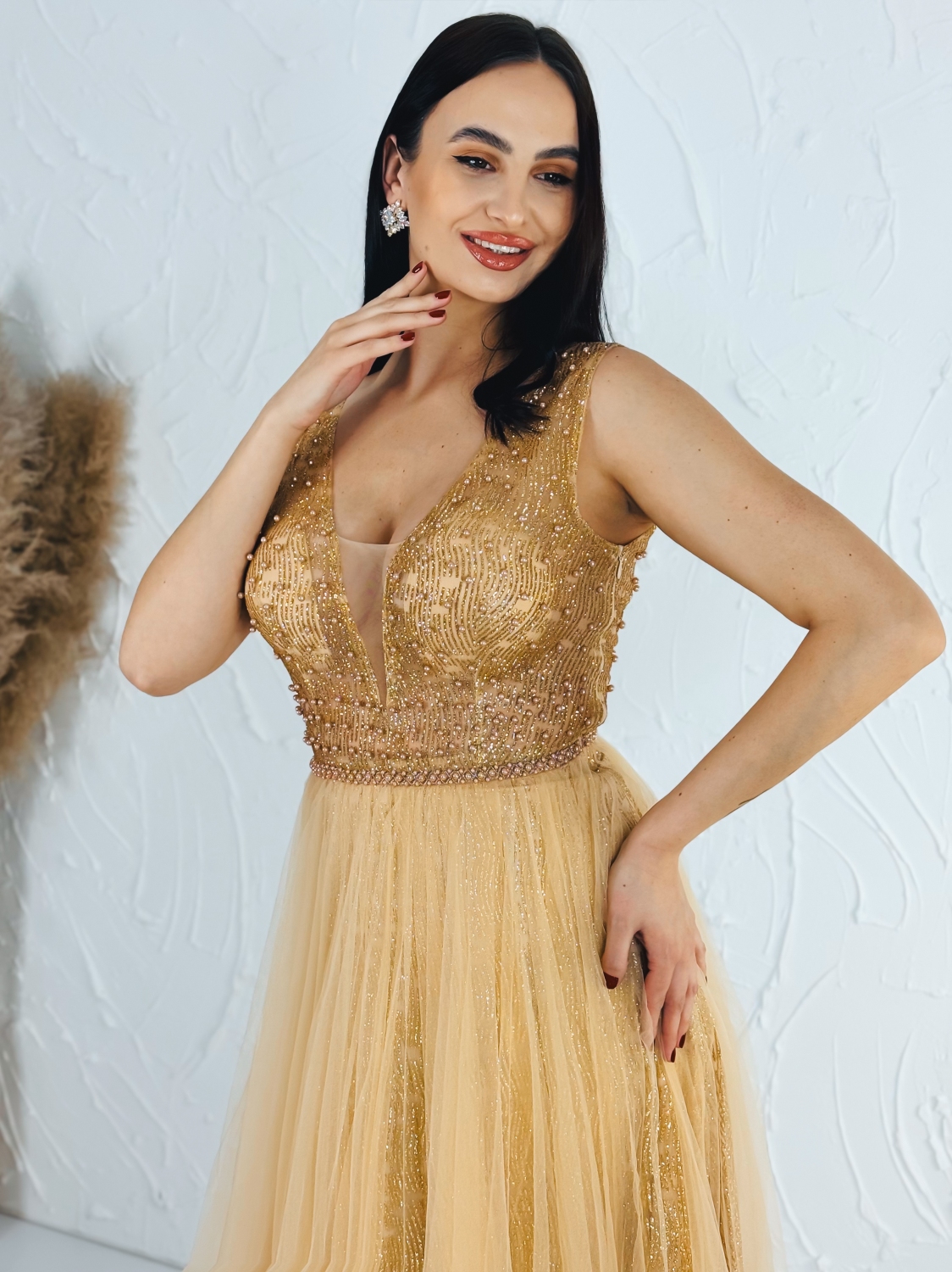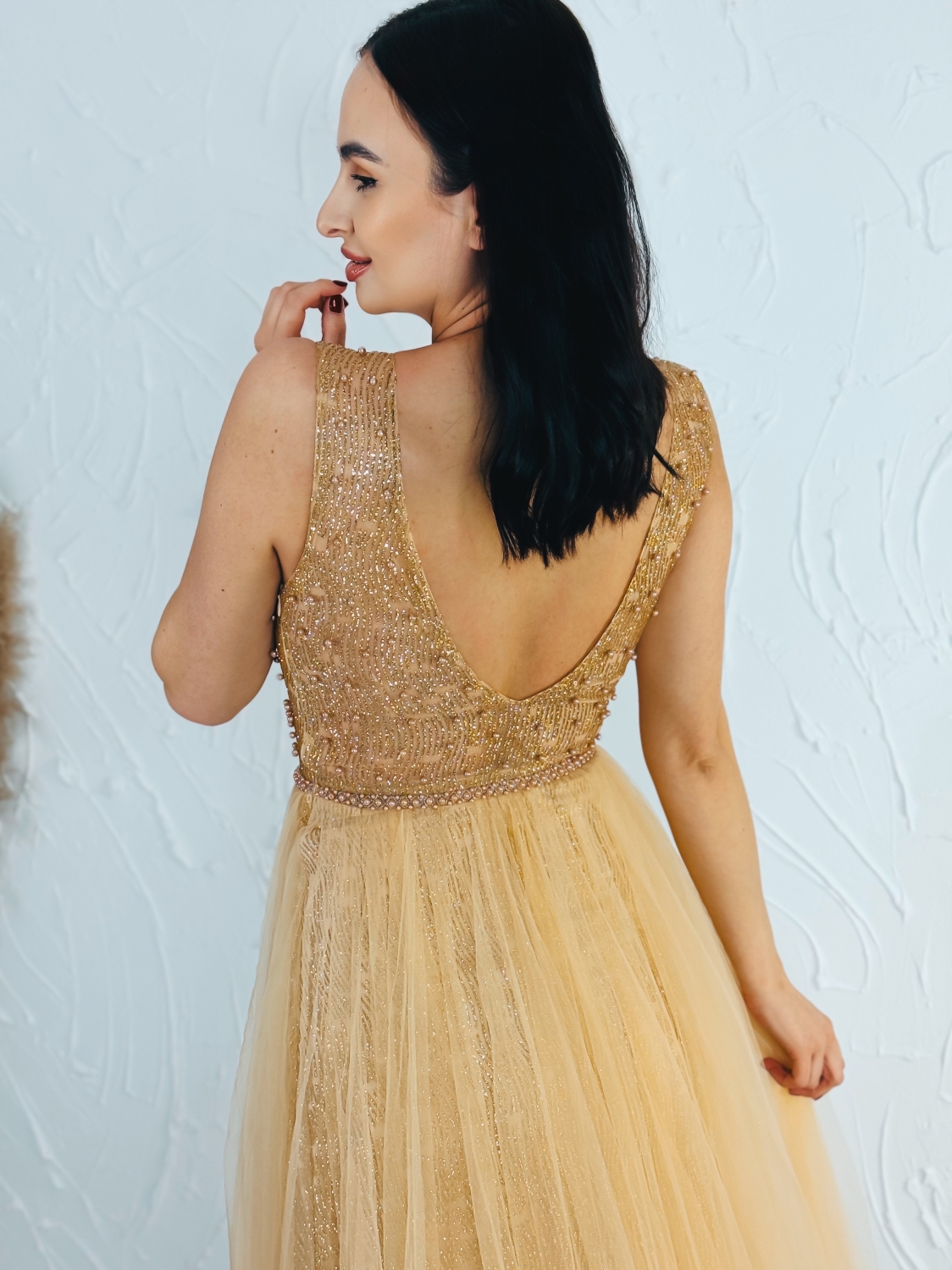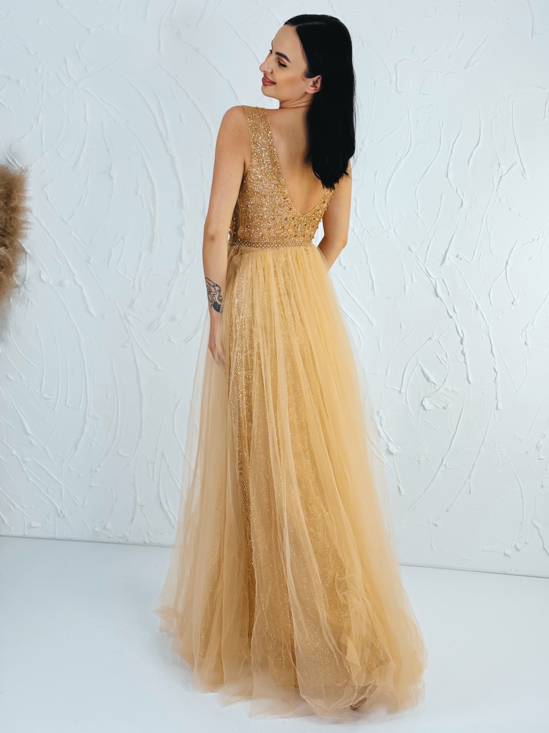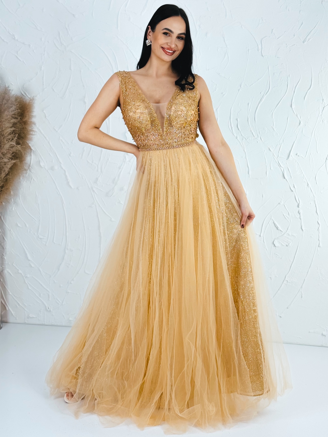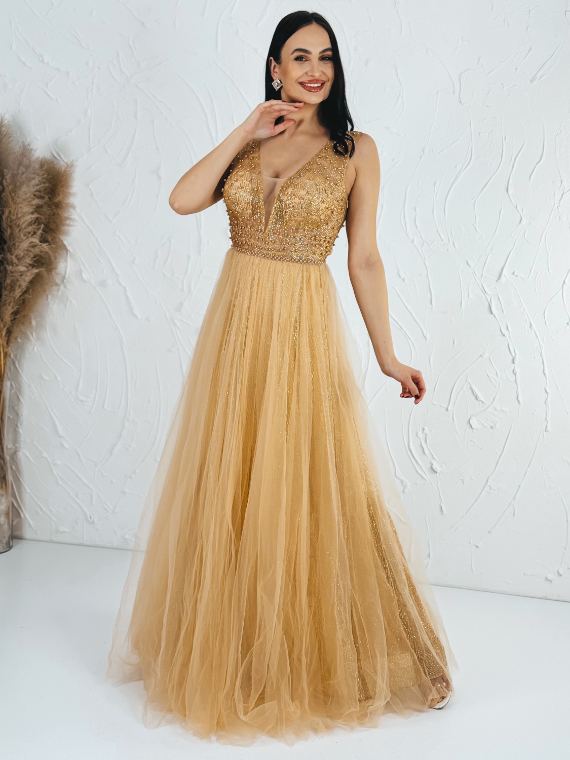 Tieto dámske spoločenské šaty sú stelesnením elegancie, jemného lesku a ženského pôvabu. Navrhnuté sú s dôrazom na detaily, ktoré z nich robia dokonalý kúsok pre významné príležitosti ako plesy, svadby, galavečery alebo večerné oslavy. Jedinečným prvkom šiat je zdobenie kamienkami, ktoré dodáva modelu sofistikovaný a luxusný vzhľad. Kamienky odrážajú svetlo pri každom pohybe, čím vytvárajú jemný trblietavý efekt, ktorý upúta pozornosť a podčiarkne exkluzivitu šiat. Šaty sa vzadu zapínajú na zips, čo zabezpečuje perfektné priliehanie k postave a zároveň uľahčuje obliekanie. Tento praktický detail je elegantne zakomponovaný tak, aby nenarúšal dizajn a pôsobil hladko a nenápadne. Strih šiat je premyslený tak, aby lichotil postave, zvýraznil ženské krivky a zároveň poskytol komfort pri nosení. Horná časť môže byť jemne tvarovaná, zdôrazňovať dekolt a ramená, zatiaľ čo spodná časť je splývavá alebo áčková, čo opticky zoštíhľuje siluetu a dodáva šatám ľahkosť a pohyb.