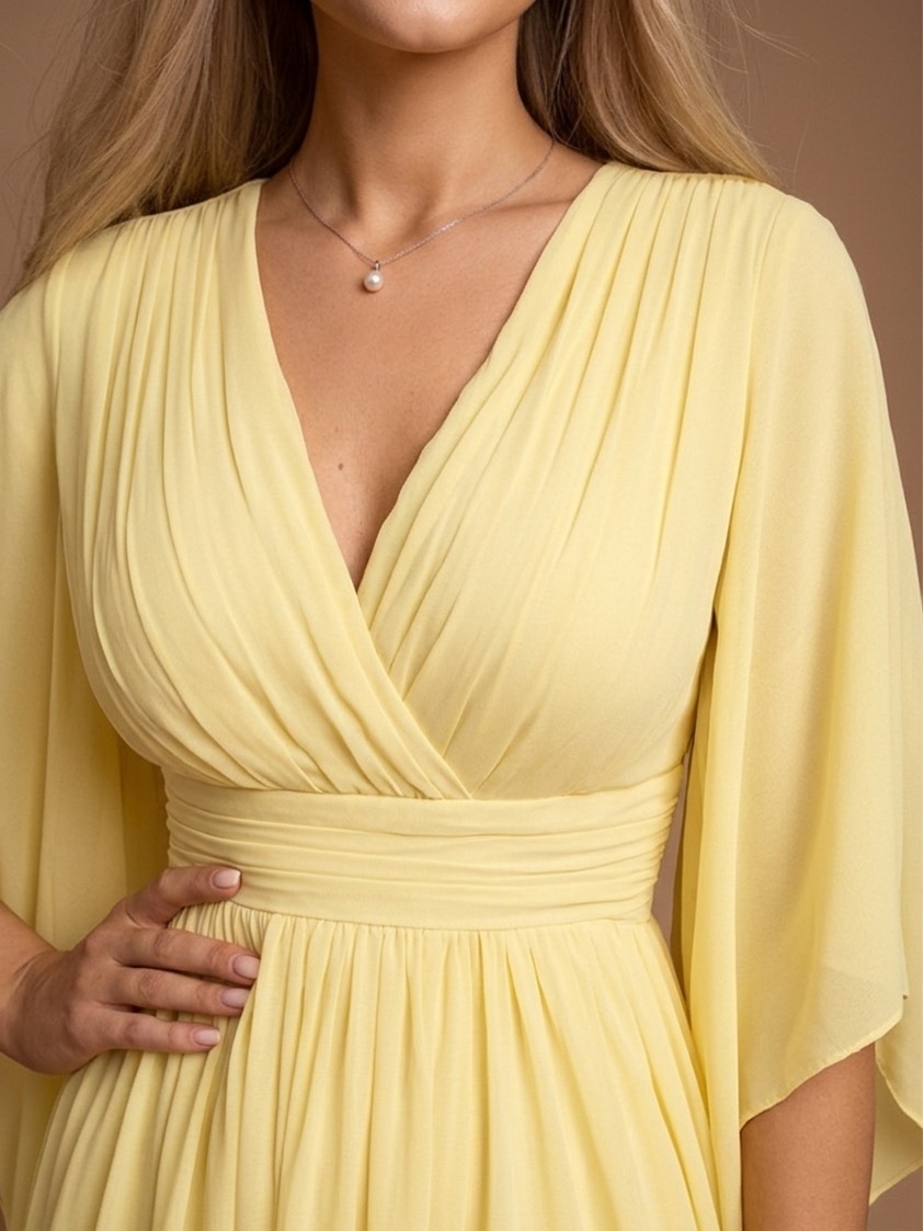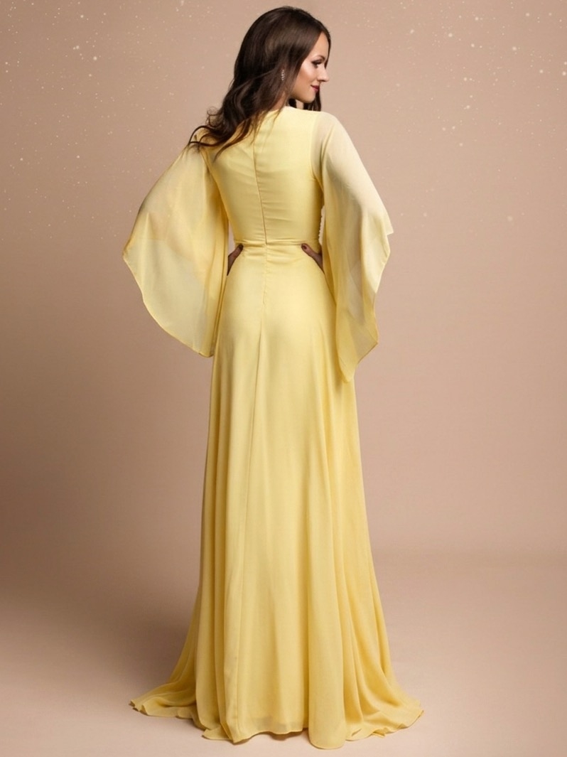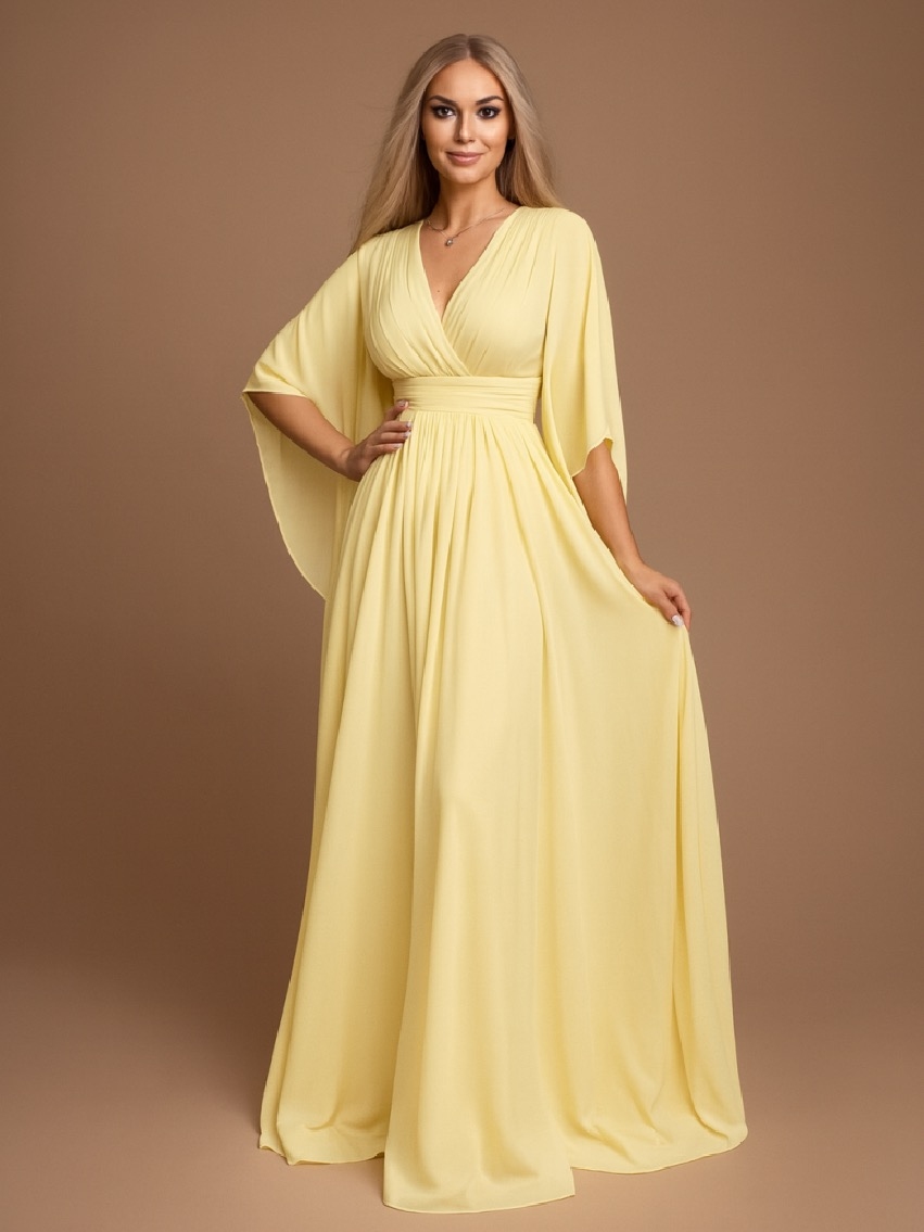 Dlhé spoločenské šaty v žltej farbe, v ktorých zažiari každá dáma. Veľmi luxusný kúsok z našej ponuky, ktorý očarí každú z Vás a samozrejme aj ostatných okolo Vás. Vhodné sú na rôzne spoločenské udalosti ako je svadba, stužková slávnosť či ples. Šaty sú doplnené volánmi a véčkovým výstrihom. Exkluzívny kúsok, ktorý by nemal chýbať žiadnej žene, ktorá má rada kvalitnú a štýlovú módu. Zapínanie šiat vzadu na zips.