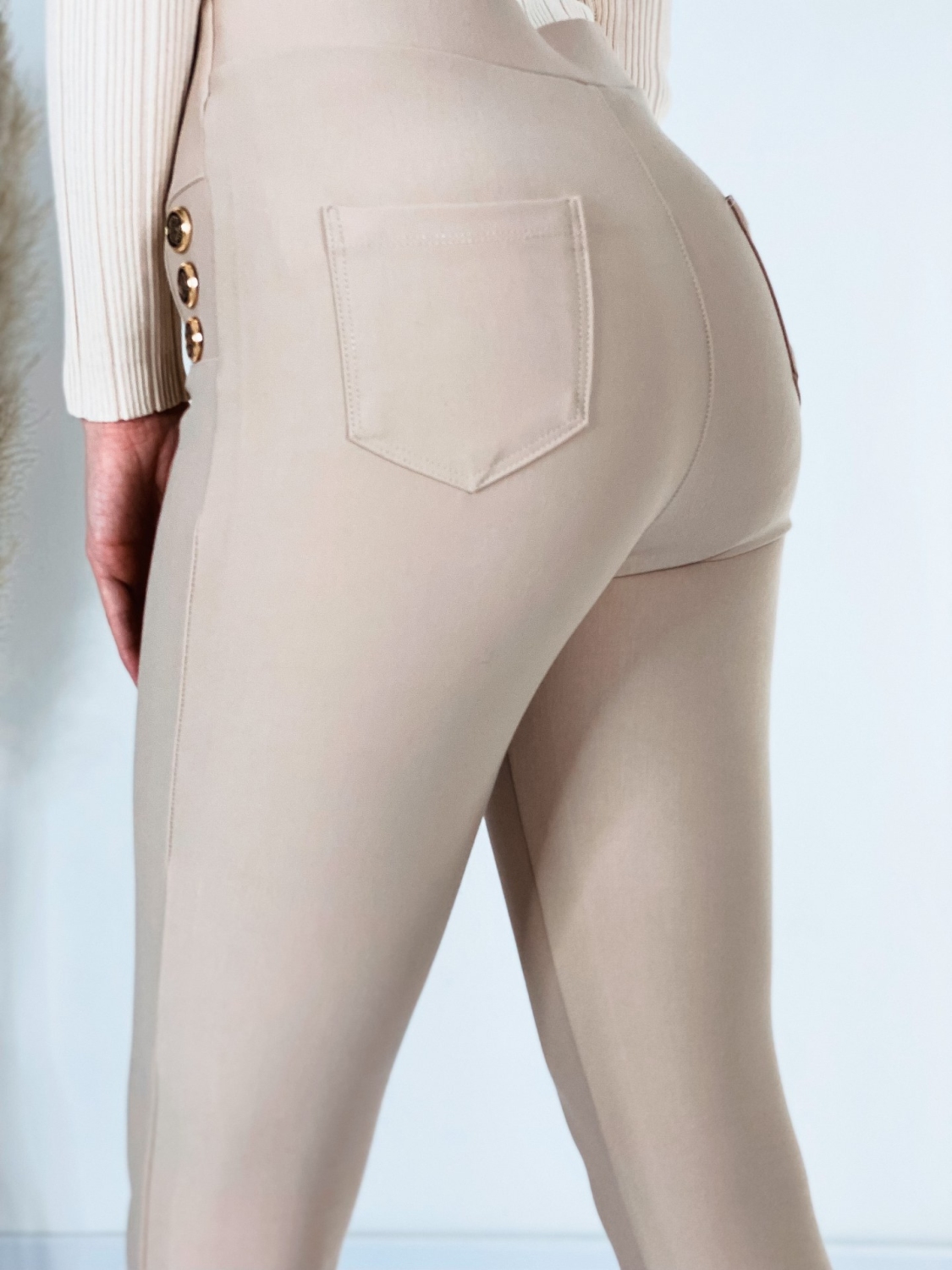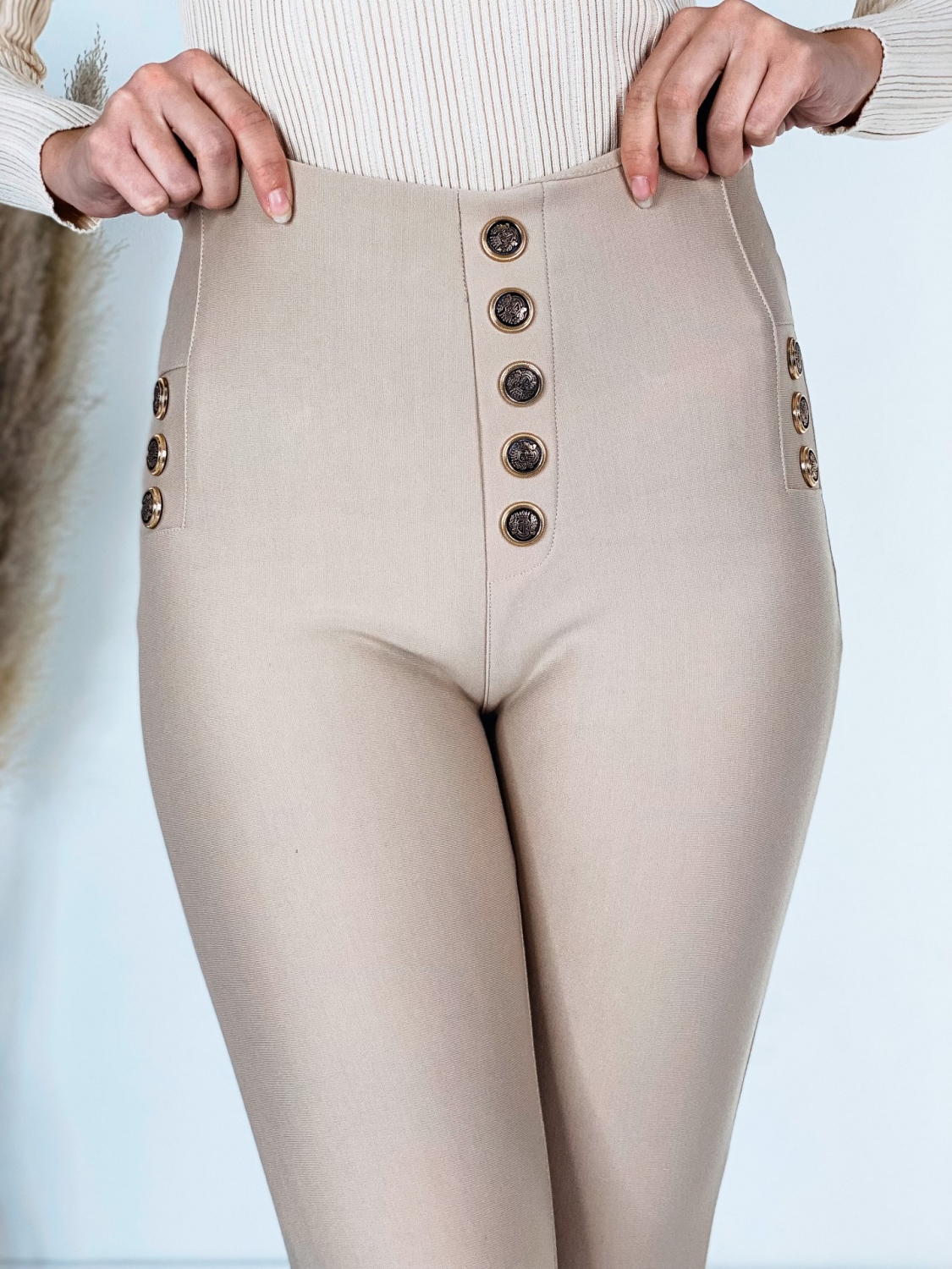 Dámske elegantné nohavice s vysokým pásom a zlatými gombíkmi, ktoré majú perfektný strih a vyrobené sú z príjemného a mierne elastického materiálu. V páse sú taktiež elastické. Pohodlný strih si okamžite zamilujete. Ihneď zalichotia Vašej postave. Doprajte svojej pokožke maximálny komfort. Bez zapínania. Obujte si k nim lodičky, mokasíny alebo sandále, dolaďte zvyšok outfitu a vyrazte v trendy kúsku kamkoľvek, nikdy nič nepokazíte. Bez vreciek. Modelka je vysoká 173 cm a má oblečenú veľkosť S.