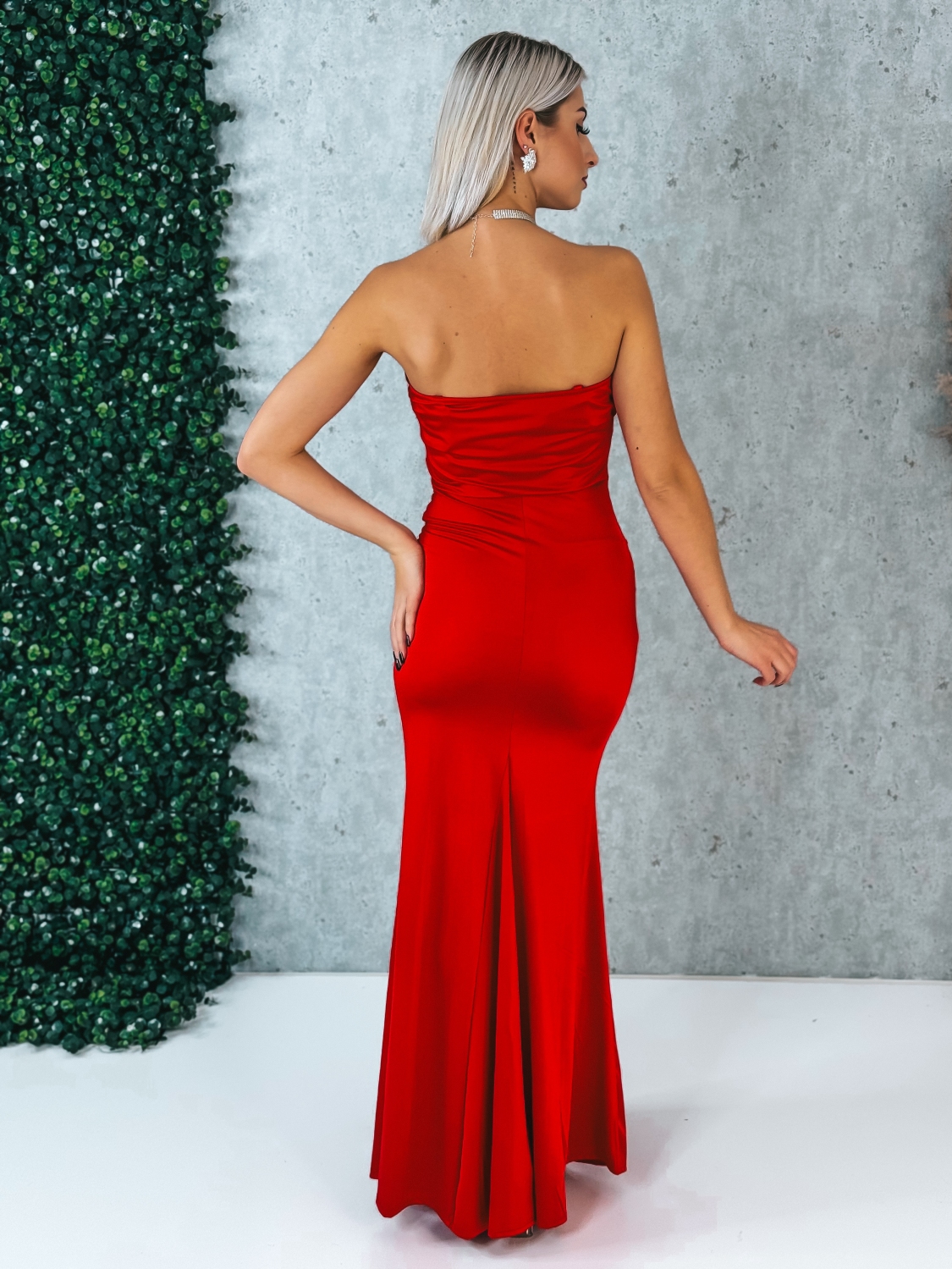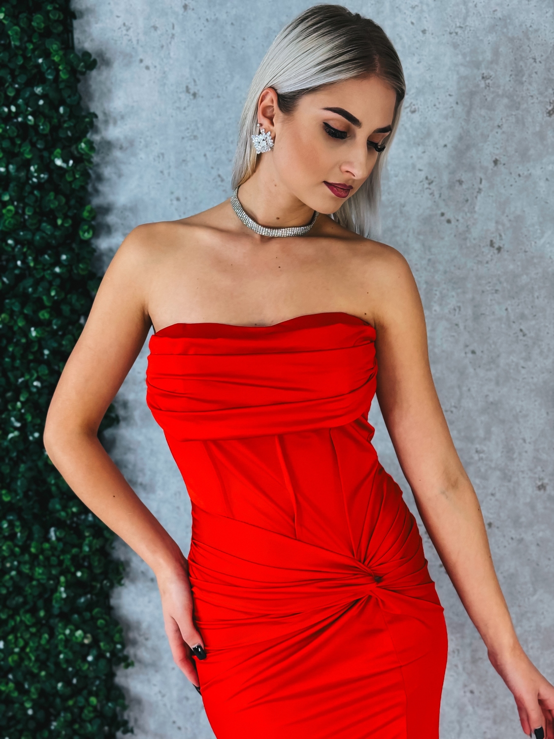 Tieto elegantné dámske spoločenské šaty sú stelesnením ženskosti a sofistikovanosti. Priliehavý elastický materiál sa dokonale prispôsobí postave, zvýrazní siluetu a zároveň poskytuje komfort pri nosení počas celej udalosti. Dominantným prvkom je efektné drapovanie s twist detailom v oblasti pásu, ktoré opticky zoštíhľuje a krásne tvaruje postavu. Vysoký rozparok dodáva modelu zmyselnosť a zároveň umožňuje pohodlný pohyb. Vrchná časť pôsobí elegantne a čisto, pričom šaty majú ramienka, ktoré zabezpečujú lepšiu oporu – na fotografii sú nenápadne skryté. Zapínanie je riešené praktickým zipsom na zadnej strane, vďaka čomu sa šaty jednoducho obliekajú a perfektne sedia.