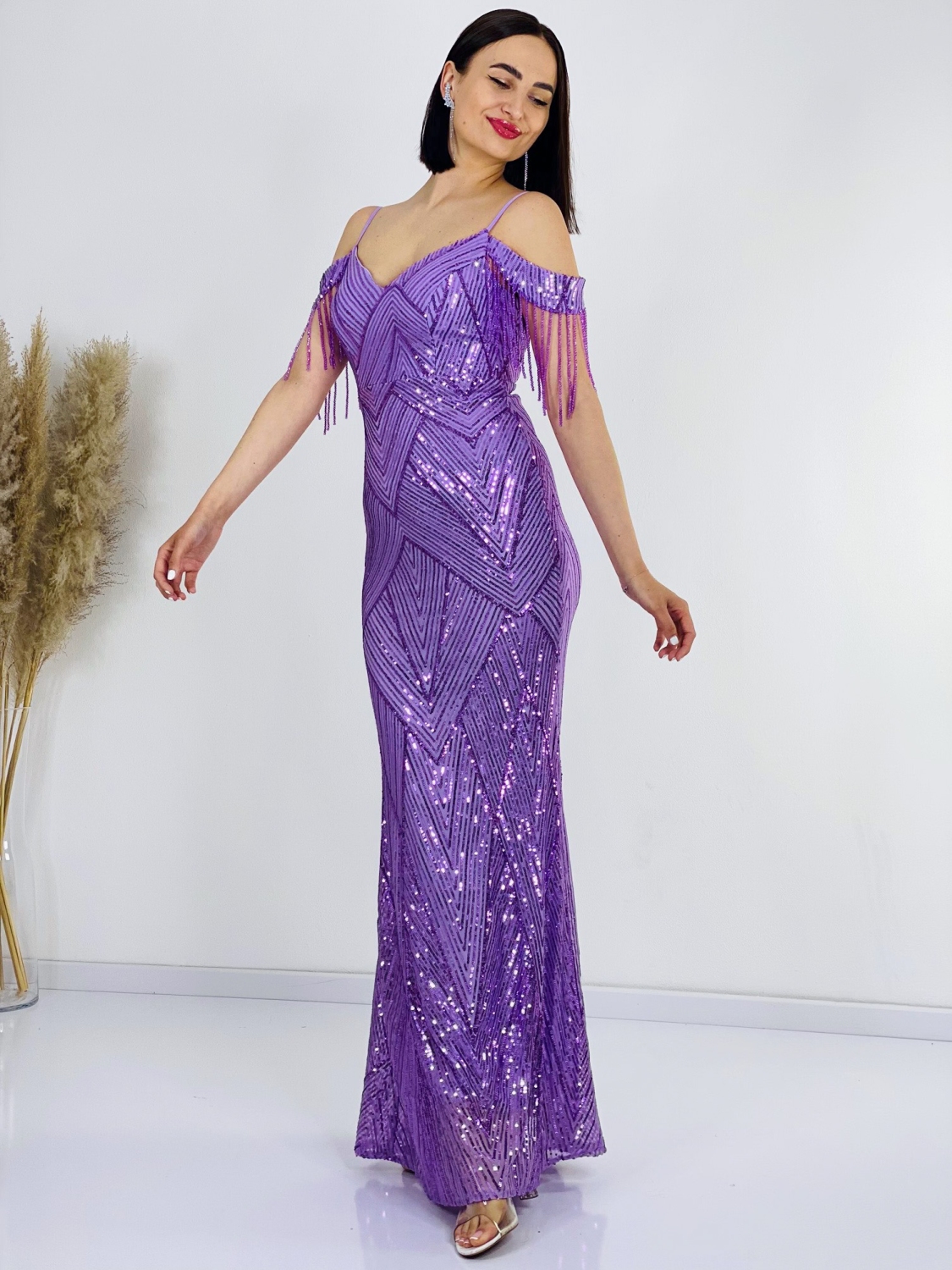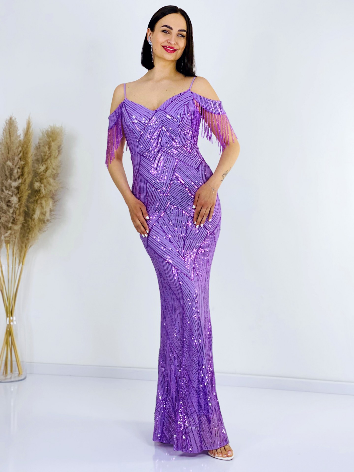 Dámske exkluzívne dlhé spoločenské šaty vo fialovej farbe s flitrami po celej dĺžke. Šaty sú vyrobené z kvalitného materiálu v skvelom strihu. Vhodné sú na rôzne udalosti ako je svadba alebo ples. Šaty pôsobia naozaj elegantne a luxusne. Vzadu sa zapínajú na zips. Kvalitný kúsok v TOP zaujímavom prevedení. Nádherne luxusné prevedenie si zamiluje každa z Vás. Vďaka týmto šatám určite zažiarite a budete sa cítiť jedinečne. Šaty sa krásne ligocu. Modelka je vysoká 175 cm a má oblečenú veľkosť M.