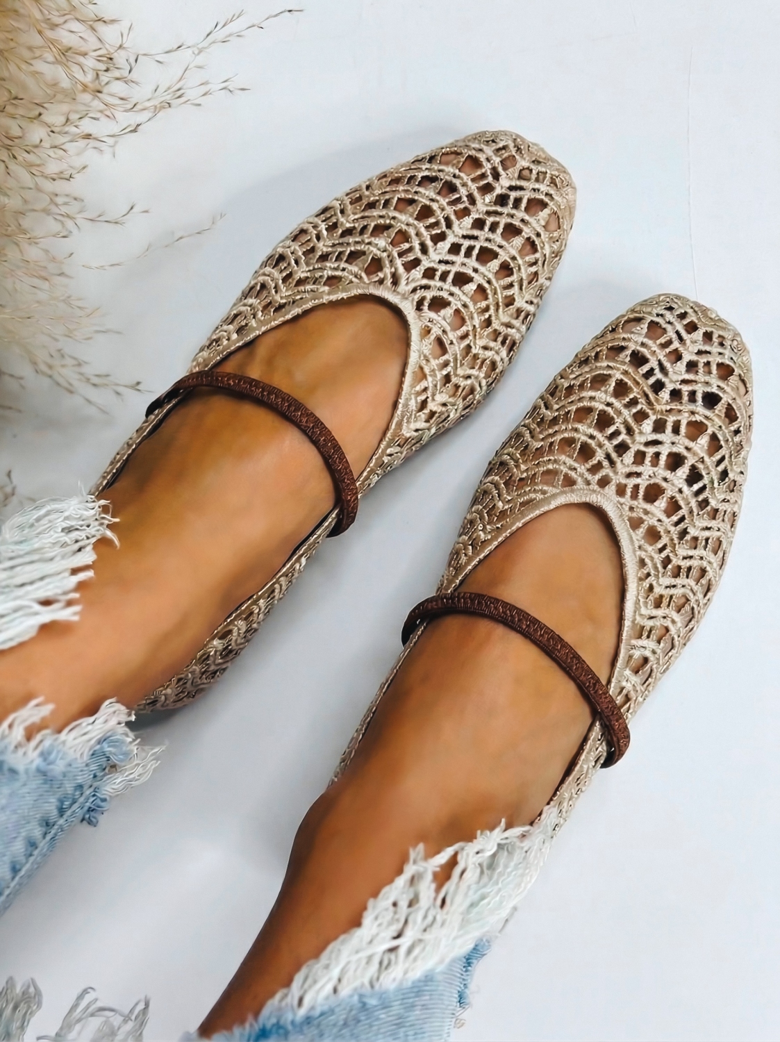 Tieto dámske háčkované baleríny v boho štýle sú dokonalým spojením pohodlia, originality a prirodzenej elegancie. Sú háčkované s dôrazom na detail, vďaka čomu pôsobia jedinečne a jemne zároveň. Ich vzdušný dizajn umožňuje chodidlám dýchať, čo z nich robí ideálnu voľbu na teplé jarné a letné dni. Boho štýl, ktorý tieto baleríny reprezentujú, je charakteristický svojou ležérnosťou, slobodou a prirodzenosťou. Jemná háčkovaná štruktúra dodáva topánkam romantický a ženský nádych, pričom sa ľahko kombinujú s rôznymi outfitmi – od šiat, cez sukne až po rifľové šortky či ľahké nohavice. Vnútorná časť je navrhnutá tak, aby poskytovala maximálne pohodlie aj pri celodennom nosení. Mäkká podrážka sa prispôsobí chodidlu a zabezpečí príjemný pocit pri každom kroku. Vďaka flexibilite materiálu sa baleríny jemne prispôsobia tvaru nohy, čím znižujú tlak a zvyšujú komfort. Tieto baleríny sú ideálne pre ženy, ktoré milujú prirodzený štýl a chcú sa odlíšiť od bežnej ponuky. Každý pár je originál, čo z nich robí nielen praktický, ale aj štýlový doplnok do vášho šatníka.