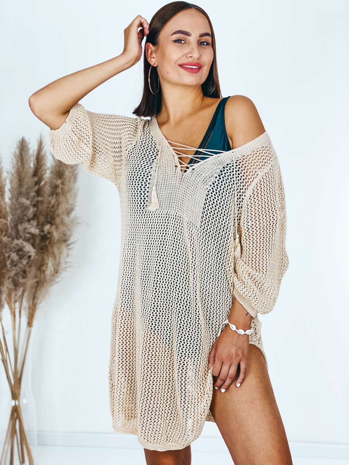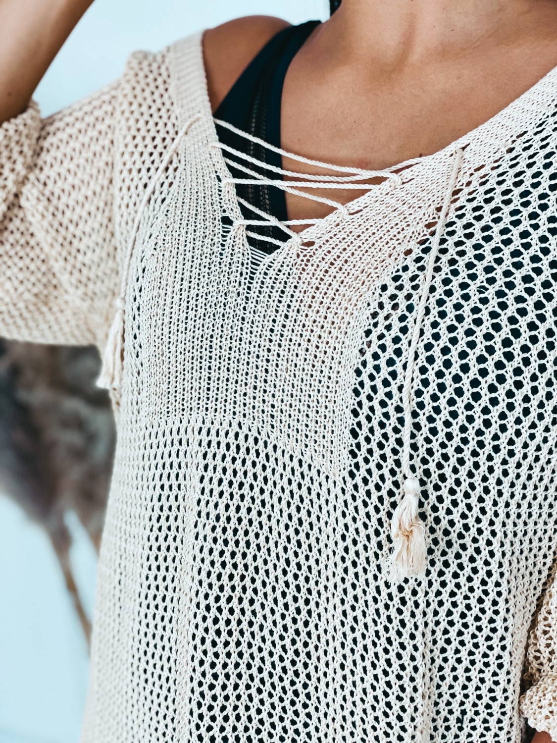 Dámske exkluzívne háčkované kimono s viazaním vo svojej vrchnej časti. Plážové kimono je všestranný kúsok, ktorý Vám túto sezónu nesmie v šatníku chýbať. Obliecť si ho môžete na bežný deň, alebo na plavky k vode (ako prehoz na plavky). Plážove kimono je neodmysliteľná súčasť plážovej výbavy na toto a určite aj budúce leto, povynná výbava na každú letnú dovolenku, či pobyt pri vode. Letné kimono si obľúbi každá z Vás. Je zložené z pohodlného a veľmi kvalitného materiálu. Modelka má výšku 175 cm a oblečenú má veľkosť UNI.