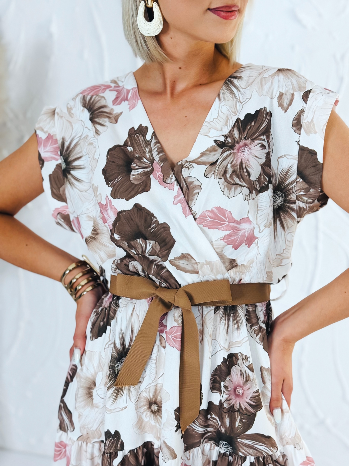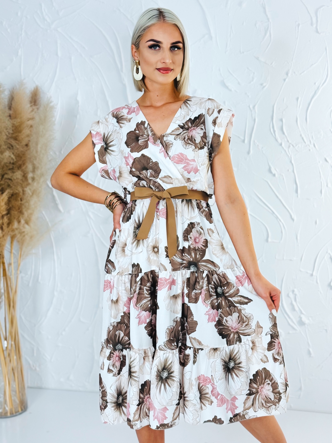 Dámske kvetované šaty áčkového strihu s hnedým opaskom a véčkovým výstrihom sú ideálnou voľbou na letné dni, dovolenky aj chvíle oddychu, keď sa chceš cítiť pohodlne a zároveň vyzerať štýlovo. Ich ženský dizajn spája ľahkosť, sviežosť a praktickosť v jednom kúsku, ktorý si rýchlo obľúbiš. Áčkový strih je obľúbený pre svoju schopnosť krásne lichotiť rôznym typom postavy. Jemne zvýrazní hornú časť siluety a voľne splýva smerom nadol, čím poskytuje pohodlie pri pohybe a príjemný pocit počas celého dňa. Hnedý opasok zvýrazní pás a dodáva šatám upravený a harmonický vzhľad. Véčkový výstrih pôsobí elegantne a žensky, opticky predlžuje krk a dodáva celému modelu jemnosť. Kvetovaný vzor prináša romantický a letný nádych, vďaka čomu sú šaty perfektné na prechádzky pri mori, večerné posedenia, výlety, záhradné oslavy alebo bežné nosenie počas teplých dní.