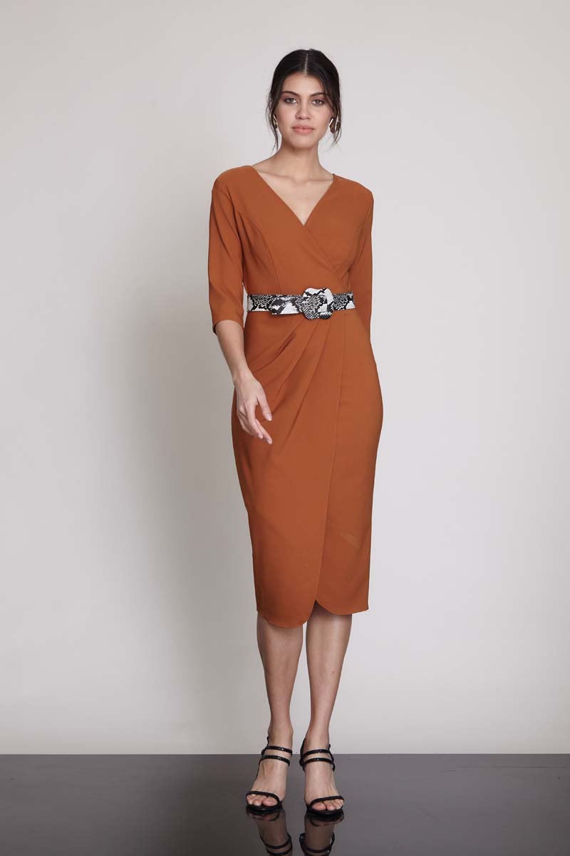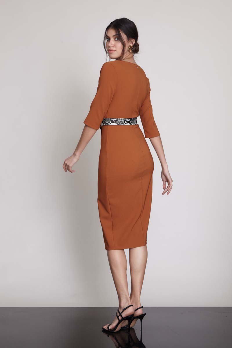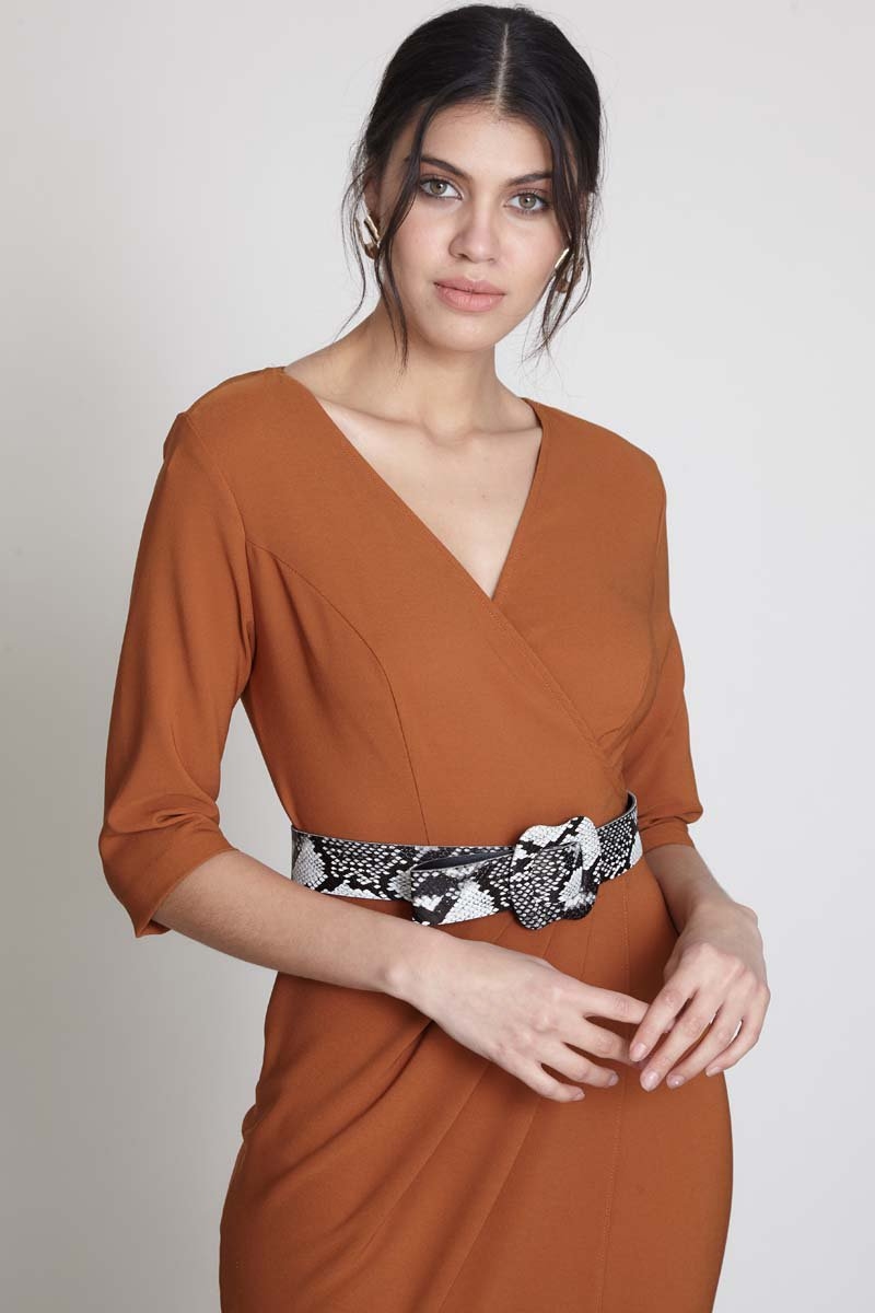 Hnedé spoločenské šaty s opaskom. Krásny kúsok z našej ponuky, ktorý očarí každú z Vás. Príjemný a mierne elastický materiál. Šaty sú z trojštvrťovým rukávom. Zapínanie je vzadu na zips, opasok s hadím vzorom je súčasťou šiat. Modelka je vysoká 175 cm a má oblečenú veľkosť 38.