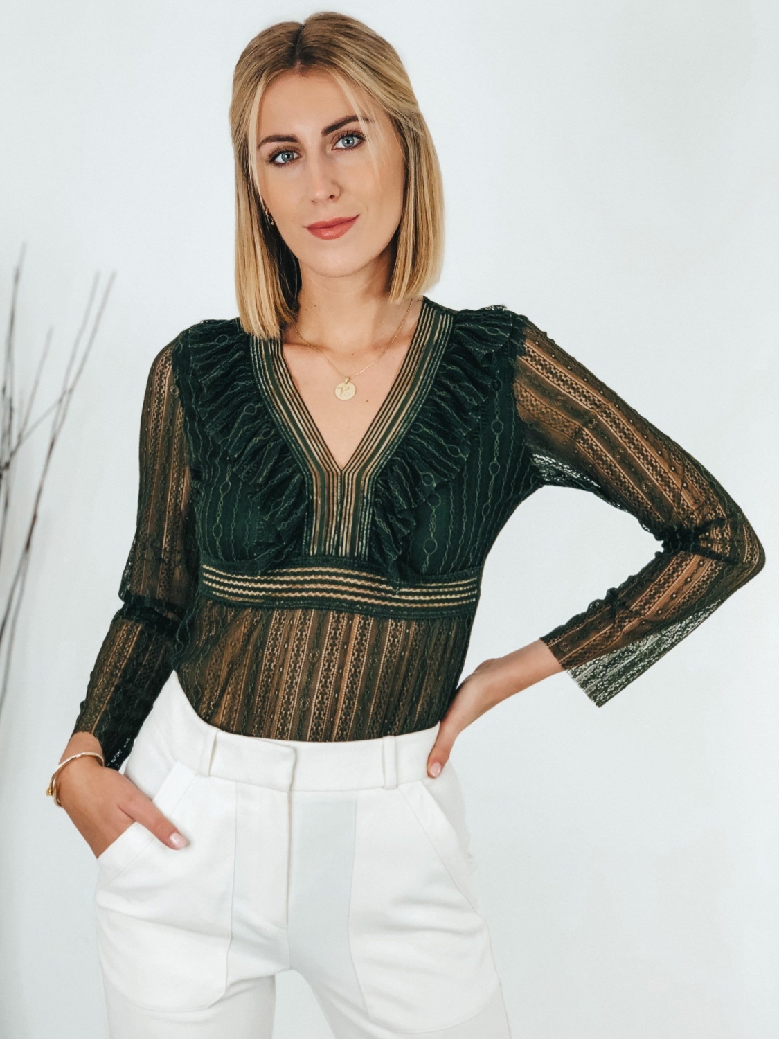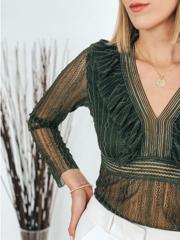 Dámske čipkované body v khaki farbe Vám zaiste vykúzli dokonalý outfit. Neveríte? Tak si ich skúste! Možnosť vrátenia do 14 dní. Tieto mega trendy body perfektne zoštíhlia postavu a Vy sa v nich budete cítiť pohodlne a sexy! Materiál je mierne elastický. Body sa zapínaju vzadu na zips a s oplnené volánikmi vo svojej prednej časti. Ak teda hľadáte niečo vkusné a elegantné, tieto body sú tou správnou voľbou. Ich kúpu určite neoľutujete, pretože si ich doladíte ku akémukoľvek outfitu. Modelka je vysoká 175 cm a oblečenú má veľkosť UNI.