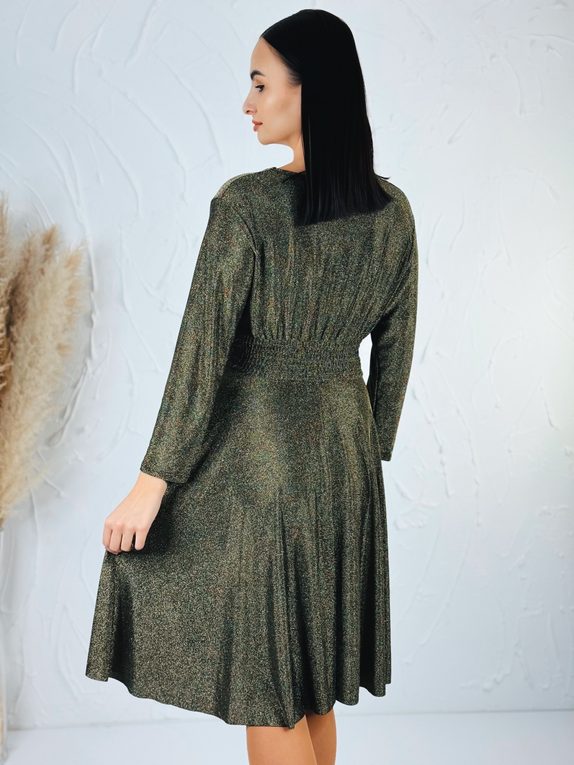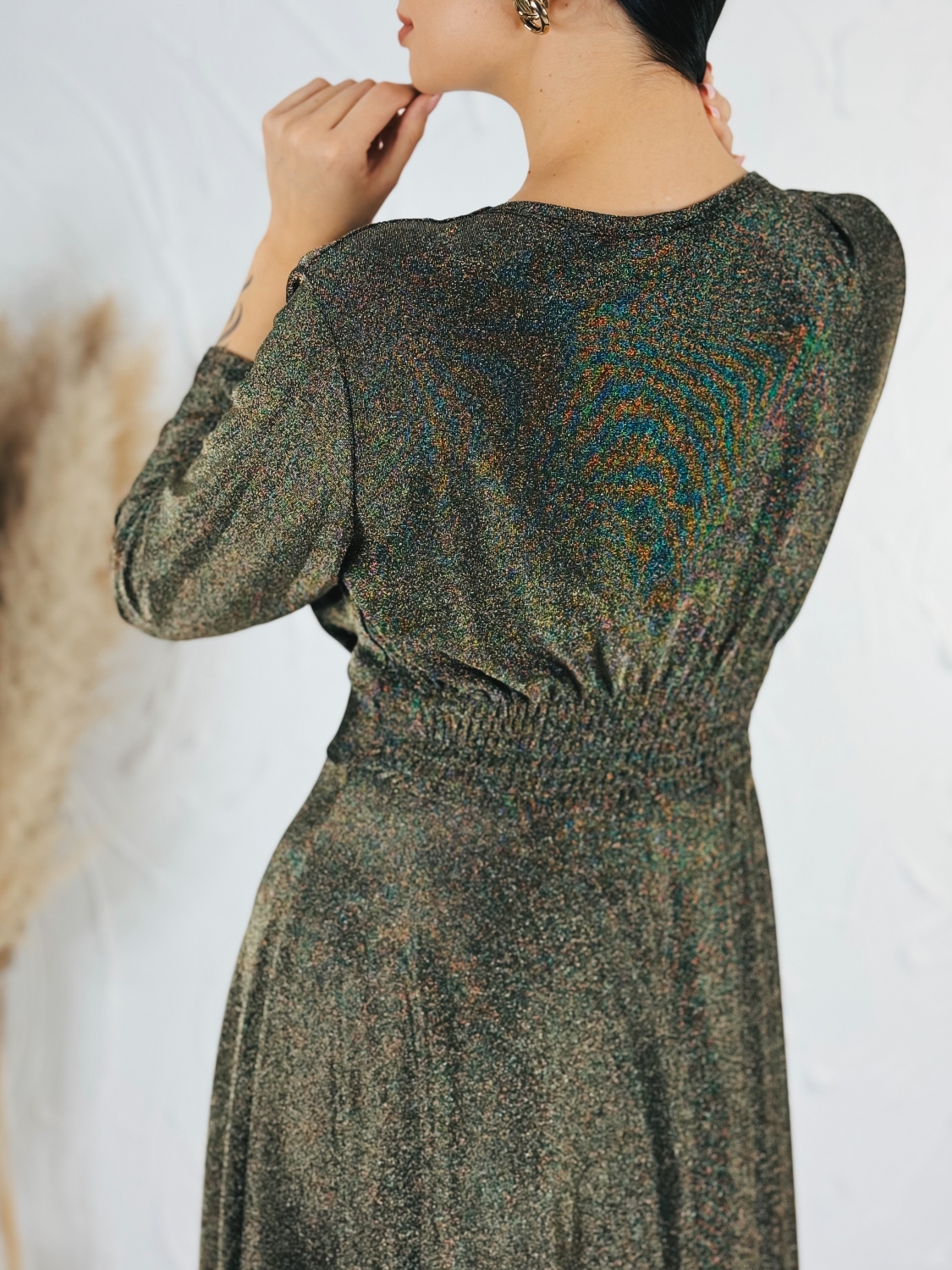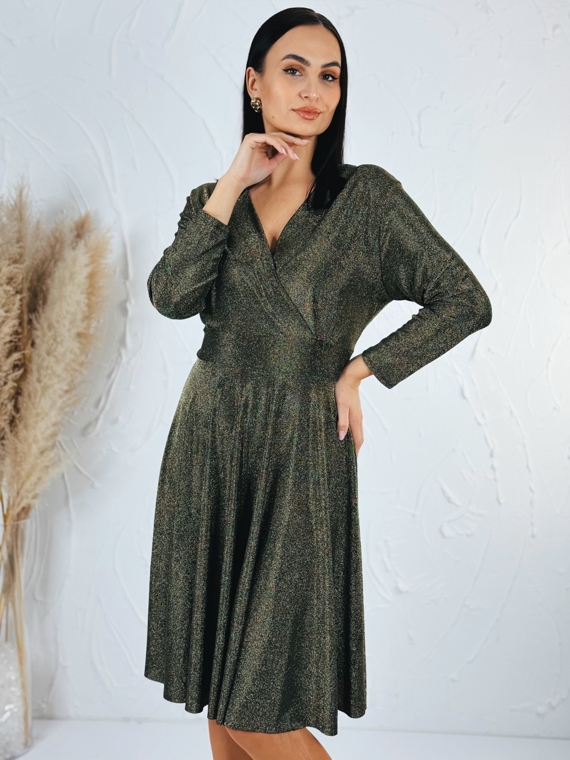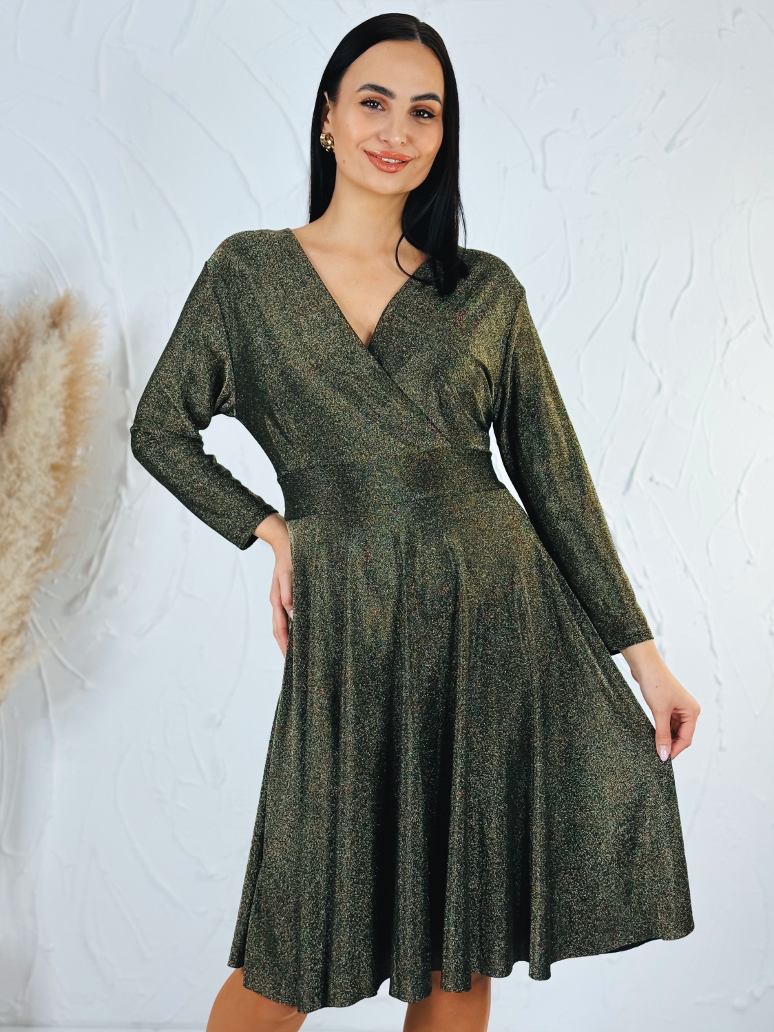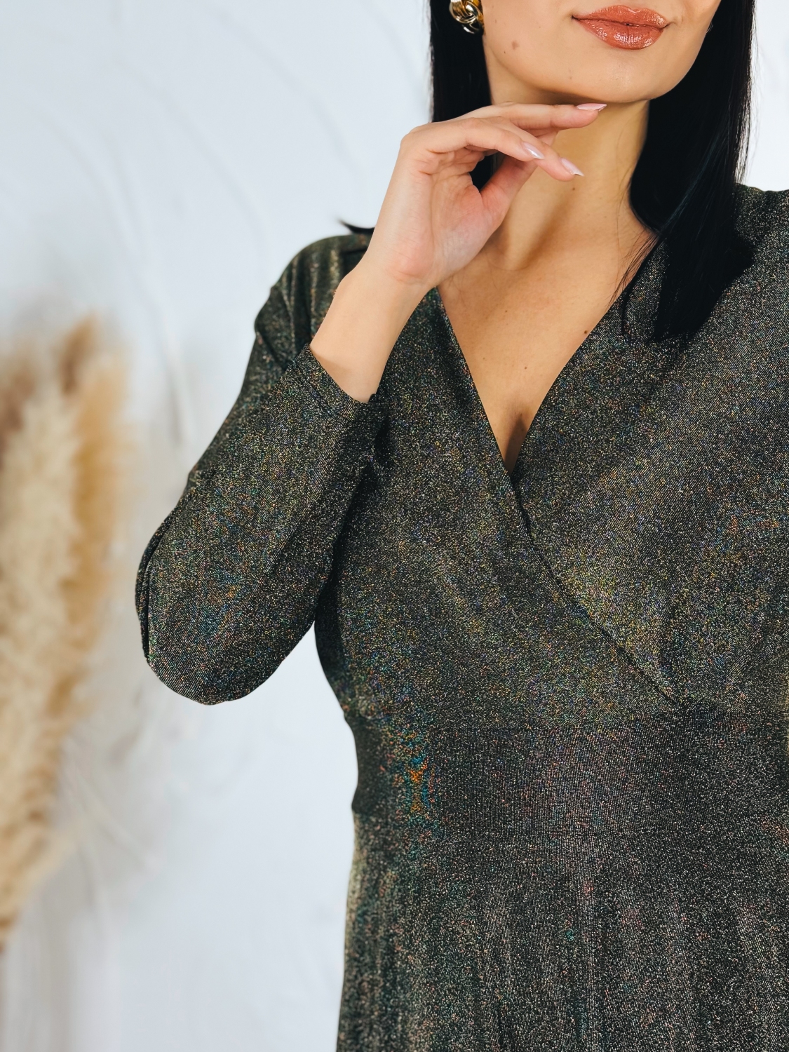 Tieto dámske trblietavé šaty sú stvorené pre ženy, ktoré chcú zažiariť a cítiť sa výnimočne pri každej príležitosti. Elegantný materiál s jemným trblietaním zachytáva svetlo z každej strany a dodáva šatám luxusný, oslňujúci vzhľad. Šaty sú navrhnuté s dôrazom na ženskú postavu – hlboký véčkový výstrih pôsobí zmyselne a zároveň elegantne, pričom jemne zvýrazňuje dekolt a pridáva sofistikovanú rafinovanosť celkovému strihu. Pružný pás je praktickým a zároveň štýlovým prvkom, ktorý opticky zoštíhľuje pás a zdôrazňuje prirodzené krivky. Vďaka voľnému, mierne áčkovému strihu sukne šaty krásne padnú na každú postavu, pohodlne sedia a diskrétne zakrývajú partie, ktoré si želáte nenápadne upriamiť pozornosť. Tento strih je obzvlášť vhodný aj pre moletky, pretože kombinuje komfort s elegantným, lichotivým dizajnom. Dĺžka šiat je premyslená tak, aby pôsobila nadčasovo a elegantne, ideálna na slávnostné večery, svadby, oslavy alebo spoločenské udalosti, kde chcete byť stredobodom pozornosti. Trblietavý efekt látky dodáva šatám jedinečný šarm a glamour pocit.