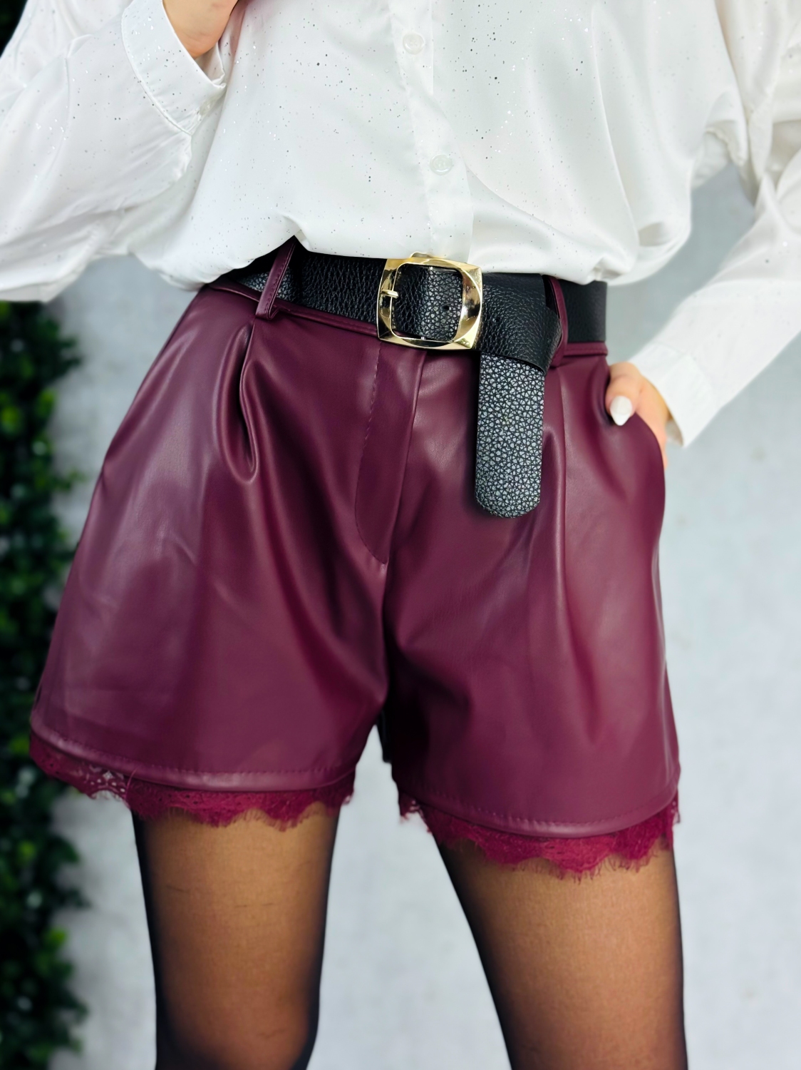 Tieto dámske koženkové kraťasy s opaskom a čipkou v spodnej časti sú dokonalým spojením moderného štýlu, ženského pôvabu a jedinečného dizajnu. Sú navrhnuté pre ženy, ktoré milujú výrazné kúsky, ktoré dodajú outfitu šmrnc a zároveň pôsobia sofistikovane a módne. Vyrobené z kvalitnej koženky, šortky ponúkajú moderný, nadčasový vzhľad a zároveň pohodlie pri nosení. Materiál je odolný, pružný a príjemný na dotyk, čo zaručuje komfort pri každom pohybe. Doplnkový opasok v páse nielenže pridáva na sofistikovanosti a elegantnom vzhľade, ale zároveň umožňuje pohodlné prispôsobenie a zvýraznenie línie pása. Tento detail dodáva šortkám nadčasový, upravený vzhľad, ktorý je vhodný pre rôzne príležitosti – od bežného nosenia cez večerné eventy až po špeciálne príležitosti, kde chcete zaujať. Veľkým a elegantným prvkom je jemná čipka v spodnej časti šortiek, ktorá dodáva modelu ženskosťa romantický nádych.