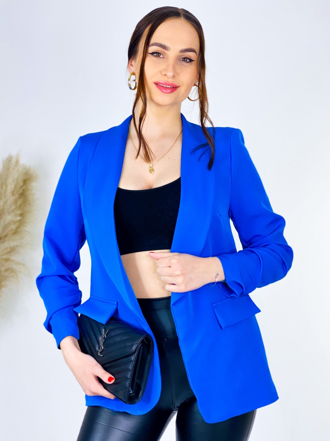 Dámske exkluzívné modré sako, ktoré je v jednoduchom prevedení a bez zapínania. Sako vhodné do práce i na rande do mesta. Zaujímavá je aj štruktúra saka, ktorá Vás dostane. Nadčasové a mimoriadne praktické. Vyrobené z kvalitného a pohodlného materiálu. Vrecká na oboch stranách sú falošné. Dámske sako nemusíte nosiť výlučne k sukni, či elegantným nohaviciam. Môžete k nemu doladiť aj ležérny outfit s teniskami. Modelka je vysoká 175 cm a oblečenú má veľkosť UNI.