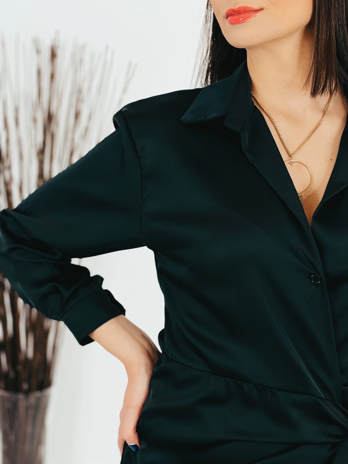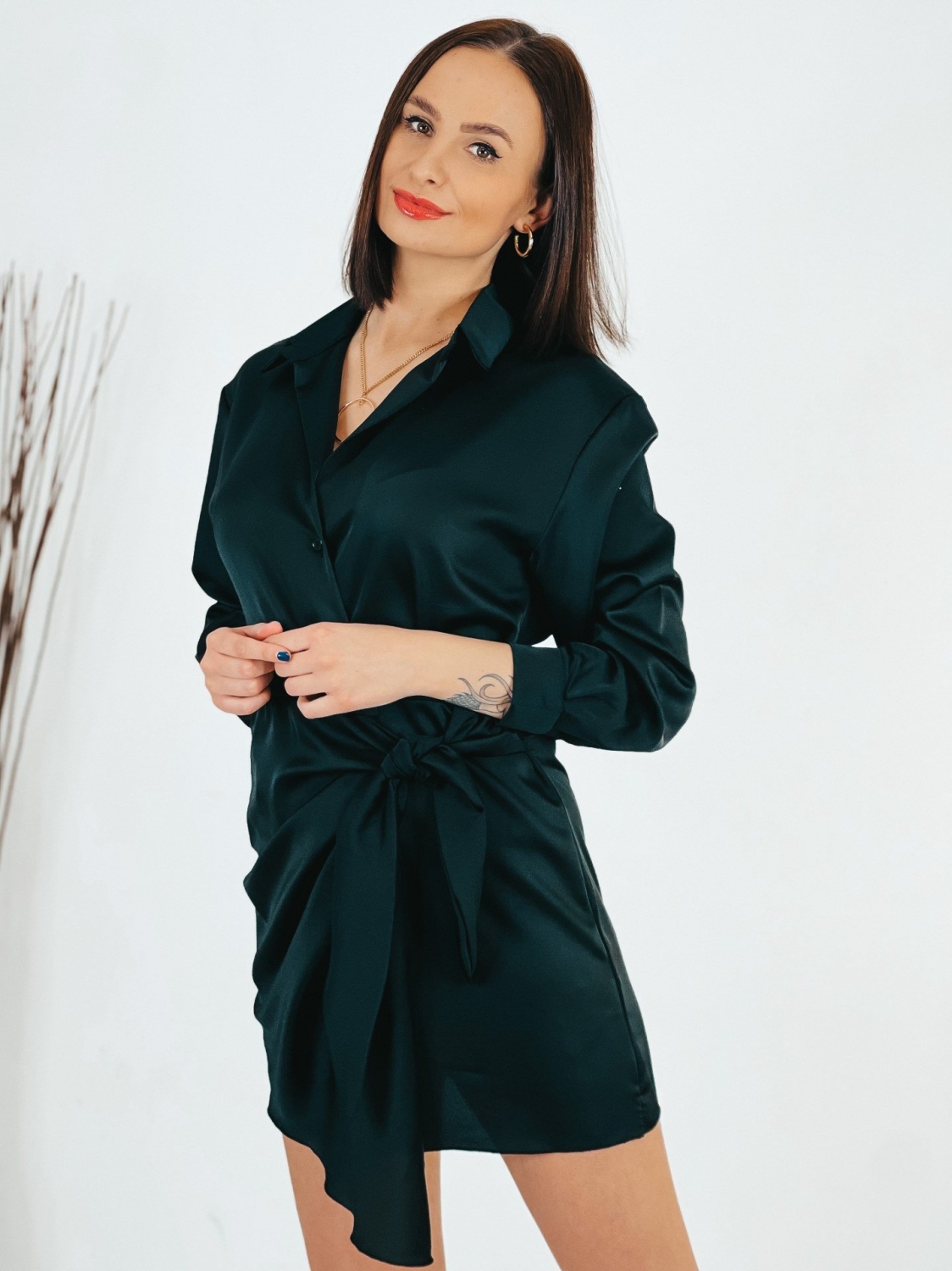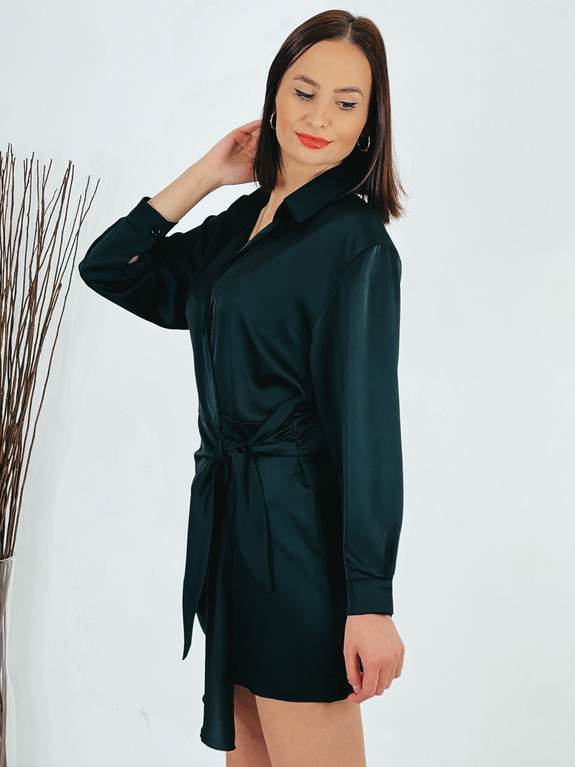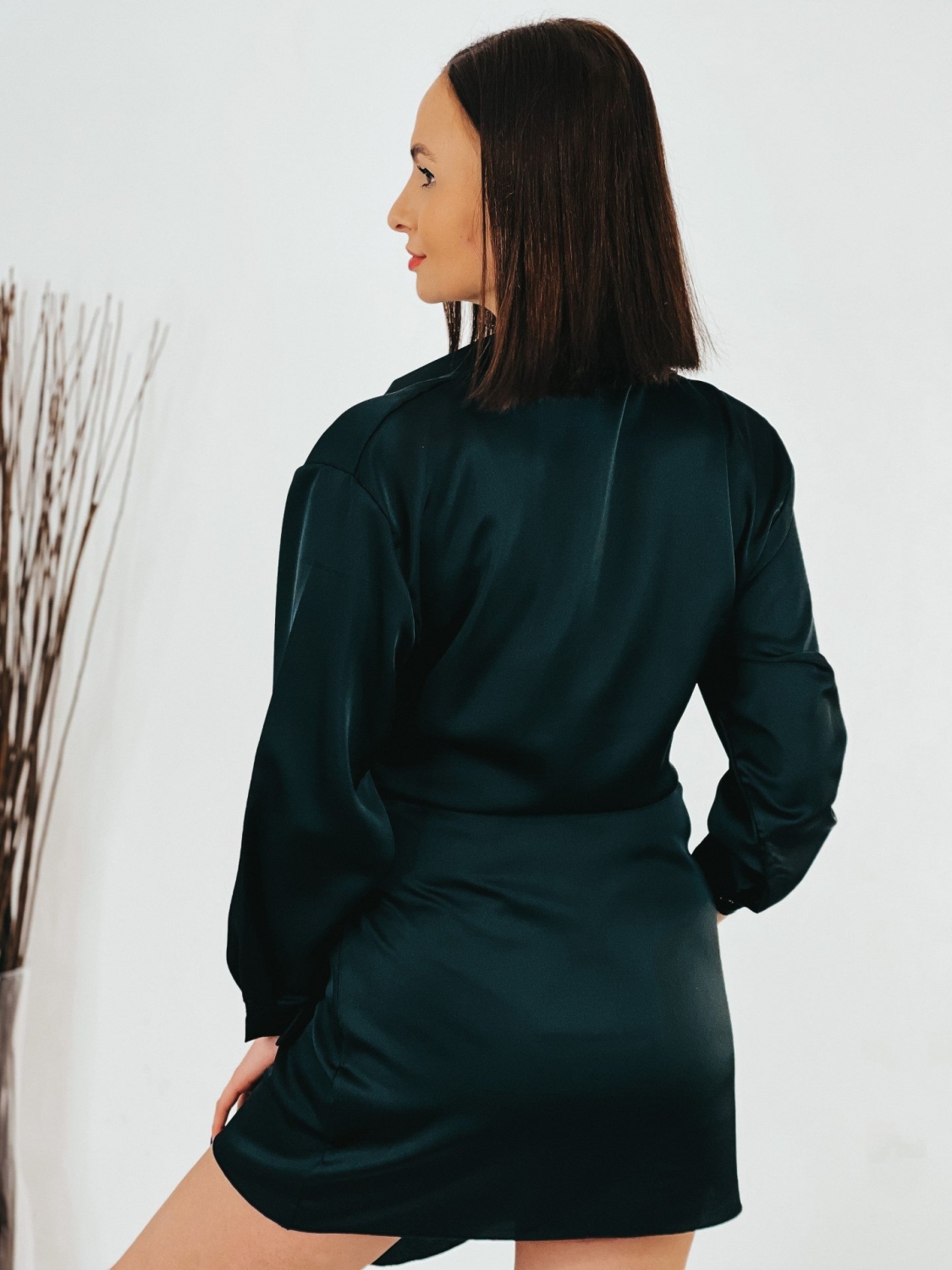 Dámske krátke čierne satenové šaty na viazanie s dlhým rukávom. Viazanie okolo pásu. Šaty sú z ľahkého a vzdušného materiálu a pri nosení Vám poskytnú maximálny komfort. Sú vhodné na spločenské akcie, ale aj na bežné nosenie. Ľahko ich skombinujete s rifľovou vestou alebo bundou. Modelka má 175 cm a oblečenú veľkosť UNI.