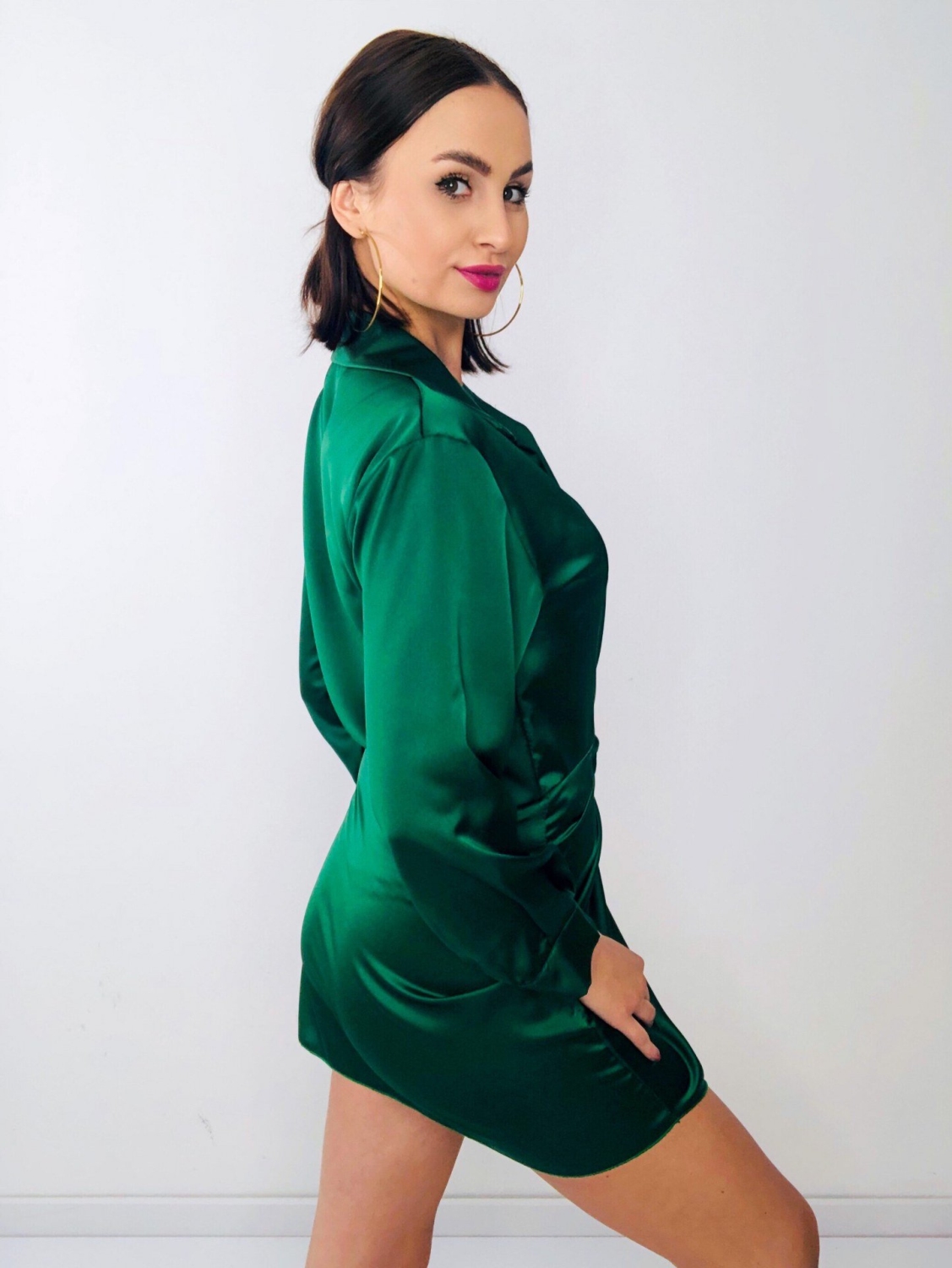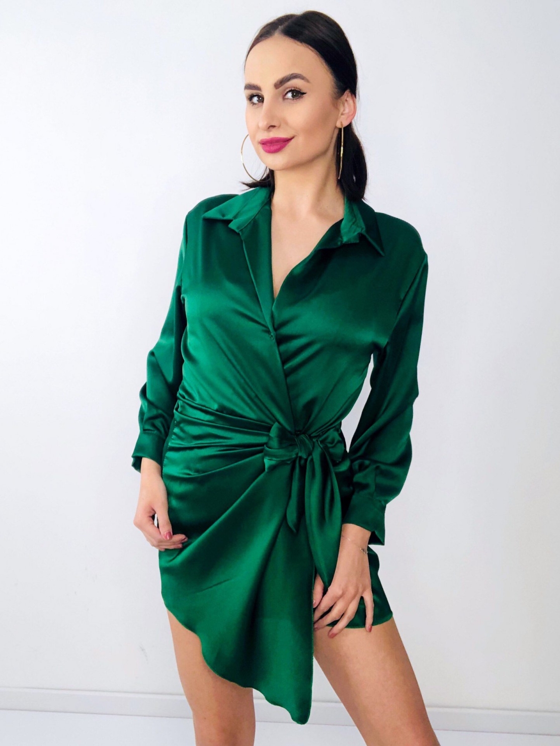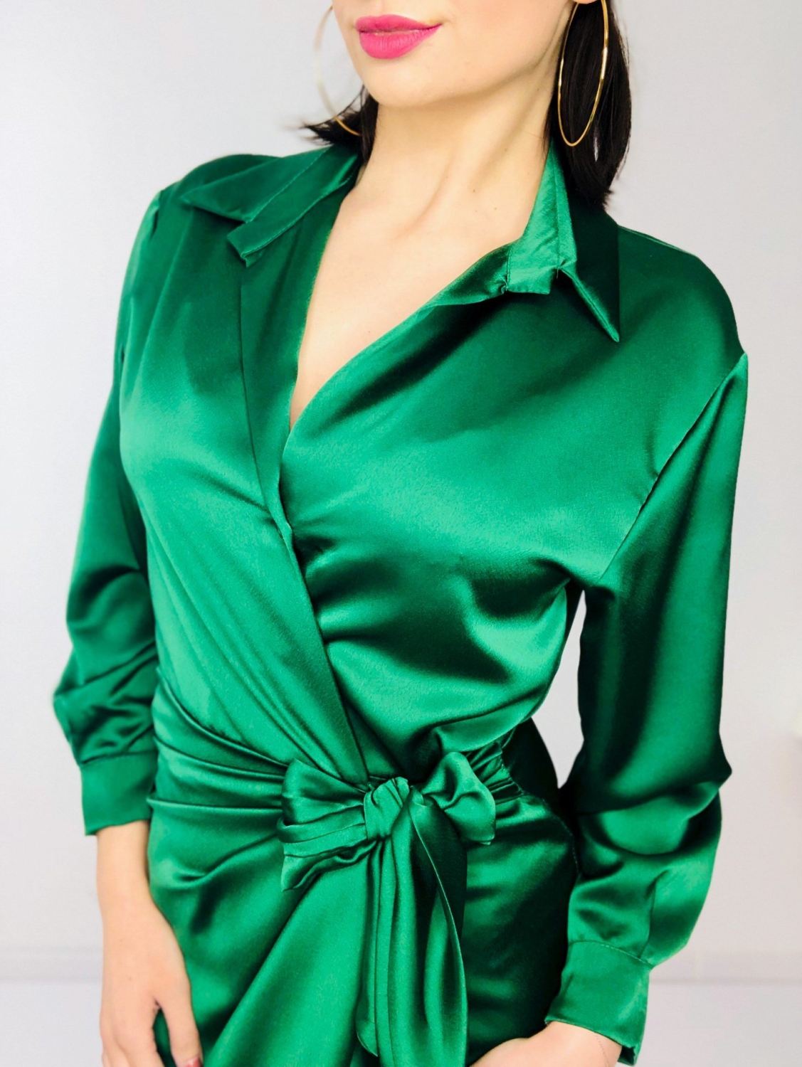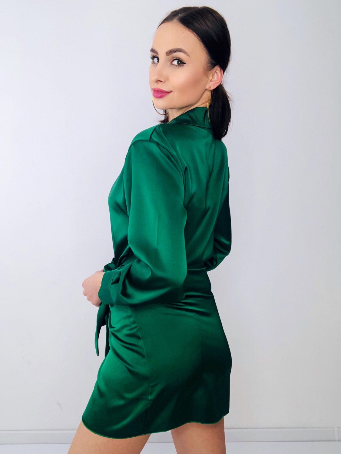 Dámske krátke zelené satenové šaty na viazanie s dlhým rukávom. Viazanie okolo pásu. Šaty sú z ľahkého a vzdušného materiálu a pri nosení Vám poskytnú maximálny komfort. Sú vhodné na spločenské akcie, ale aj na bežné nosenie. Ľahko ich skombinujete s rifľovou vestou alebo bundou. Modelka má 175 cm a oblečenú veľkosť UNI.